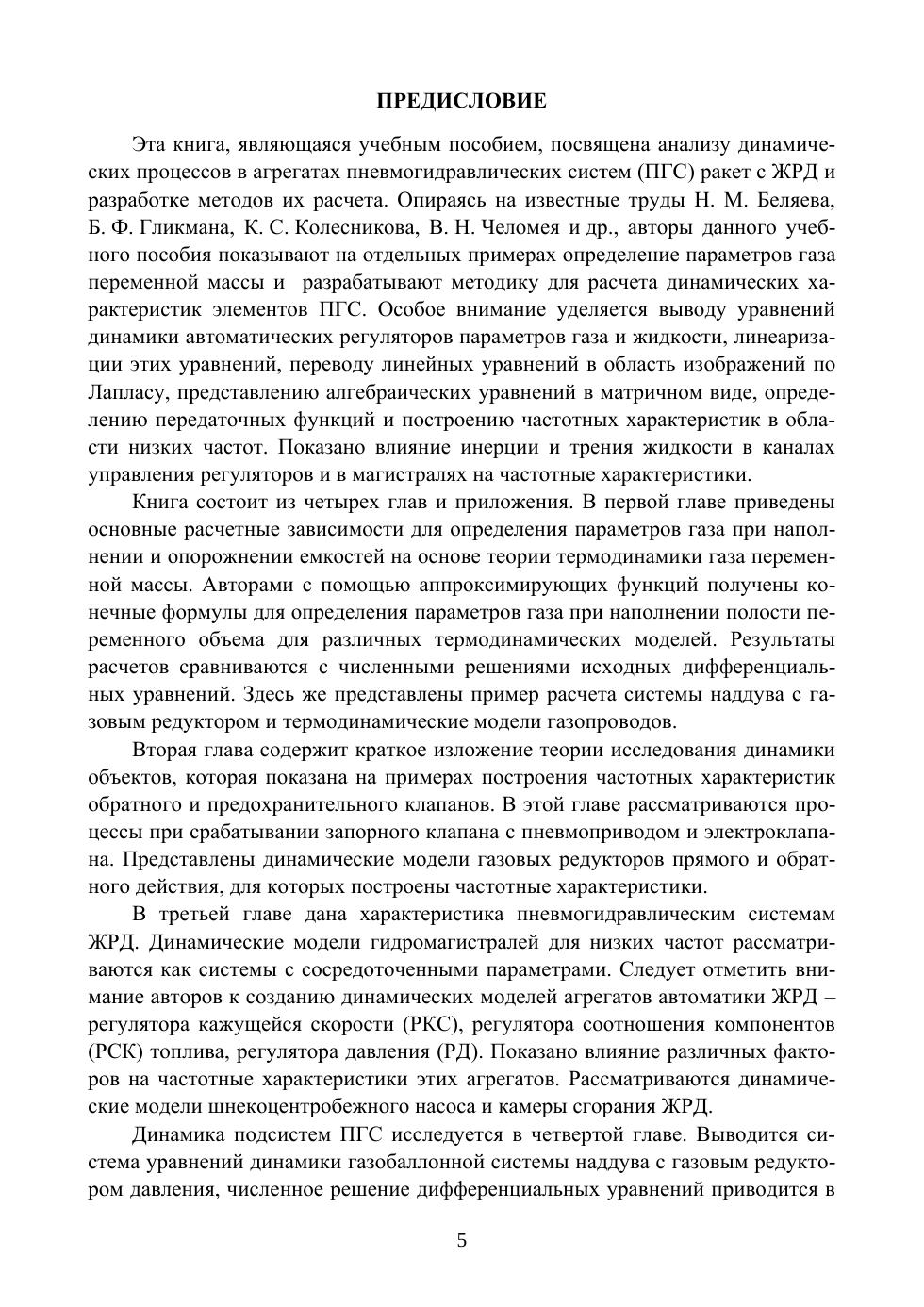 Рассмотрены газодинамические процессы в агрегатах пневмогидравлических систем ракет с ЖРД при наполнении и опорожнении емкостей, приведены расчетные зависимости для различных термодинамических моделей. Большое внимание уделено динамике основных пневмогидравлических агрегатов, для которых получены математические модели. На основе линейных уравнений построены передаточные функции, показано влияние различных параметров на частотные характеристики агрегатов. Приведены примеры расчетов в виде графиков. Предназначено для студентов, обучающихся по специальности «Проектирование, производство и эксплуатация ракет и ракетно-космических комплексов (квалификация (степень) специалист)».