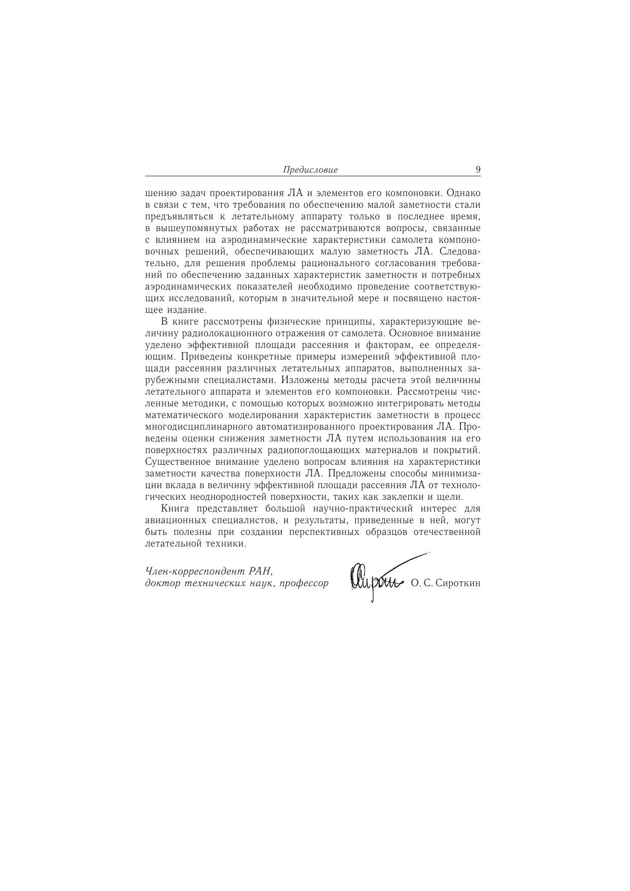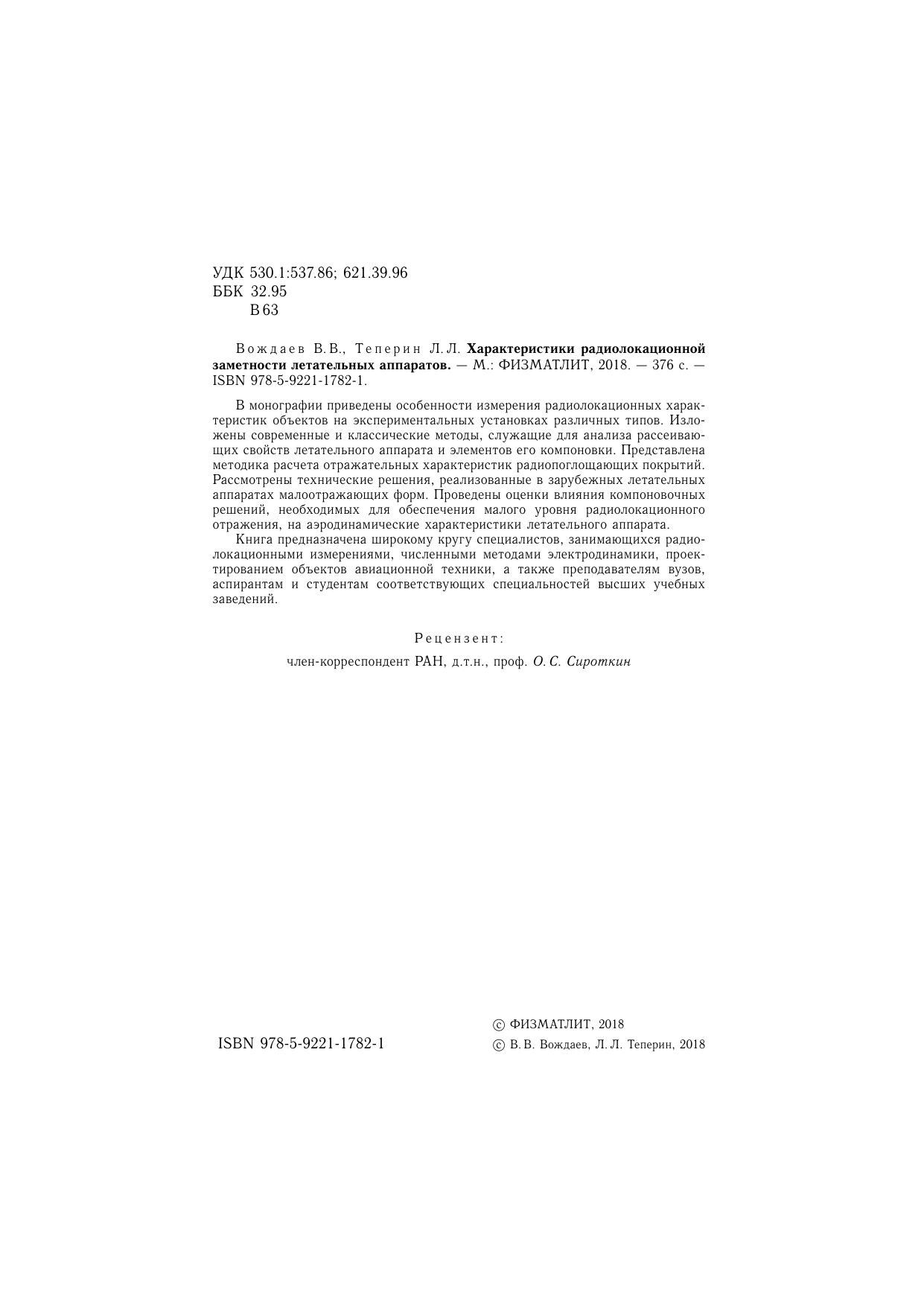В монографии приведены особенности измерения радиолокационных характеристик объектов на экспериментальных установках различных типов. Изложены современные и классические методы, служащие для анализа рассеивающих свойств летательного аппарата и элементов его компоновки. Представлена методика расчета отражательных характеристик радиопоглощающих покрытий. Рассмотрены технические решения, реализованные в зарубежных летательных аппаратах малоотражающих форм. Проведены оценки влияния компоновочных решений, необходимых для обеспечения малого уровня радиолокационного отражения, на аэродинамические характеристики летательного аппарата. Книга предназначена широкому кругу специалистов, занимающихся радиолокационными измерениями, численными методами электродинамики, проектированием объектов авиационной техники, а также преподавателям вузов, аспирантам и студентам соответствующих специальностей высших учебных заведений.