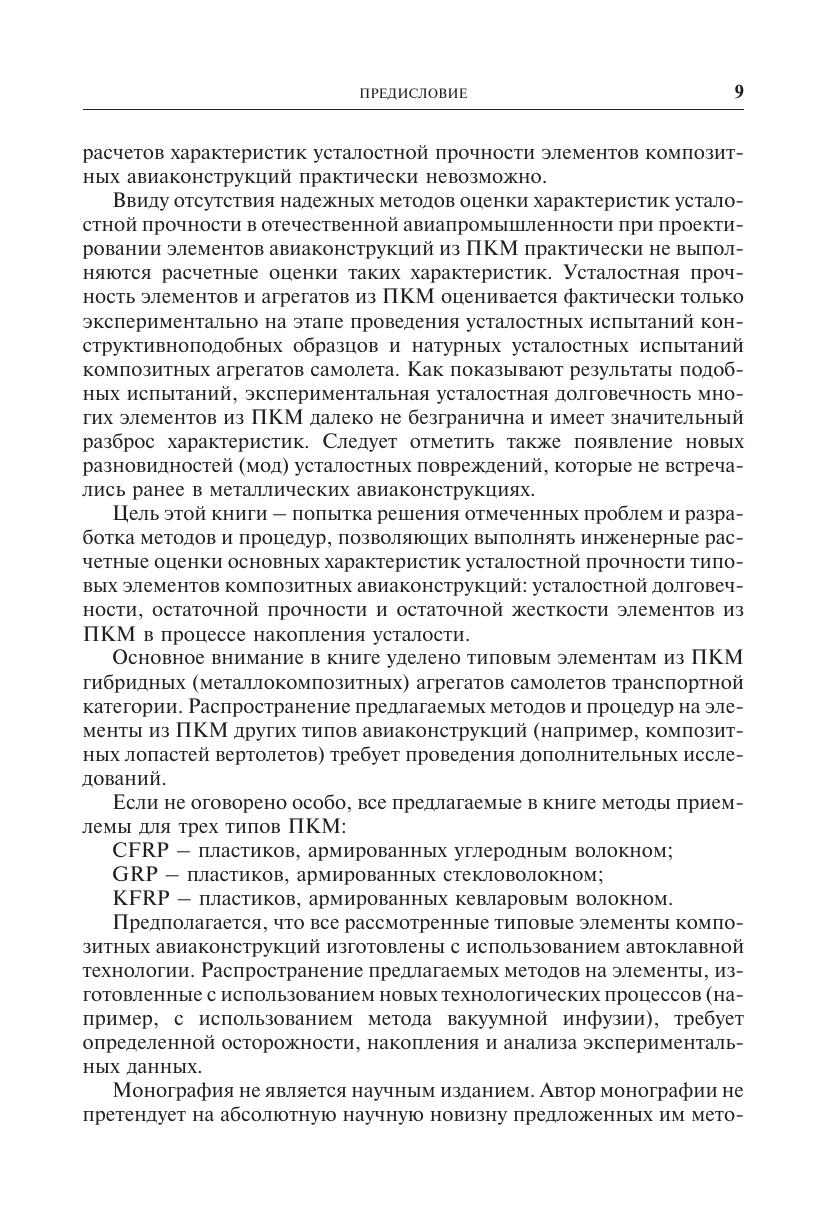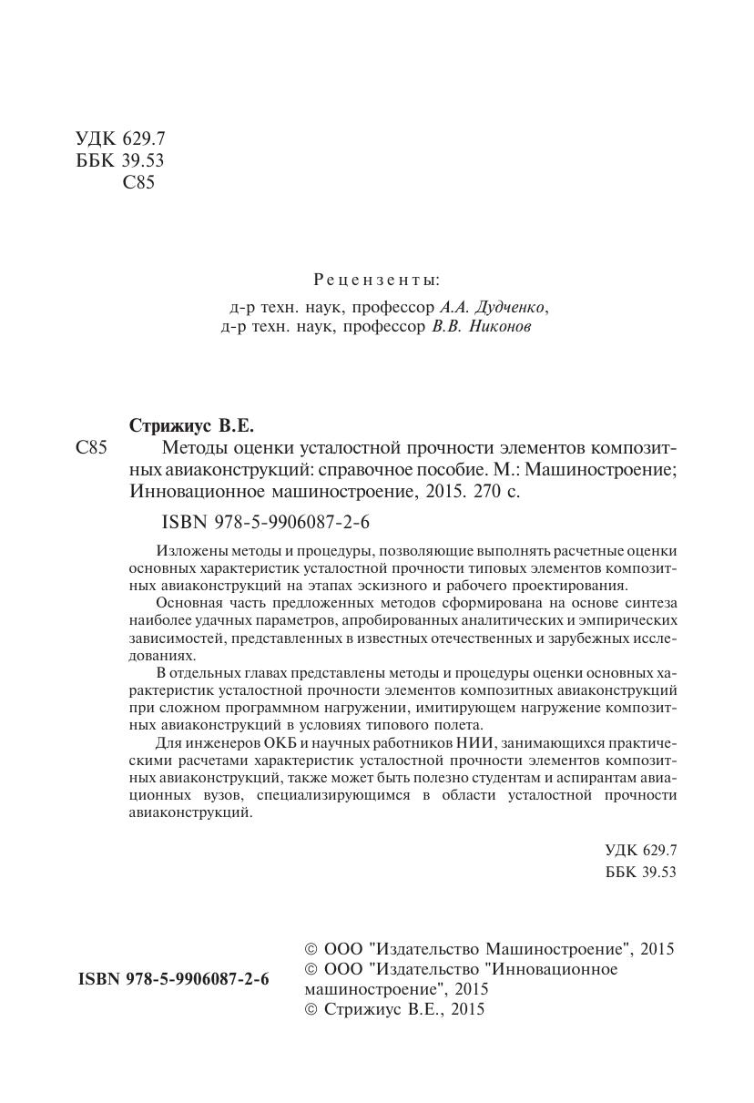 Изложеныметодыипроцедуры,позволяющиевыполнятьрасчетныеоценки основных характеристик усталостной прочности типовых элементов композитных авиаконструкций на этапах эскизного и рабочего проектирования. Основная часть предложенных методов сформирована на основе синтеза наиболее удачных параметров, апробированных аналитических и эмпирических зависимостей, представленных в известных отечественных и зарубежных исследованиях. В отдельных главах представлены методы и процедуры оценки основных характеристик усталостной прочности элементов композитных авиаконструкций при сложном программном нагружении, имитирующем нагружение композитных авиаконструкций в условиях типового полета. Для инженеров ОКБ и научных работников НИИ, занимающихся практическими расчетами характеристик усталостной прочности элементов композитных авиаконструкций, также может быть полезно студентам и аспирантам авиационных вузов, специализирующимся в области усталостной прочности авиаконструкций.