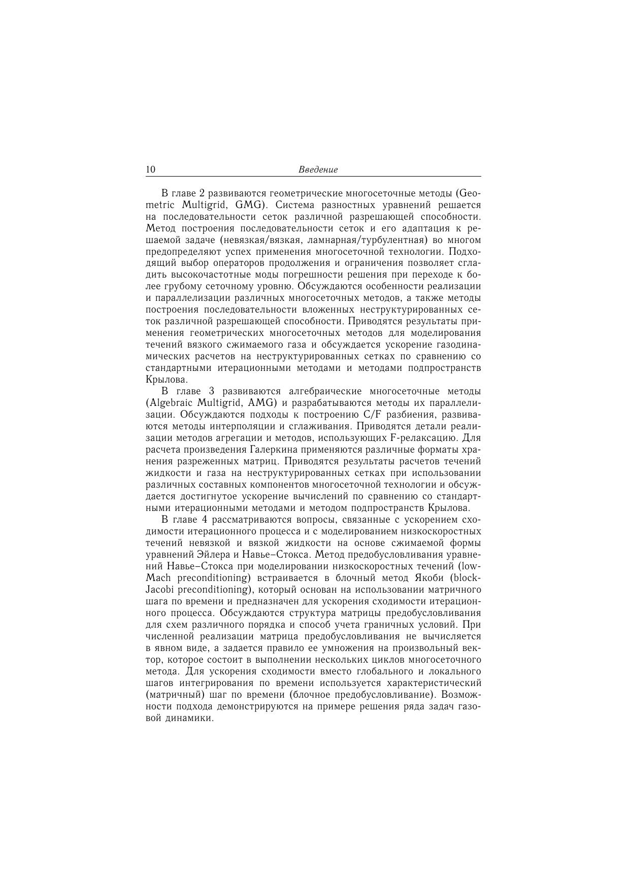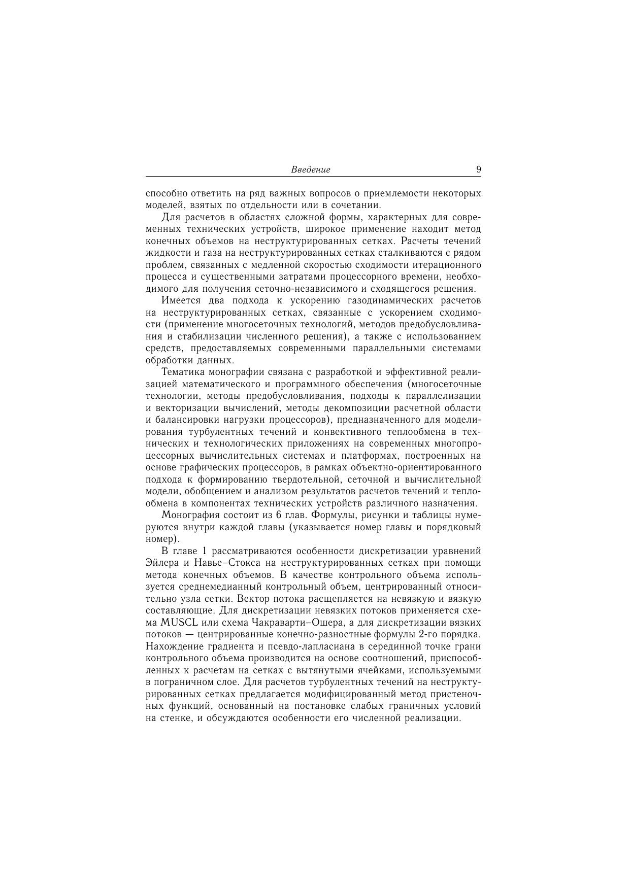 Развиваются методы ускорения сходимости итерационного процесса, основанные на использовании геометрических и алгебраических многосеточных технологий, предобусловливании уравнений Навье-Стокса при моделировании низкоскоростных течений и модификации метода пристеночных функций в расчетах турбулентных течений. Обсуждаются методы ускорения газодинамических расчетов с помощью параллелизации и векторизации вычислений на массивно-параллельных компьютерах и графических процессорах общего назначения, а также методы декомпозиции расчетной области и методы балансировки нагрузки процессоров. Для специалистов в области механики жидкости и газа, вычислительной газовой динамики, аэрокосмической техники и энергомашиностроения, а также для магистрантов и аспирантов соответствующих специальностей.