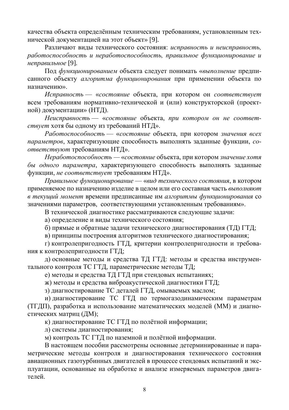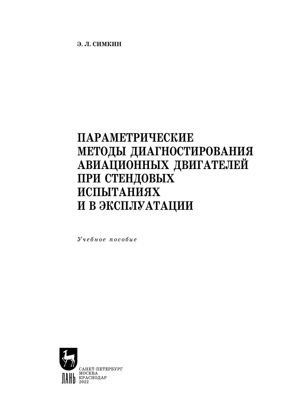 Изложены основные детерминированные и статистические параметрические методы контроля и диагностирования технического состояния авиационных газотурбинных двигателей в процессе стендовых испытаний и эксплуатации, основанные на обработке и анализе измеряемых параметров двигателей. Рассмотрены общие вопросы технического контроля и технической диагностики авиационных двигателей, задачи технической диагностики ГТД и методы их решения.