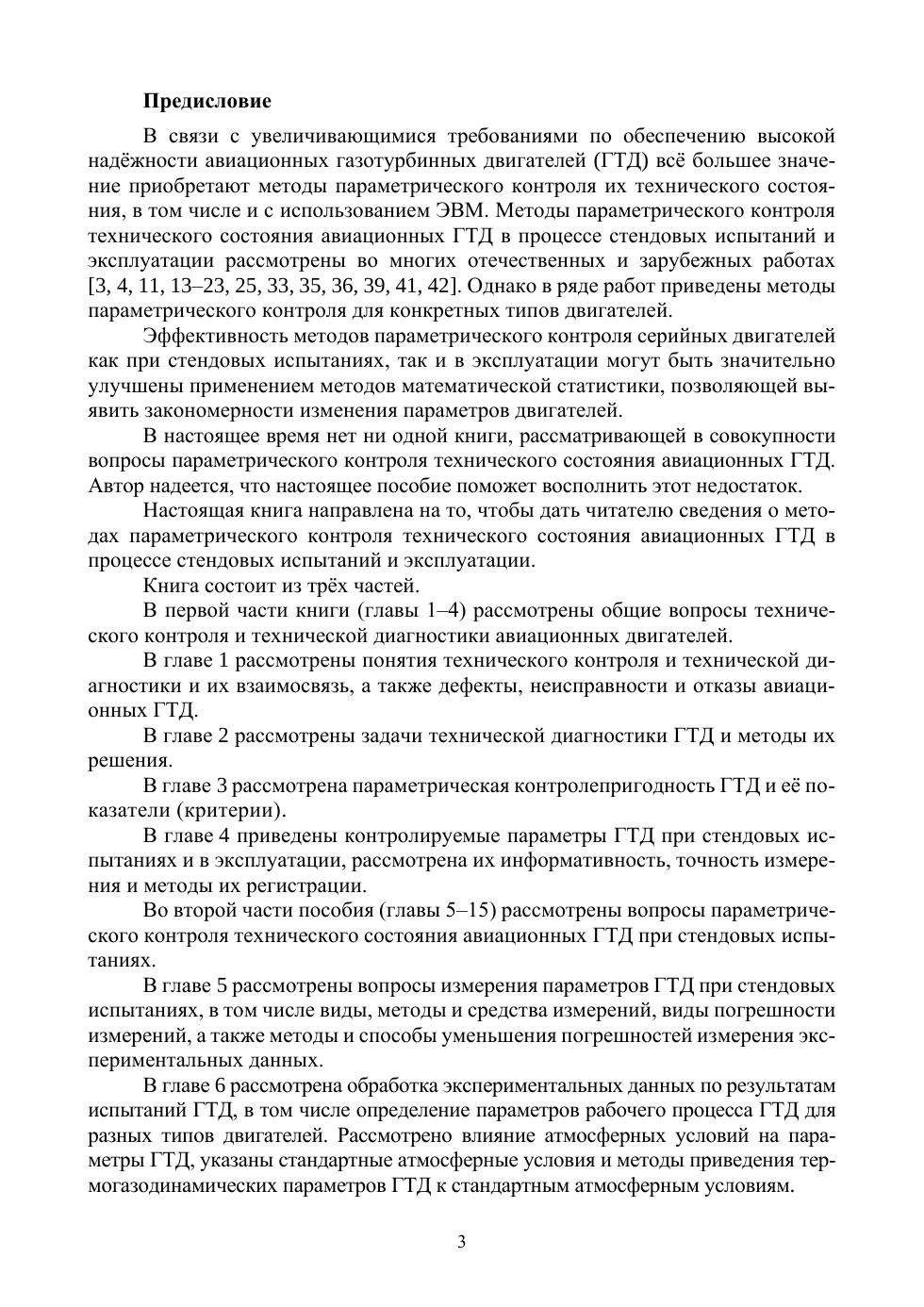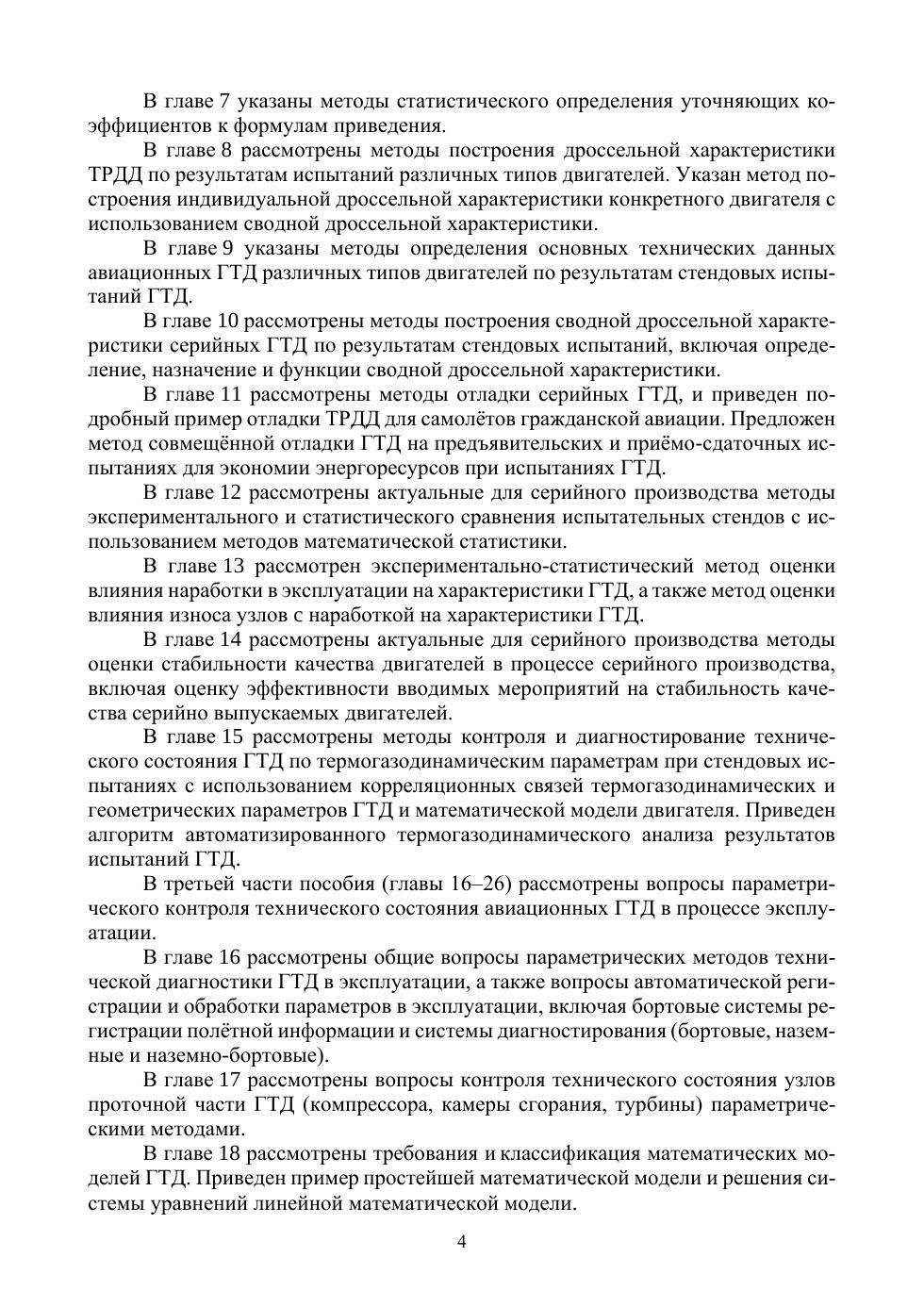 Применительно к стендовым испытаниям рассмотрены вопросы измерения параметров ГТД при испытаниях, оценки и повышения точности измерения параметров, обработки экспериментальных данных по результатам испытаний, экспериментальные и статистические методы учёта влияния атмосферных условий, методы построения сводной дроссельной характеристики ГТД и дроссельной характеристики конкретного экземпляра ГТД по результатам испытаний, методы экспериментального и статистического сравнения испытательных стендов, экспериментально-статистическая оценка влияния наработки в эксплуатации на характеристики ГТД, методы статистической оценки стабильности качества двигателей в процессе серийного производства, методы контроля и диагностирования технического состояния ГТД по термогазодинамическим параметрам.
