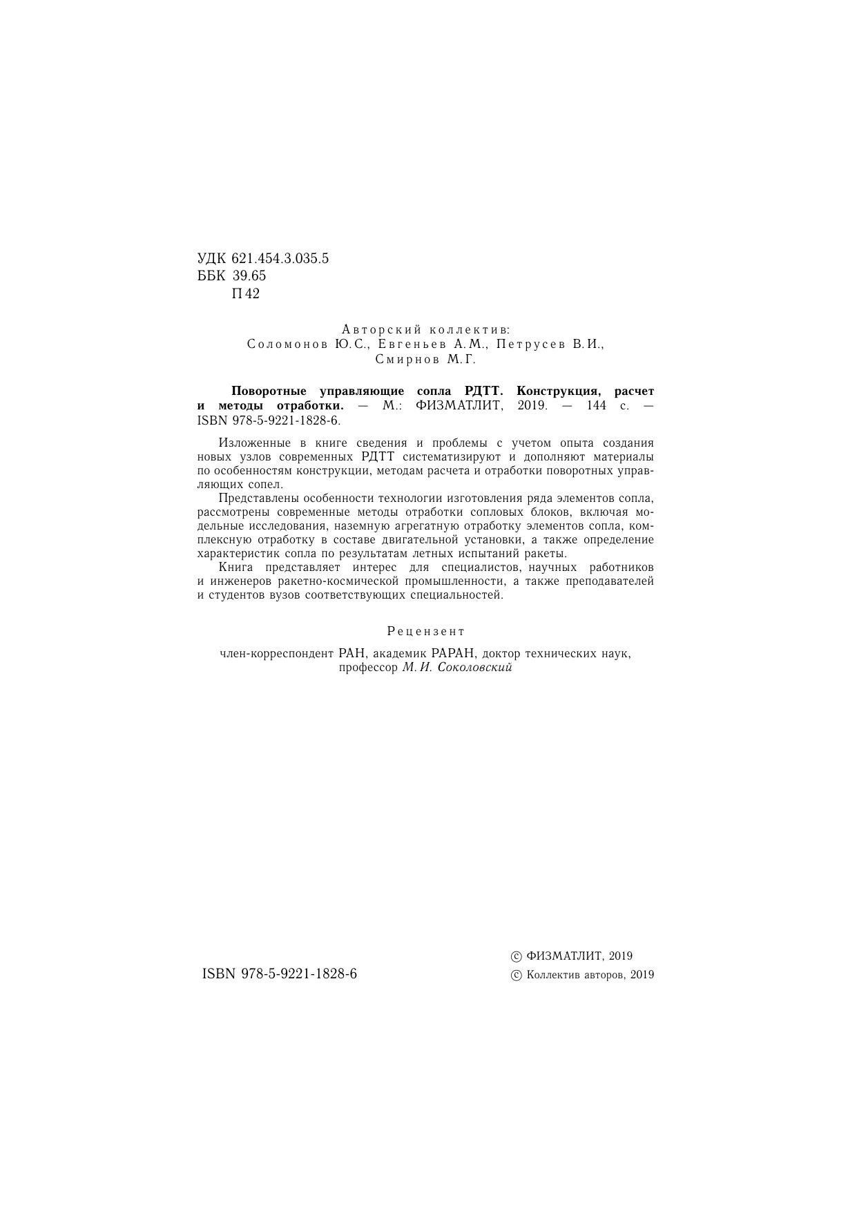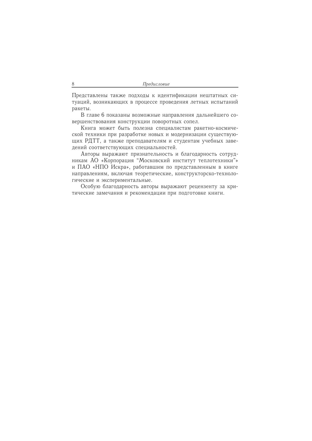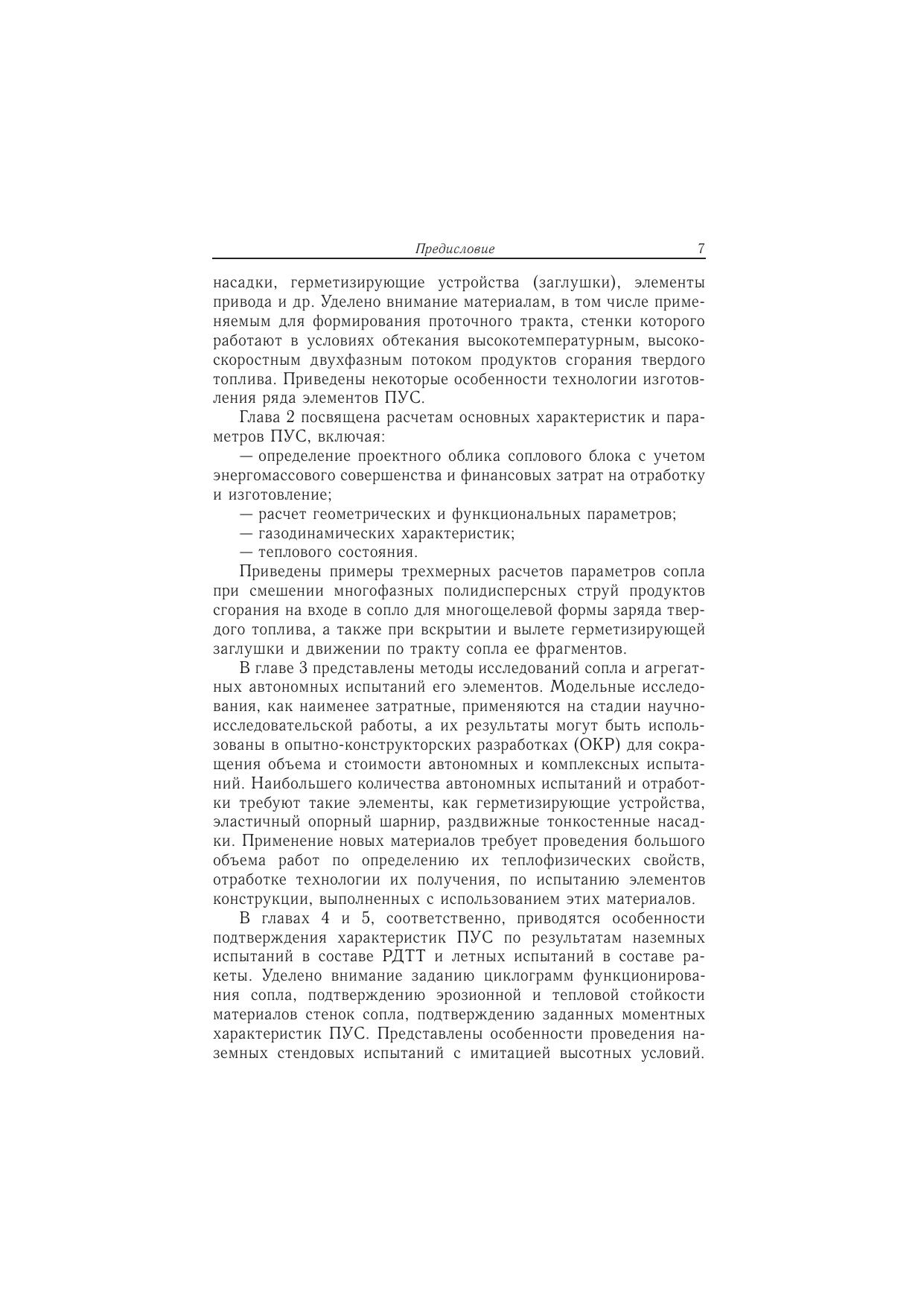 Изложенные в книге сведения и проблемы с учетом опыта создания новых узлов современных РДТТ систематизируют и дополняют материалы по особенностям конструкции, методам расчета и отработки поворотных управляющих сопел. Представлены особенности технологии изготовления ряда элементов сопла, рассмотрены современные методы отработки сопловых блоков, включая модельные исследования, наземную агрегатную отработку элементов сопла, комплексную отработку в составе двигательной установки, а также определение характеристик сопла по результатам летных испытаний ракеты. Книга представляет интерес для специалистов, научных работников и инженеров ракетно-космической промышленности, а также преподавателей и студентов вузов соответствующих специальностей