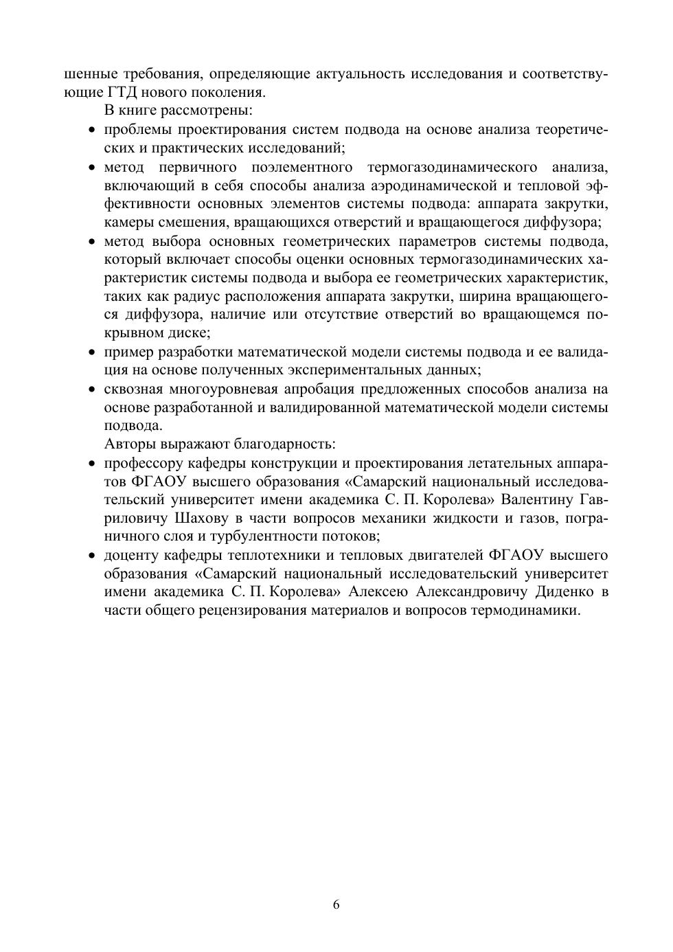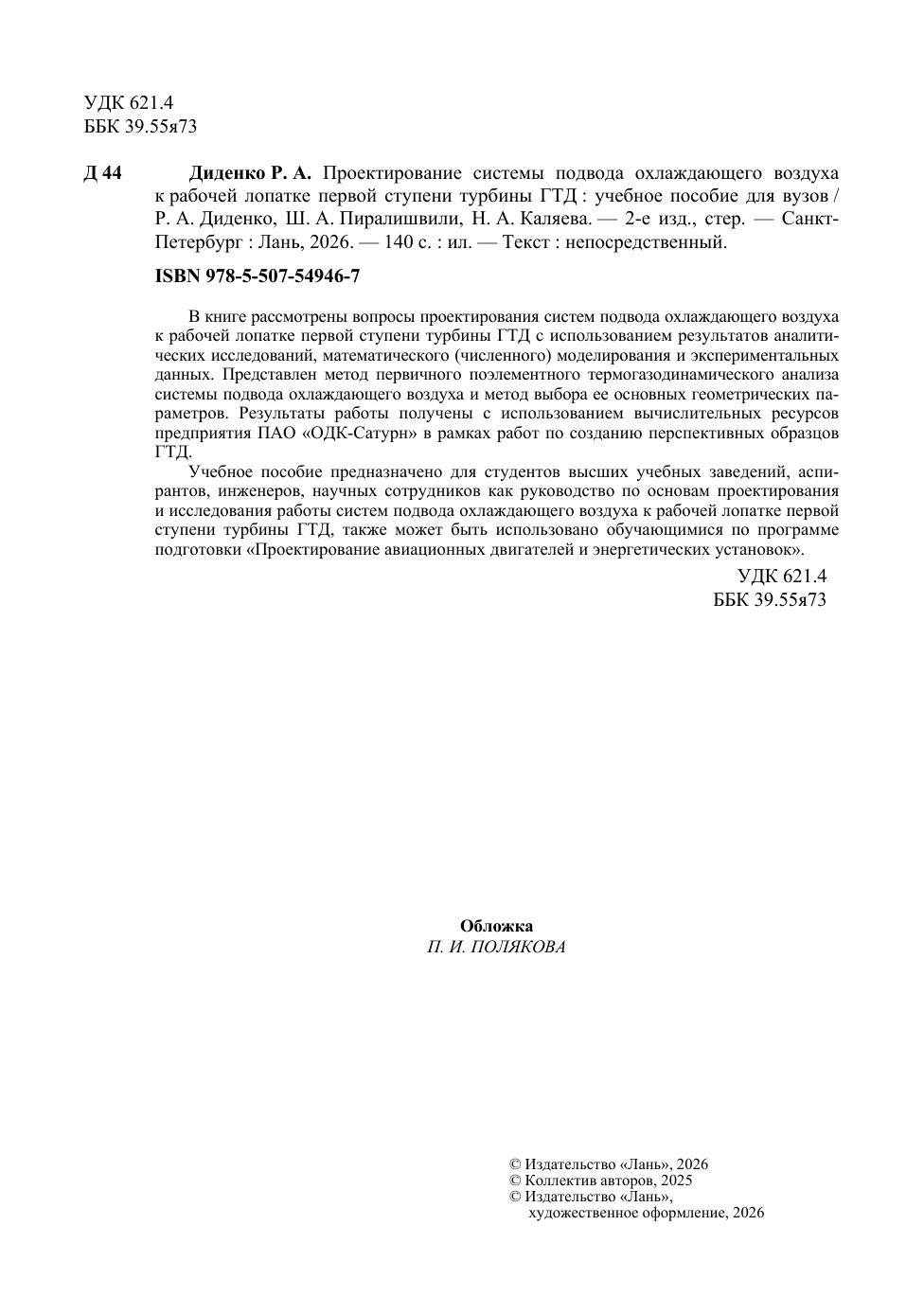 В книге рассмотрены вопросы проектирования систем подвода охлаждающего воздуха к рабочей лопатке первой ступени турбины ГТД с использованием результатов аналитических исследований, математического (численного) моделирования и экспериментальных данных. Представлен метод первичного поэлементного термогазодинамического анализа системы подвода охлаждающего воздуха и метод выбора ее основных геометрических параметров. Результаты работы получены с использованием вычислительных ресурсов предприятия ПАО «ОДК-Сатурн» в рамках работ по созданию перспективных образцов ГТД. Учебное пособие предназначено для студентов высших учебных заведений, аспирантов, инженеров, научных сотрудников как руководство по основам проектирования и исследования работы систем подвода охлаждающего воздуха к рабочей лопатке первой ступени турбины ГТД, также может быть использовано обучающимися по программе подготовки «Проектирование авиационных двигателей и энергетических установок».