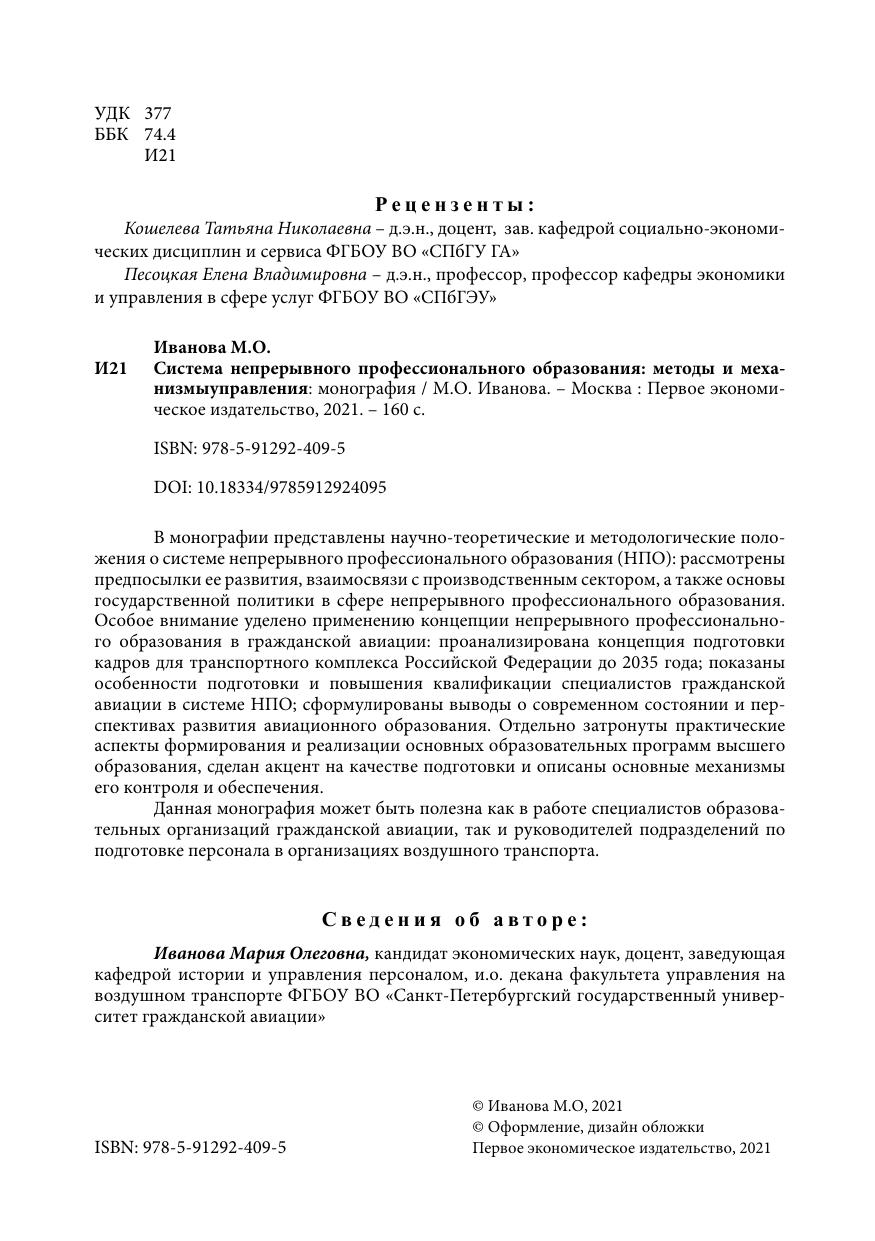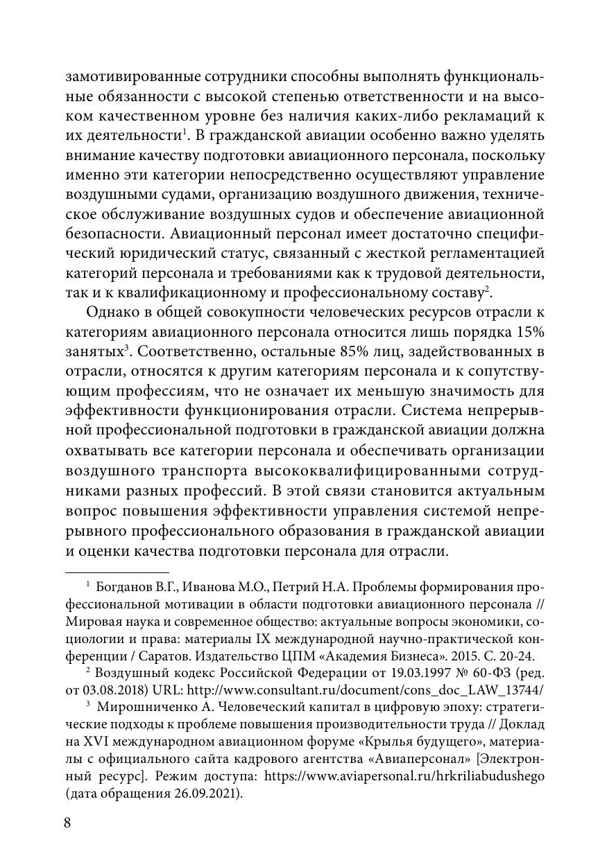В монографии представлены научно-теоретические и методологические положения о системе непрерывного профессионального образования (НПО): рассмотрены предпосылки ее развития, взаимосвязи с производственным сектором, а также основы государственной политики в сфере непрерывного профессионального образования. Особое внимание уделено применению концепции непрерывного профессионального образования в гражданской авиации: проанализирована концепция подготовки кадров для транспортного комплекса Российской Федерации до 2035 года; показаны особенности подготовки и повышения квалификации специалистов гражданской авиации в системе НПО; сформулированы выводы о современном состоянии и перспективах развития авиационного образования. Отдельно затронуты практические аспекты формирования и реализации основных образовательных программ высшего образования, сделан акцент на качестве подготовки и описаны основные механизмы его контроля и обеспечения. Данная монография может быть полезна как в работе специалистов образовательных организаций гражданской авиации, так и руководителей подразделений по подготовке персонала в организациях воздушного транспорта.