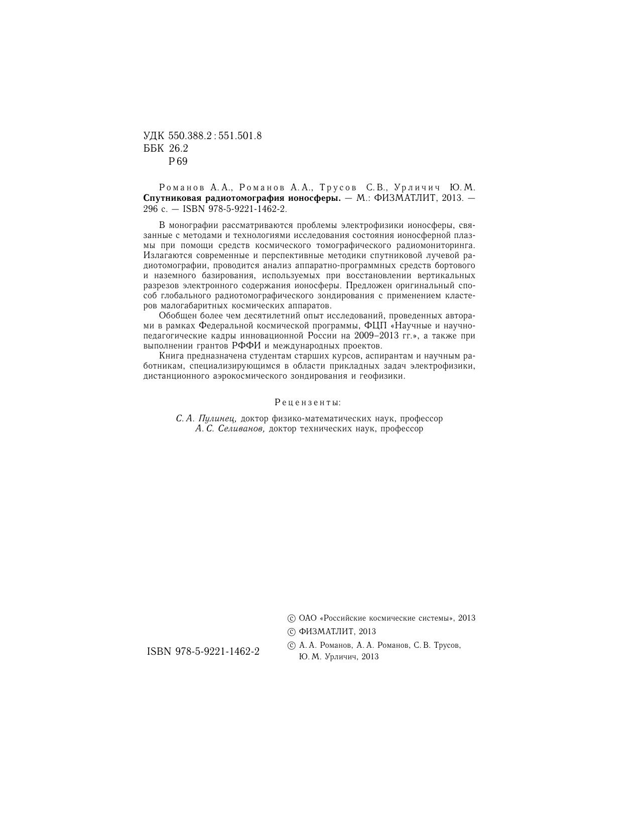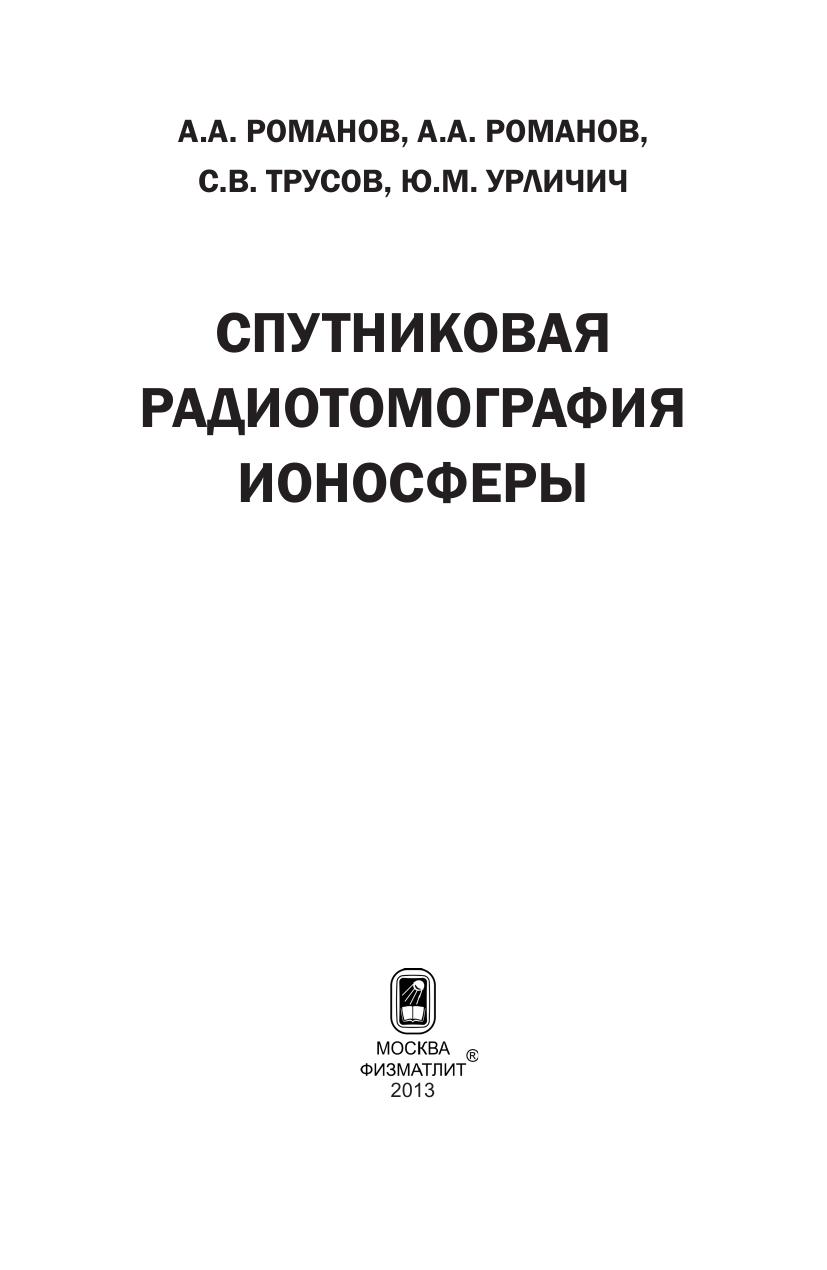 В монографии рассматриваются проблемы электрофизики ионосферы, связанные с методами и технологиями исследования состояния ионосферной плазмы при помощи средств космического томографического радиомониторинга. Излагаются современные и перспективные методики спутниковой лучевой радиотомографии, проводится анализ аппаратно-программных средств бортового и наземного базирования, используемых при восстановлении вертикальных разрезов электронного содержания ионосферы. Предложен оригинальный способ глобального радиотомографического зондирования с применением кластеров малогабаритных космических аппаратов. Обобщен более чем десятилетний опыт исследований, проведенных авторами в рамках Федеральной космической программы, ФЦП «Научные и научно-педагогические кадры инновационной России на 2009–2013 гг.», а также при выполнении грантов РФФИ и международных проектов. Книга предназначена студентам старших курсов, аспирантам и научным работникам, специализирующимся в области прикладных задач электрофизики, дистанционного аэрокосмического зондирования и геофизики.