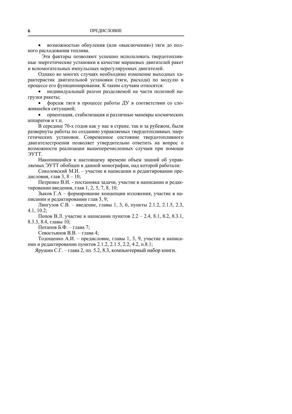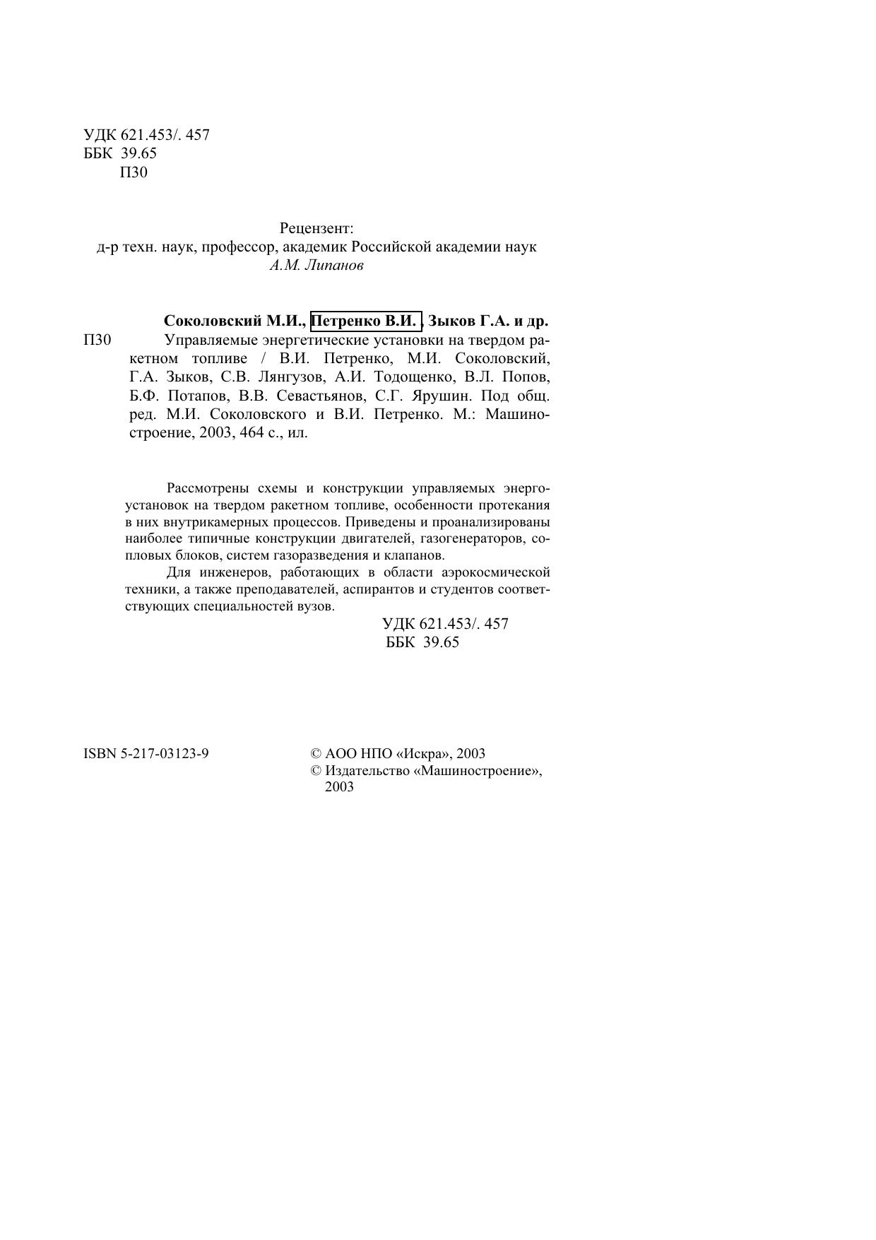 Рассмотрены схемы и конструкции управляемых энергоустановок на твердом ракетном топливе, особенности протекания в них внутрикамерных процессов. Приведены и проанализированы наиболее типичные конструкции двигателей, газогенераторов, сопловых блоков, систем газоразведения и клапанов. Для инженеров, работающих в области аэрокосмической техники, а также преподавателей, аспирантов и студентов соответствующих специальностей вузов.