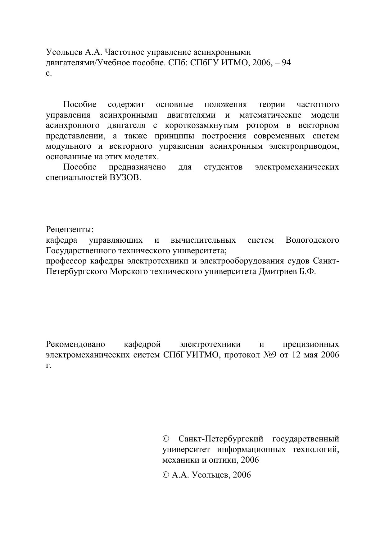 Пособие содержит основные положения теории частотного управления асинхронными двигателями и математические модели асинхронного двигателя с короткозамкнутым ротором в векторном представлении, а также принципы построения современных систем модульного и векторного управления асинхронным электроприводом, основанные на этих моделях. Пособие предназначено для студентов электромеханических специальностей ВУЗОВ.