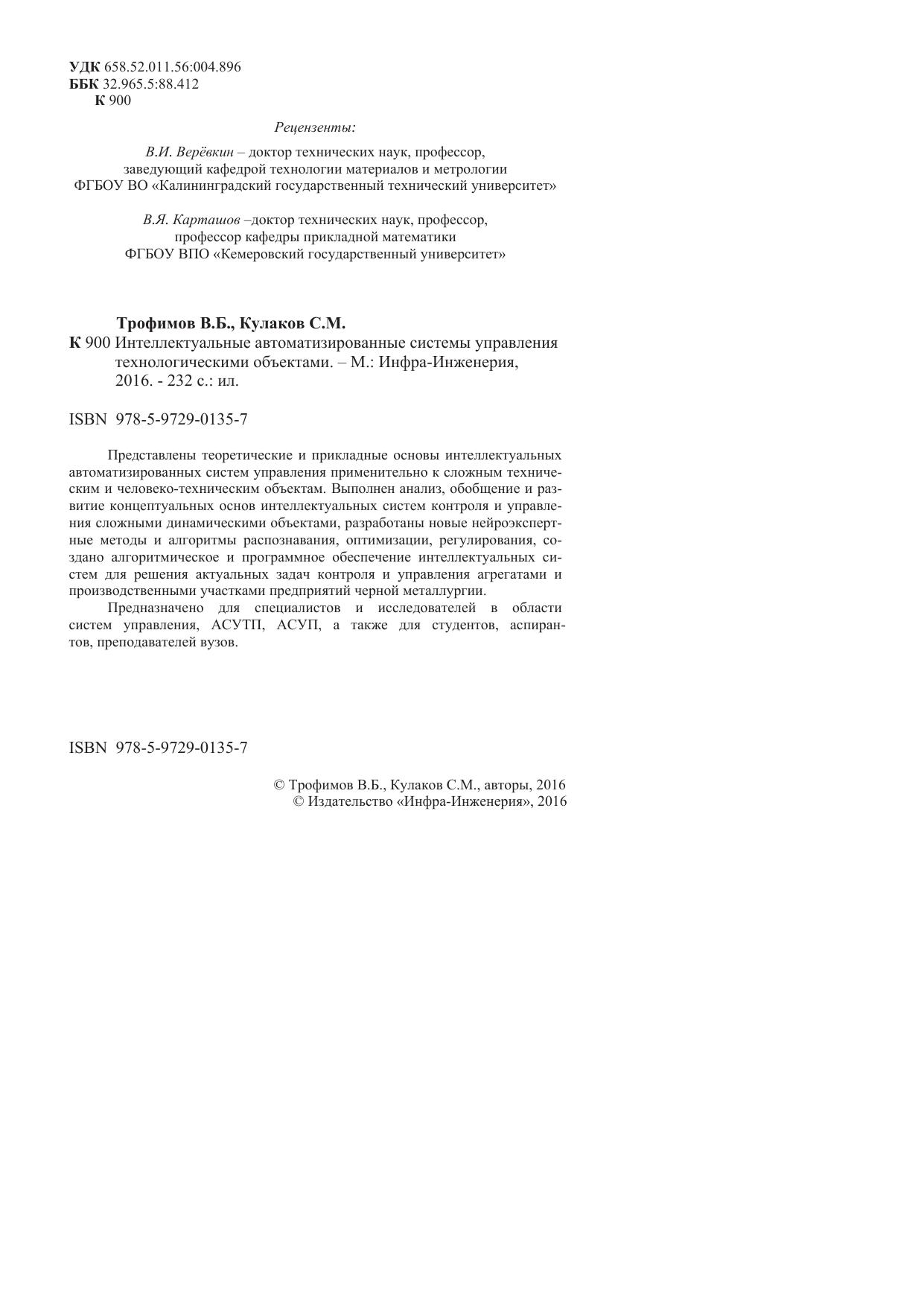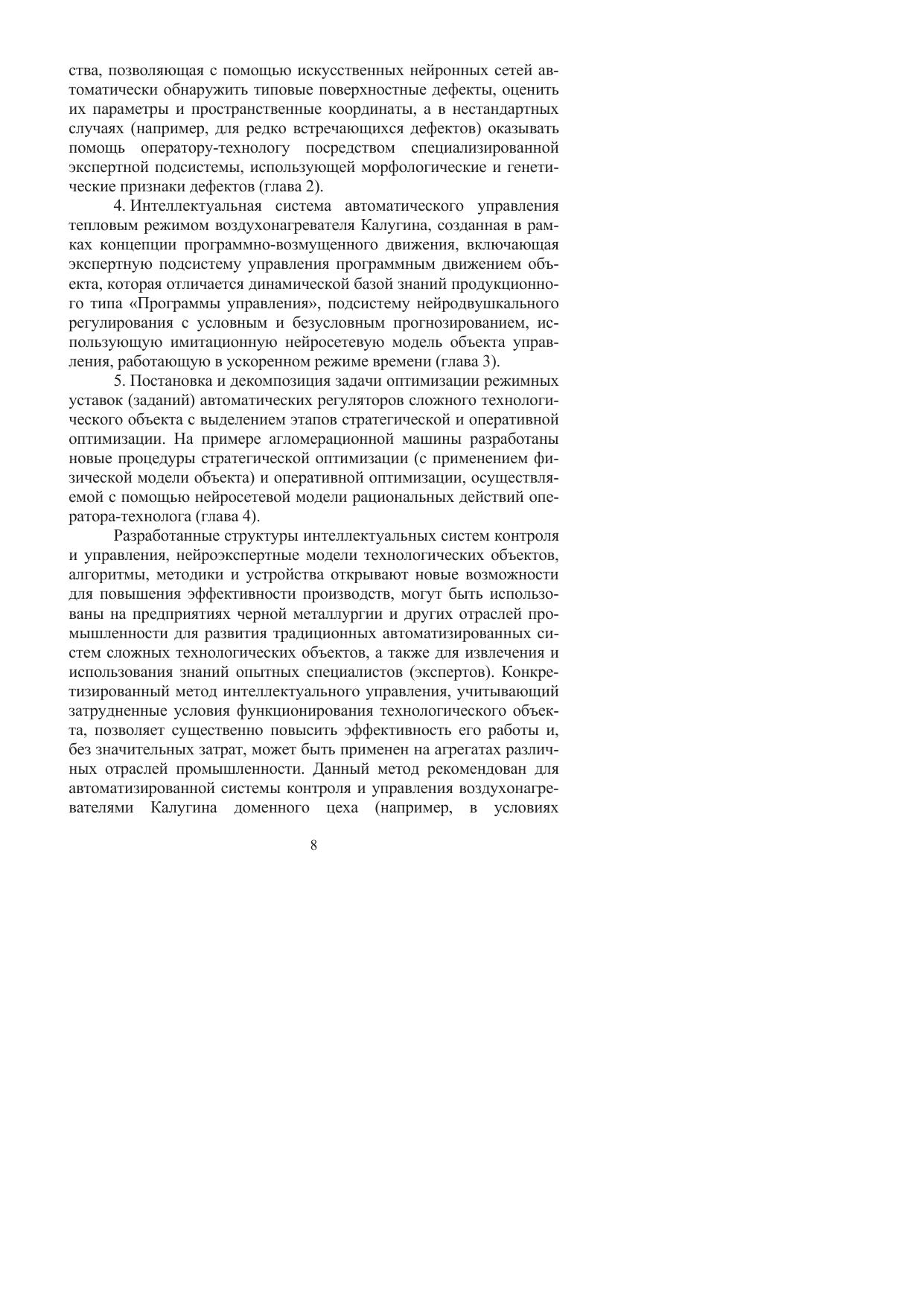 Представлены теоретические и прикладные основы интеллектуальных автоматизированных систем управления применительно к сложным техническим и человеко-техническим объектам. Выполнен анализ, обобщение и развитие концептуальных основ интеллектуальных систем контроля и управления сложными динамическими объектами, разработаны новые нейроэкспертные методы и алгоритмы распознавания, оптимизации, регулирования, создано алгоритмическое и программное обеспечение интеллектуальных систем для решения актуальных задач контроля и управления агрегатами и производственными участками предприятий черной металлургии.