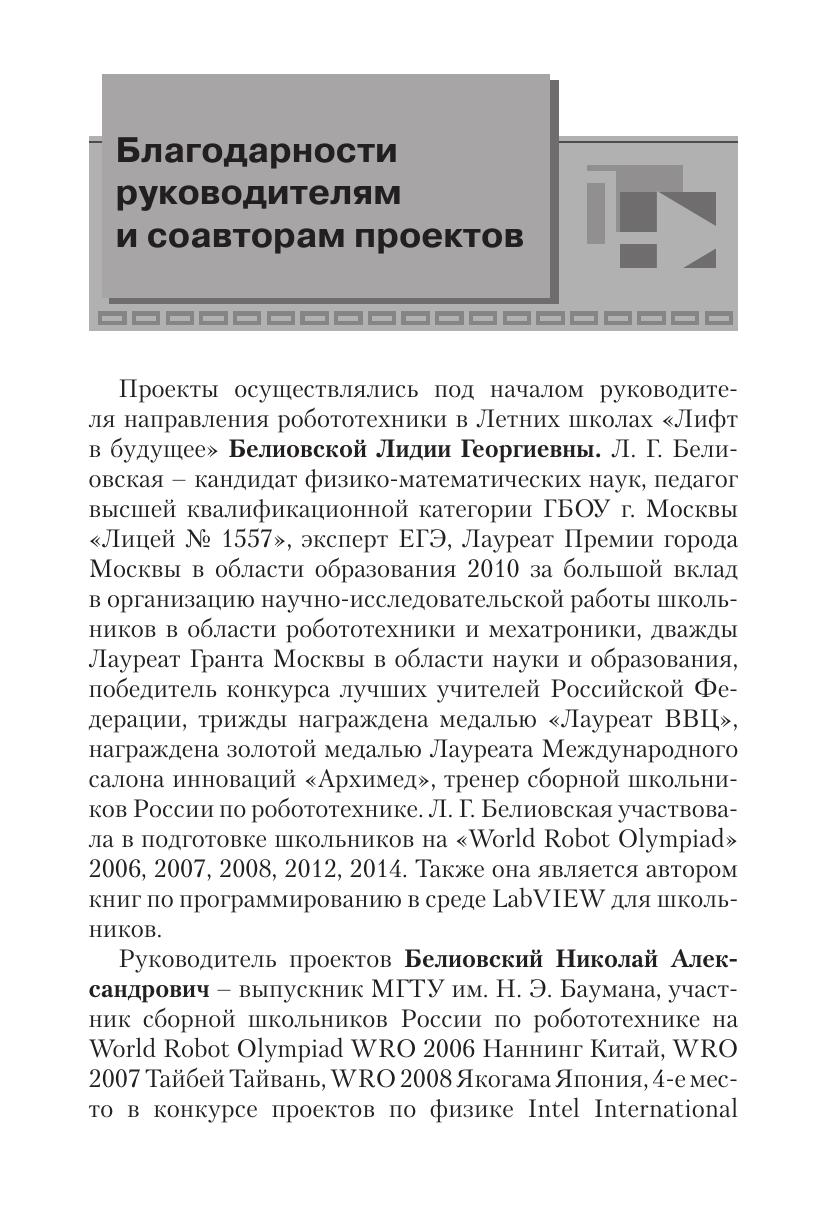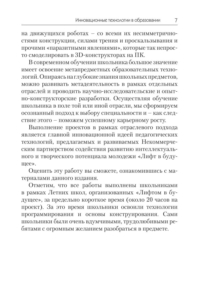 В методическом пособии представлены проекты школьников, которые были реализованы на научно-образовательных школах «Лифт в будущее» Некоммерческого партнерства содействия развитию интеллектуального и творческого потенциала молодежи. Ученики вместе с экспертами и представителями российских инновационных компаний разрабатывали решения, направленные на модернизацию существующих в регионах России производств и на внедрение новых технологий. Осуществляя обучение школьника в той или иной отрасли, авторы формируют осознанный подход к выбору специальности и стремятся к тому, чтобы будущие технологические лидеры нашли применение своим идеям в России. Такой инженерно-отраслевой принцип позволит развить существующие подходы в преподавании робототехники в школе и даст новое направление в развитии проектной деятельности учащихся. Издание рассчитано на учителей средней и старшей школы, будет полезно школьникам основной школы при проведении проектной деятельности.