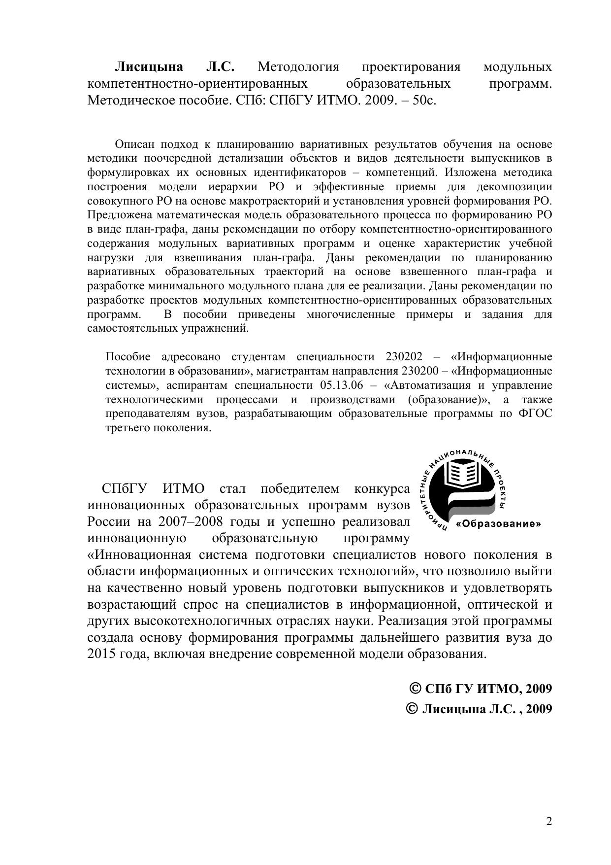 Описан подход к планированию вариативных результатов обучения на основе методики поочередной детализации объектов и видов деятельности выпускников в формулировках их основных идентификаторов – компетенций. Изложена методикапостроения модели иерархии РО и эффективные приемы для декомпозиции совокупного РО на основе макротраекторий и установления уровней формирования РО. Предложена математическая модель образовательного процесса по формированию РО в виде план-графа, даны рекомендации по отбору компетентностно-ориентированного содержания модульных вариативных программ и оценке характеристик учебной нагрузки для взвешивания план-графа. Даны рекомендации по планированиювариативных образовательных траекторий на основе взвешенного план-графа и разработке минимального модульного плана для ее реализации. Даны рекомендации по разработке проектов модульных компетентностно-ориентированных образовательных программ. В пособии приведены многочисленные примеры и задания для самостоятельных упражнений.