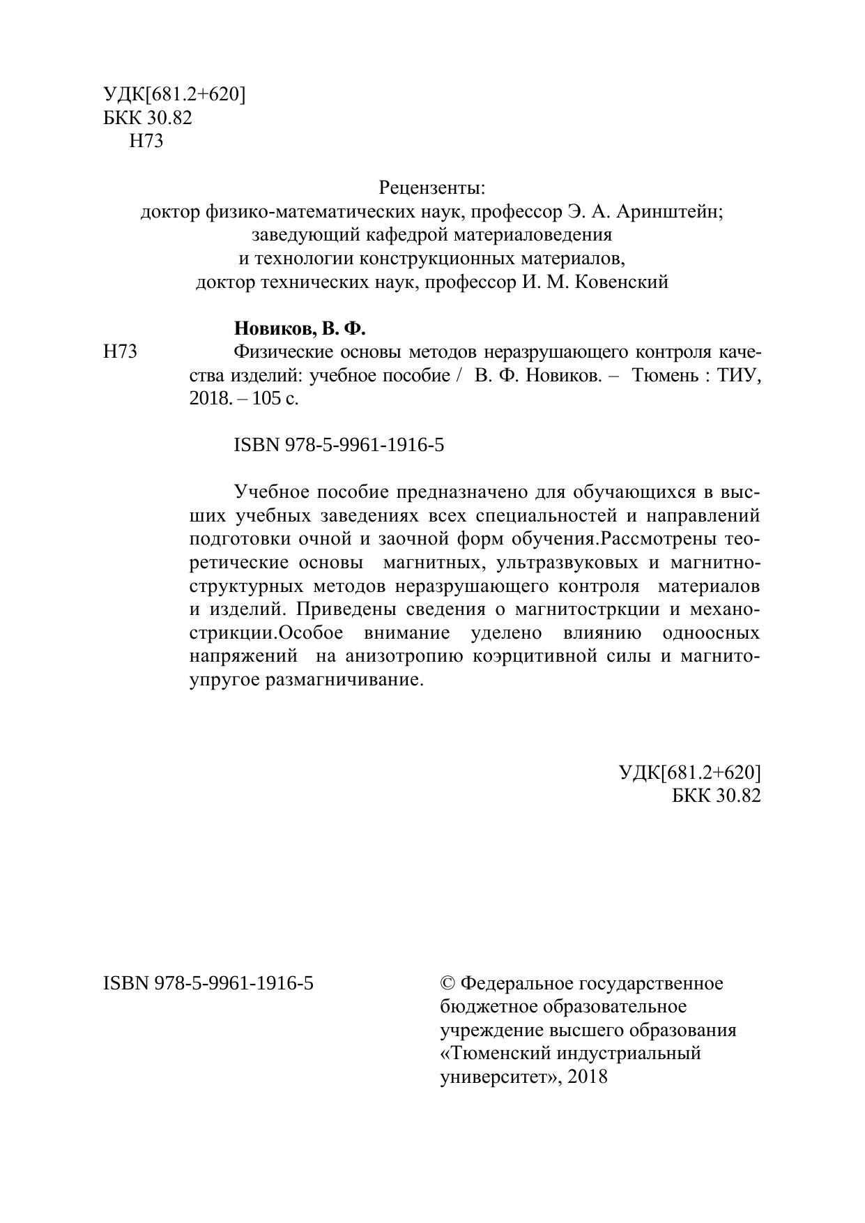 Учебное пособие предназначено для обучающихся в высших учебных заведениях всех специальностей и направлений подготовки очной и заочной форм обучения.Рассмотрены теоретические основы магнитных, ультразвуковых и магнитно-структурных методов неразрушающего контроля материалов и изделий. Приведены сведения о магнитостркции и механострикции.Особое внимание уделено влиянию одноосных напряжений на анизотропию коэрцитивной силы и магнито-упругое размагничивание.