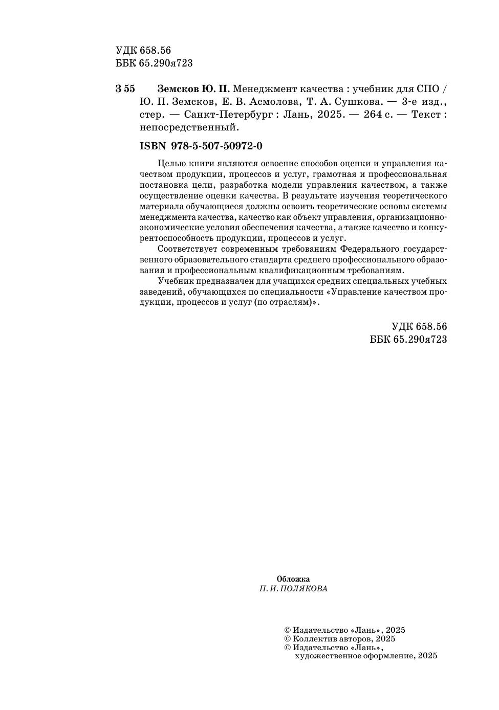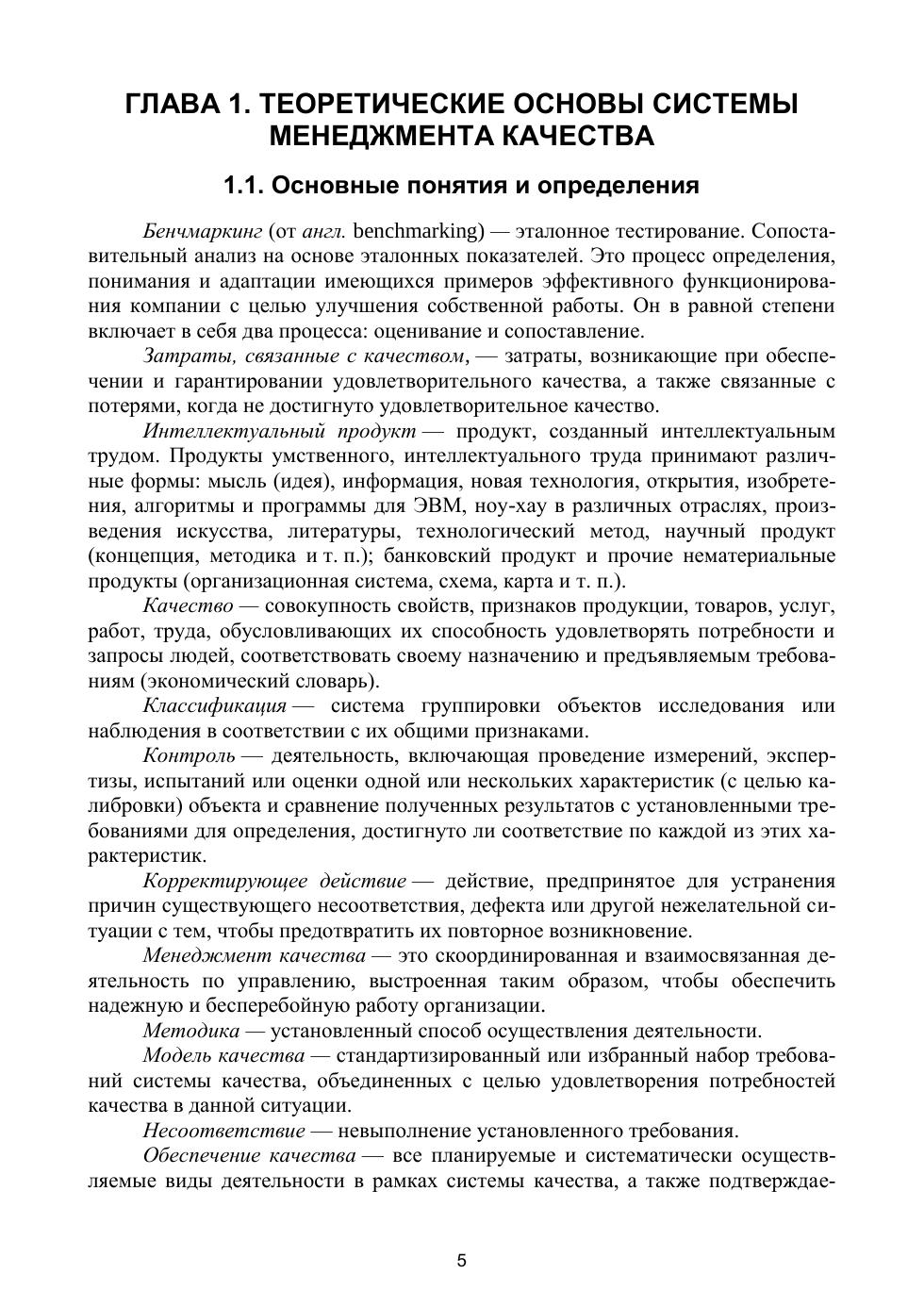 Учебник предназначен для студентов средних профессиональных учреждений. Целью книги являются освоение способов оценки и управления качеством продукции, процессов и услуг, грамотная и профессиональная постановка цели, разработка модели управления качеством, а также осуществление оценки качества. В результате изучения теоретического материала обучающиеся должны освоить теоретические основы системы менеджмента качества, качество как объект управления, организационно-экономические условия обеспечения качества, а также качество и конкурентоспособность продукции, процессов и услуг. Соответствует современным требованиям Федерального государственного образовательного стандарта среднего профессионального образования и профессиональным квалификационным требованиям. Учебник предназначен для учащихся средних специальных учебных заведений, обучающихся по специальности «Управление качеством продукции, процессов и услуг (по отраслям)».