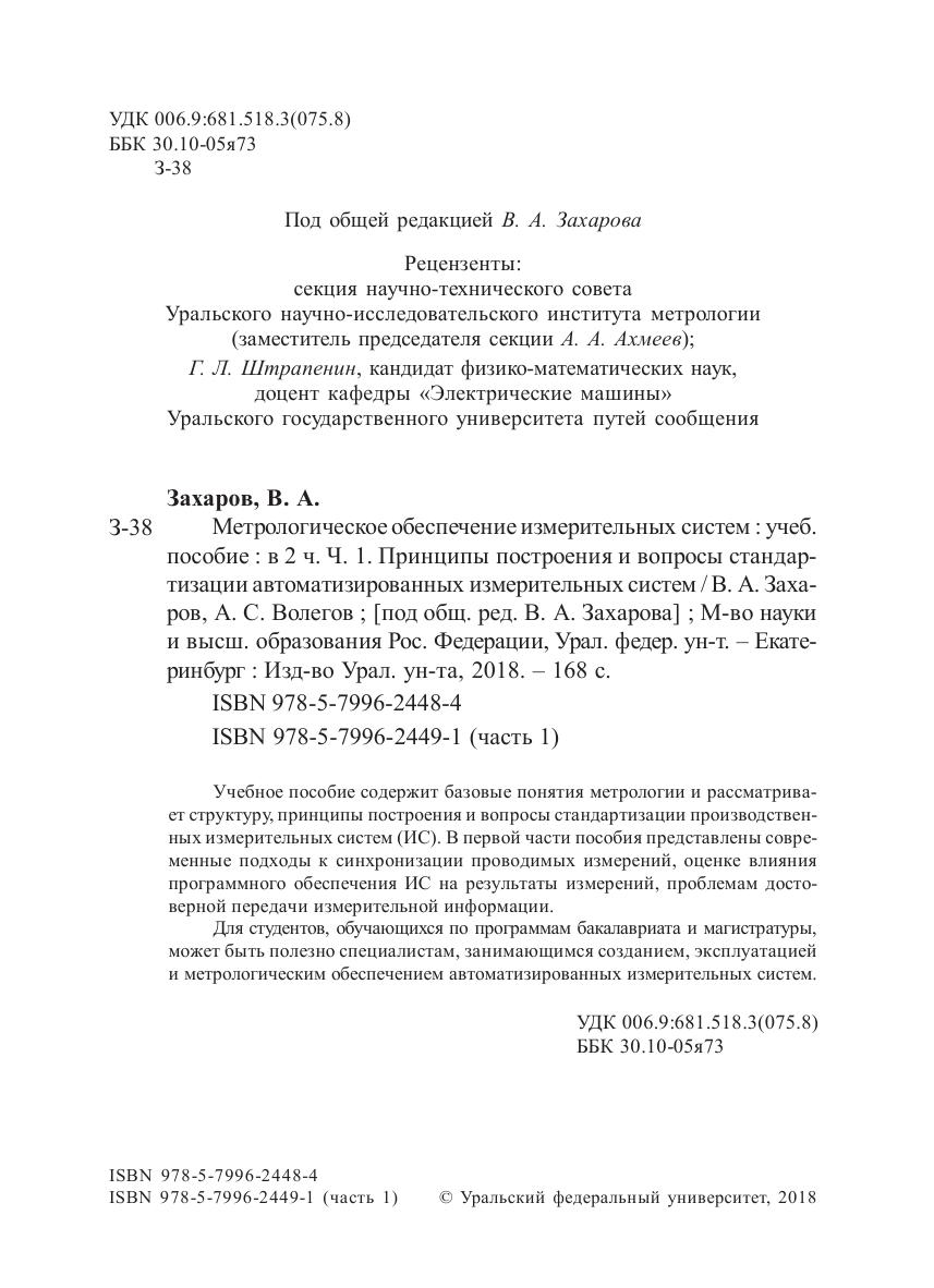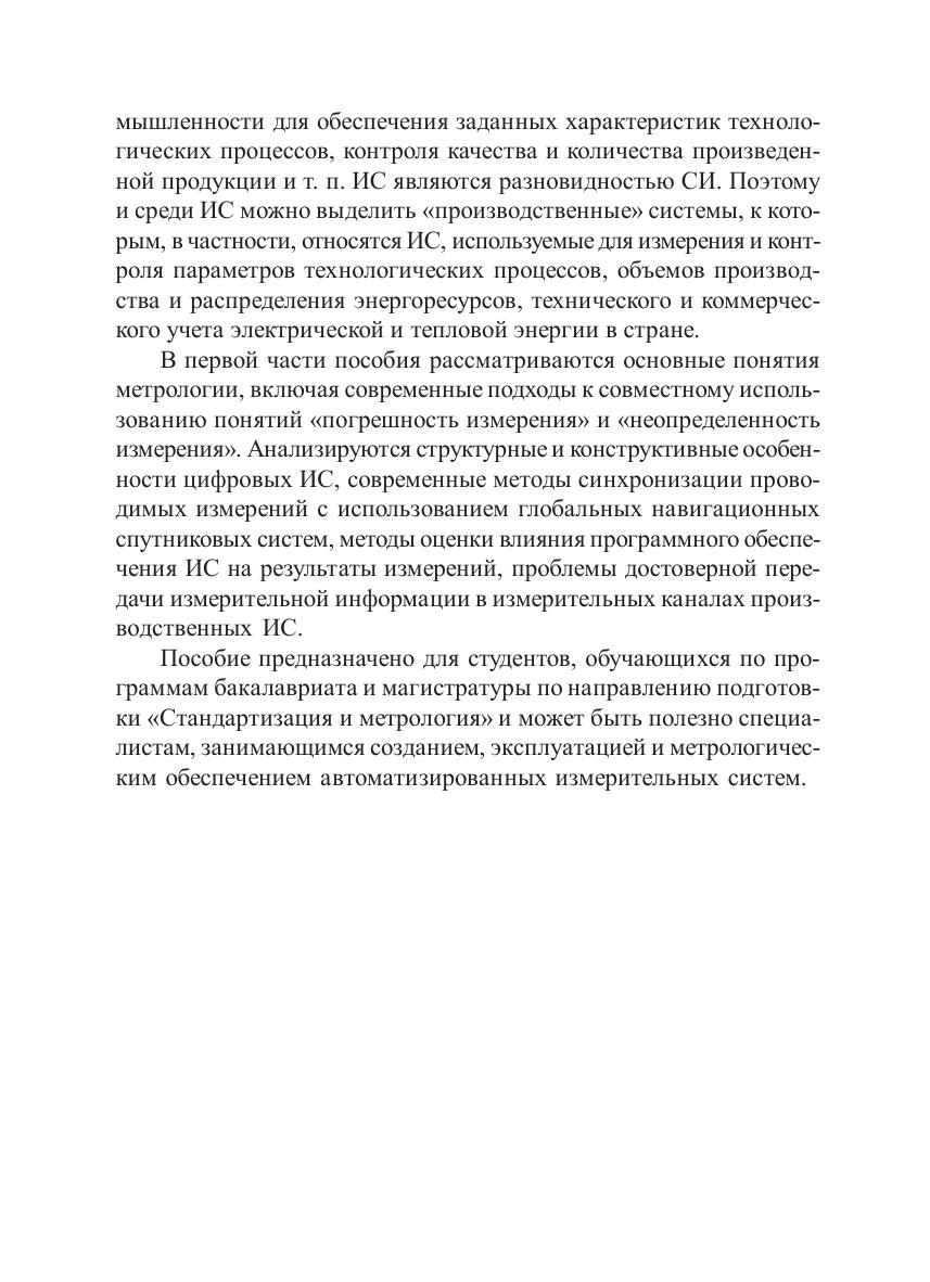 Учебное пособие содержит базовые понятия метрологии и рассматривает структуру, принципы построения и вопросы стандартизации производственных измерительных систем (ИС). В первой части пособия представлены современные подходы к синхронизации проводимых измерений, оценке влияния программного обеспечения ИС на результаты измерений, проблемам достоверной передачи измерительной информации.