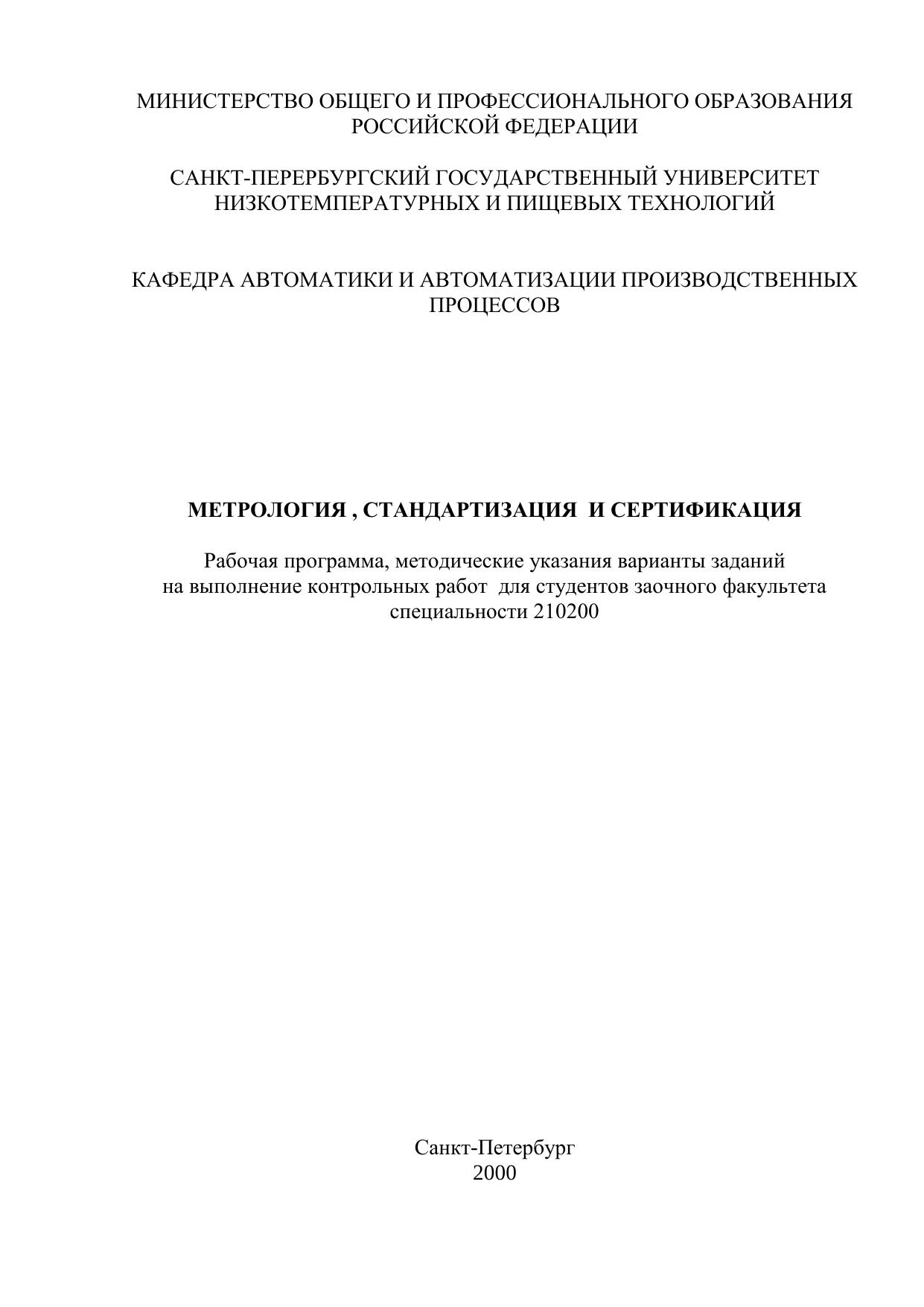 Метрология, стандартизация и сертификация. Рабочая программа, методические указания и варианты заданий на выполнение контрольных работ для студентов заочного факультета специальности 210200