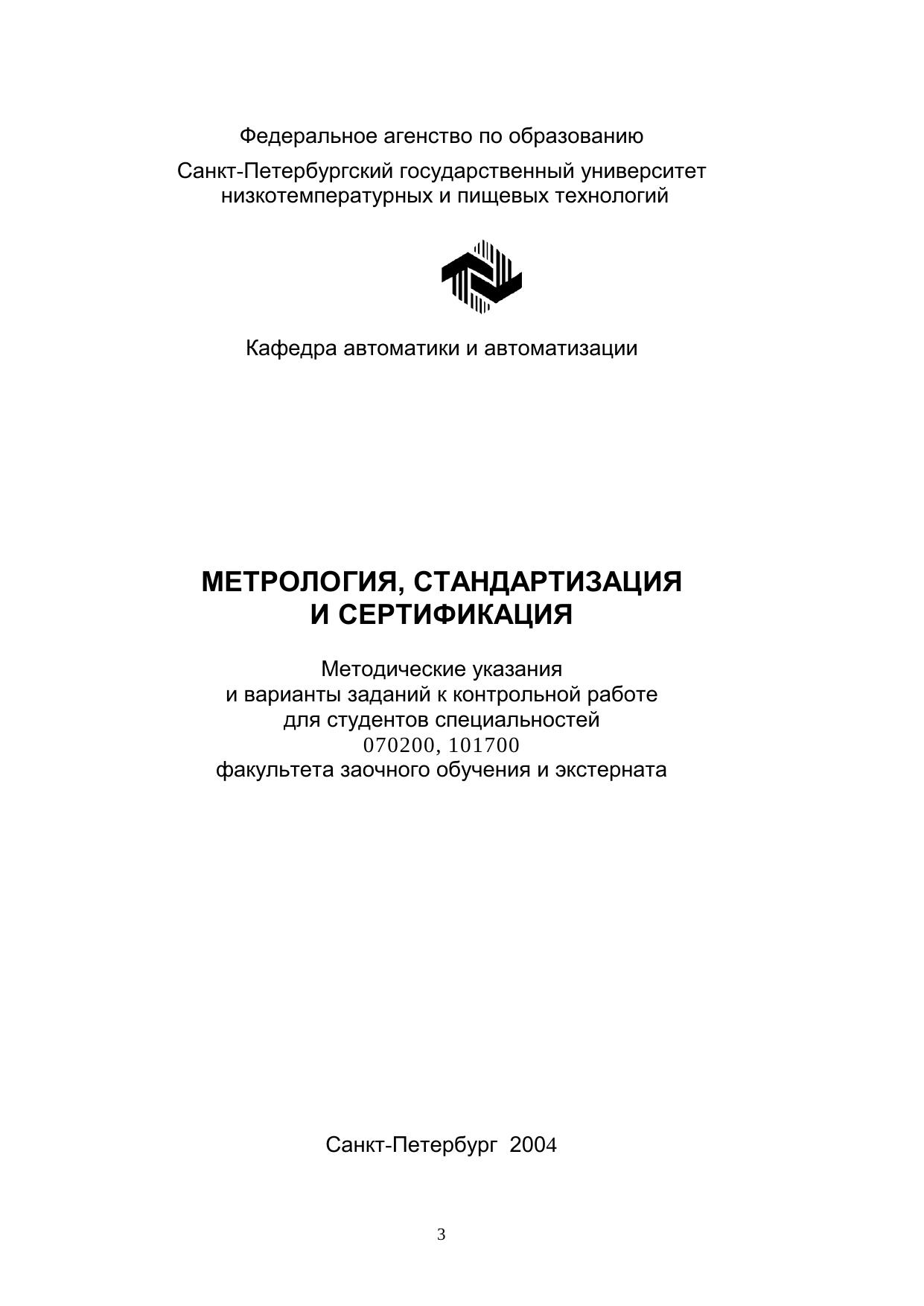 Метрология, стандартизация и сертификация: Метод. указания и варианты заданий к контрольной работе для студентов спец. 070200, 101700 факультета заочного обучения и экстерната