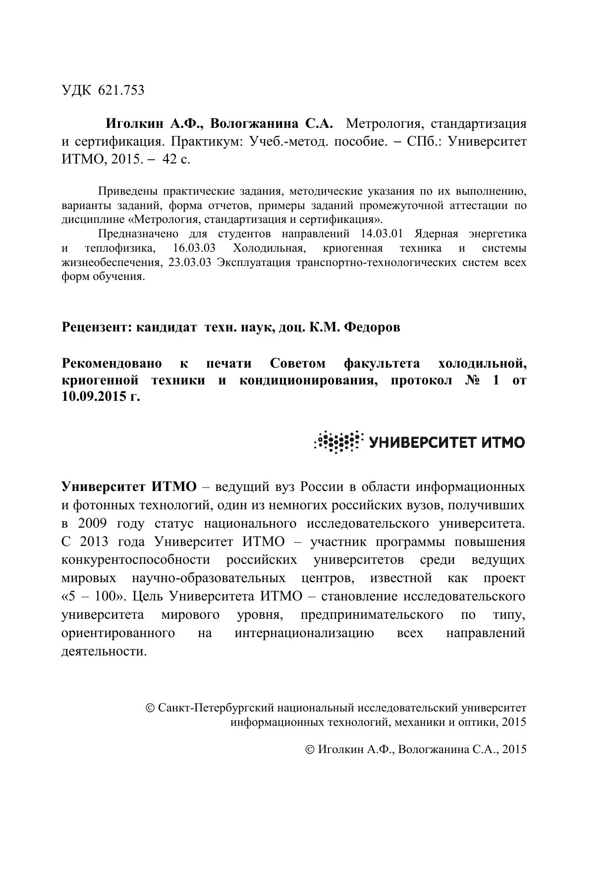 Приведены практические задания, методические указания по их выполнению, варианты заданий, форма отчетов, примеры заданий промежуточной аттестации по дисциплине «Метрология, стандартизация и сертификация». Предназначено для студентов направлений 14.03.01 Ядерная энергетика и теплофизика, 16.03.03 Холодильная, криогенная техника и системы жизнеобеспечения, 23.03.03 Эксплуатация транспортно-технологических систем всех форм обучения.