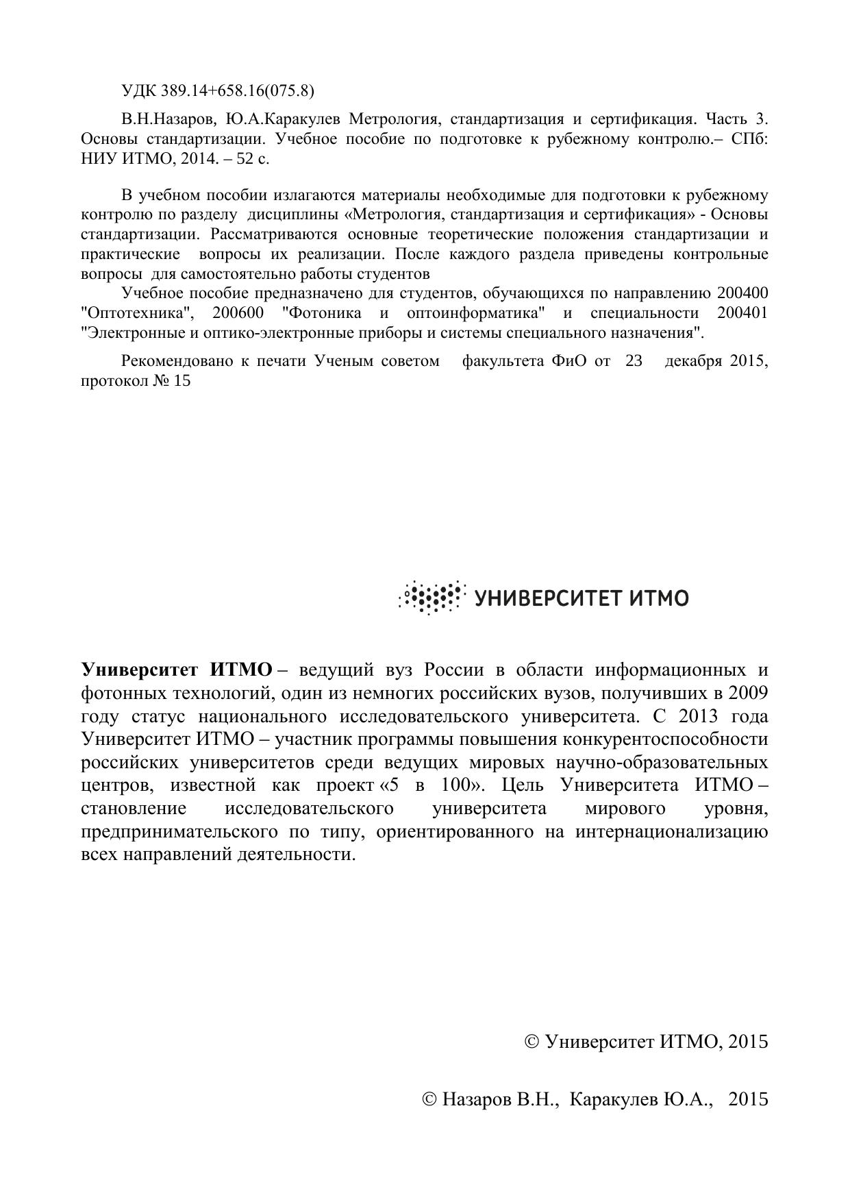 В учебном пособии излагаются материалы необходимые для подготовки к рубежному контролю по разделу дисциплины «Метрология, стандартизация и сертификация» - Основы стандартизации. Рассматриваются основные теоретические положения стандартизации и практические вопросы их реализации. После каждого раздела приведены контрольные вопросы для самостоятельно работы студентов Учебное пособие предназначено для студентов, обучающихся по направлению 200400 "Оптотехника", 200600 "Фотоника и оптоинформатика" и специальности 200401 "Электронные и оптико-электронные приборы и системы специального назначения".