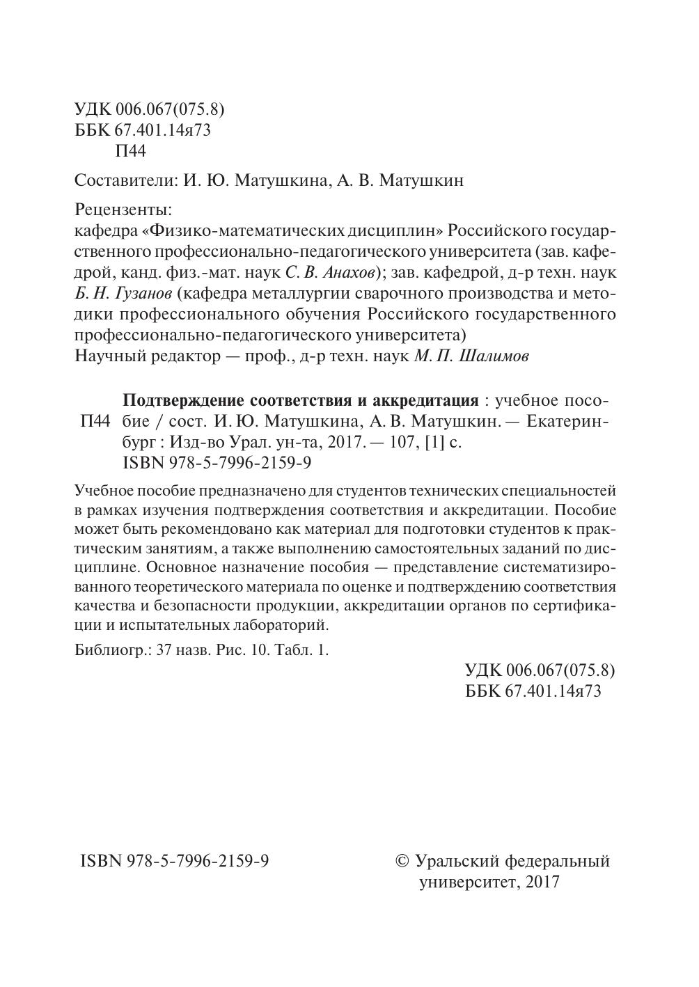 Учебное пособие предназначено для студентов технических специальностей в рамках изучения подтверждения соответствия и аккредитации. Пособие может быть рекомендовано как материал для подготовки студентов к практическим занятиям, а также выполнению самостоятельных заданий по дисциплине. Основное назначение пособия — представление систематизированного теоретического материала по оценке и подтверждению соответствия качества и безопасности продукции, аккредитации органов по сертификации и испытательных лабораторий.