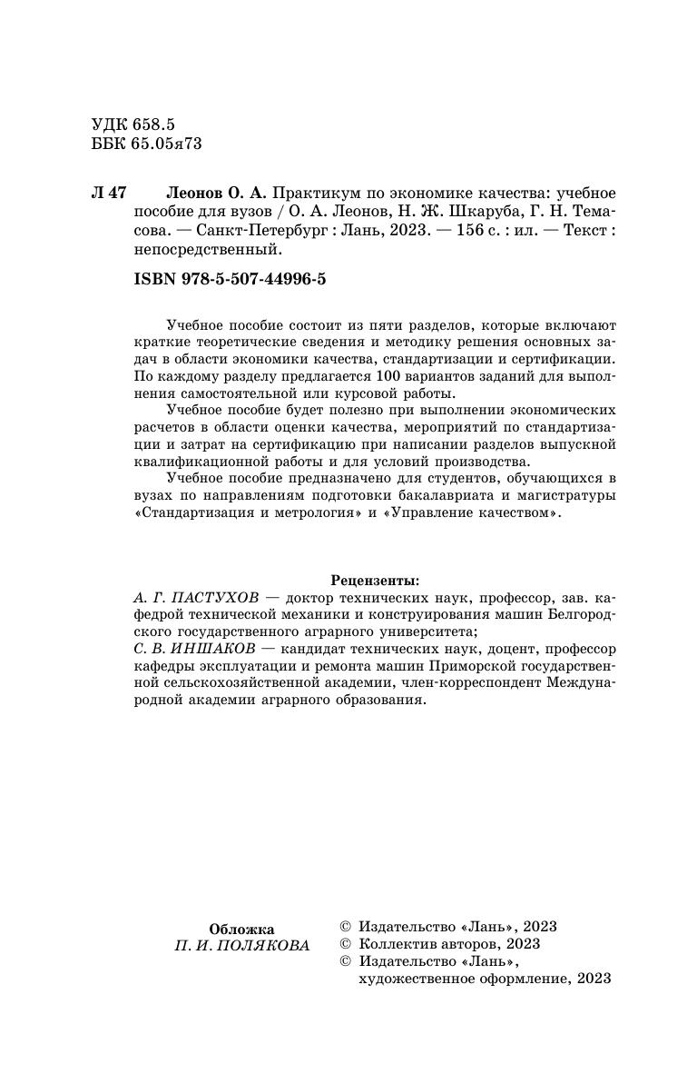 Учебное пособие состоит из пяти разделов, которые включают краткие теоретические сведения и методику решения основных задач в области экономики качества, стандартизации и сертификации. По каждому разделу предлагается 100 вариантов заданий для выполнения самостоятельной или курсовой работы. Учебное пособие будет полезно при выполнении экономических расчетов в области оценки качества, мероприятий по стандартизации и затрат на сертификацию при написании разделов выпускной квалификационной работы и для условий производства. Учебное пособие предназначено для студентов, обучающихся в вузах по направлениям подготовки бакалавриата и магистратуры «Стандартизация и метрология» и «Управление качеством».