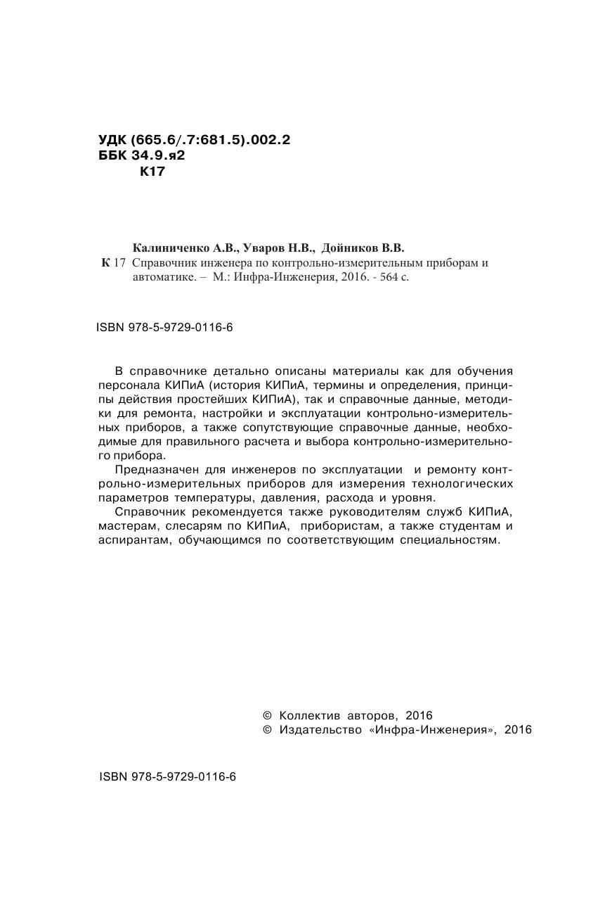 В справочнике детально описаны материалы как для обучения персонала КИПиА (история КИПиА, термины и определения, принципы действия простейших КИПиА), так и справочные данные, методики для ремонта, настройки и эксплуатации контрольно-измерительных приборов, а также сопутствующие справочные данные, необходимые для правильного расчета и выбора контрольно-измерительного прибора. Предназначен для инженеров по эксплуатации и ремонту контрольно-измерительных приборов для измерения технологических параметров температуры, давления, расхода и уровня. Справочник рекомендуется также руководителям служб КИПиА, мастерам, слесарям по КИПиА, прибористам, а также студентам и аспирантам, обучающимся по соответствующим специальностям.