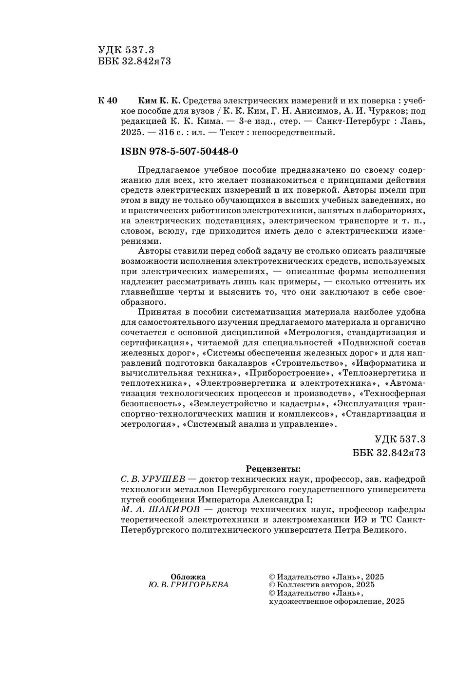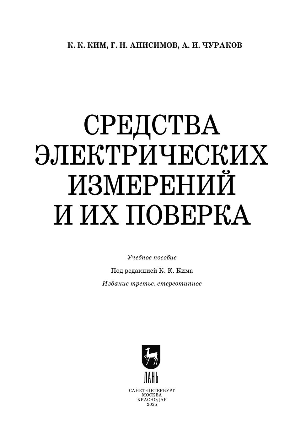 Предлагаемое учебное пособие предназначено по своему содержанию для всех, кто желает познакомиться с принципами действия средств электрических измерений и их поверкой. Авторы имели при этом в виду обучающихся в высших учебных заведениях, но и практических работников электротехники, занятых в лабораториях, на электрических подстанциях, электрическом транспорте и т. п., словом, всюду, где приходится иметь дело с электрическими измерениями.Авторы ставили перед собой задачу не столько описать различные возможности исполнения электротехнических средств, используемых при электрических измерениях, — описанные формы исполнения надлежит рассматривать лишь как примеры, — сколько оттенить их главнейшие черты и выяснить то, что они заключают в себе своеобразного. Принятая в пособии систематизация материала наиболее удобна для самостоятельного изучения предлагаемого материала и органично сочетается с основной дисциплиной «Метрология, стандартизация и сертификация», читаемой для специальностей «Подвижной состав железных дорог», «Системы обеспечения железных дорог» и для направлений подготовки бакалавров «Строительство», «Информатика и вычислительная техника», «Приборостроение», «Теплоэнергетика и теплотехника», «Электроэнергетика и электротехника», «Автоматизация технологических процессов и производств», «Техносферная безопасность», «Землеустройство и кадастры», «Эксплуатация транспортно-технологических машин и комплексов», «Стандартизация и метрология», «Системный анализ и управление».
