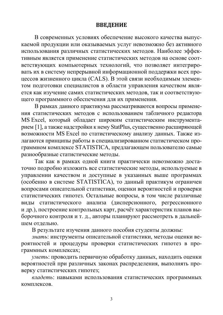Рассмотрены статистические методы, используемые при решении задач управления качеством продукции, и их реализация с применением компьютерных технологий на примере электронных таблиц MS Excel, надстройки StatPlus и системы STATISTICA. В первой части практикума изложены методы описательной статистики, оценки вероятностей при различных дискретных и непрерывных распределениях, а также проверки параметрических и непараметрических статистических гипотез.