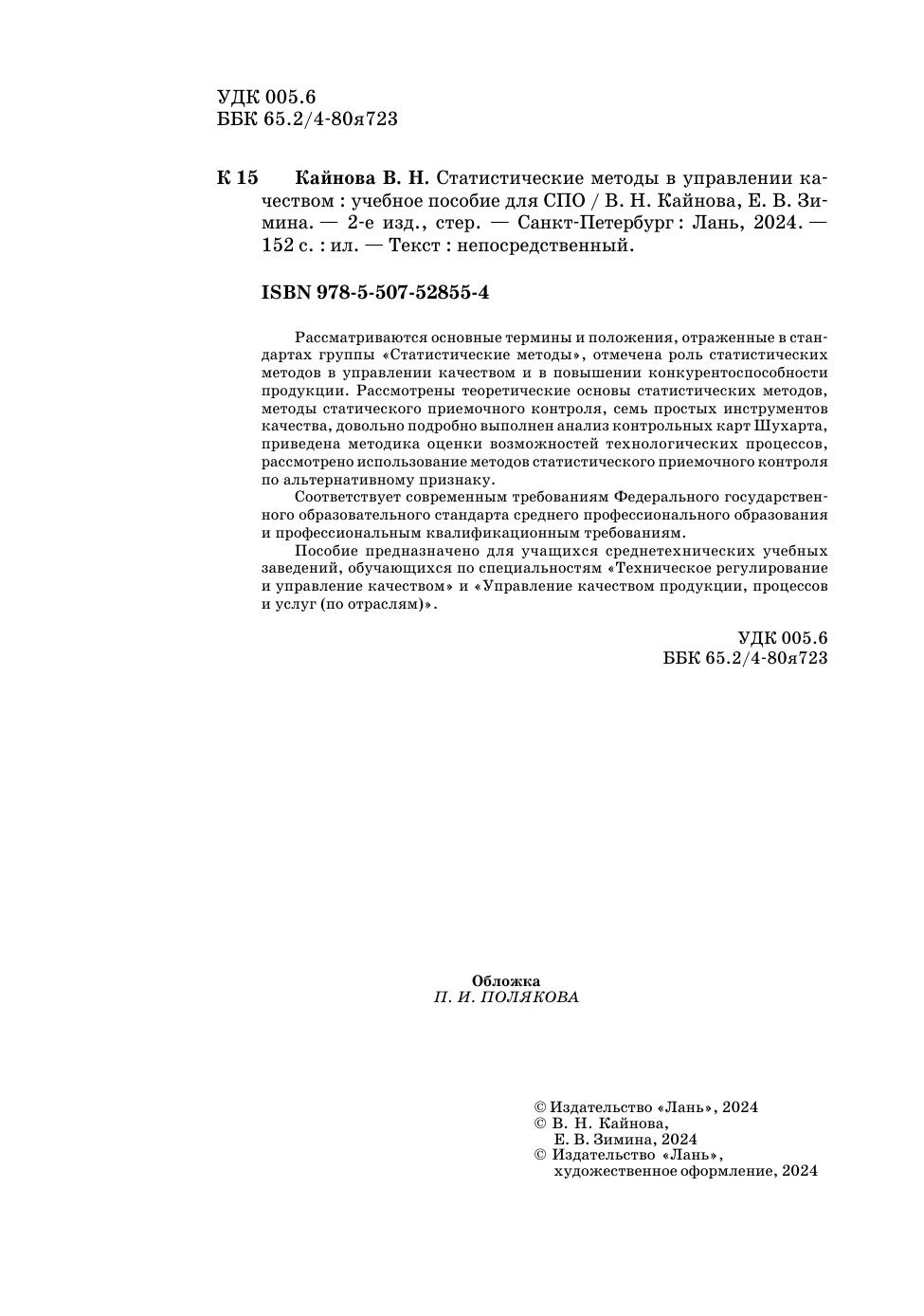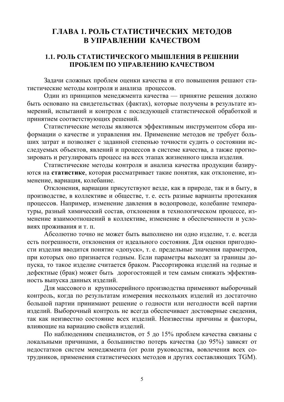 Рассматриваются основные термины и положения, отраженные в стандартах группы «Статистические методы», отмечена роль статистических методов в управлении качеством и в повышении конкурентоспособности продукции. Рассмотрены теоретические основы статистических методов, методы статического приемочного контроля, семь простых инструментов качества, довольно подробно выполнен анализ контрольных карт Шухарта, приведена методика оценки возможностей технологических процессов, рассмотрено использование методов статистического приемочного контроля по альтернативному признаку. Пособие предназначено для учащихся среднетехнических учебных заведений, обучающихся по специальностям «Техническое регулирование и управление качеством» и «Управление качеством продукции, процессов и услуг (по отраслям)». Соответствует современным требованиям Федерального государственного образовательного стандарта среднего профессионального образования и профессиональным квалификационным требованиям.