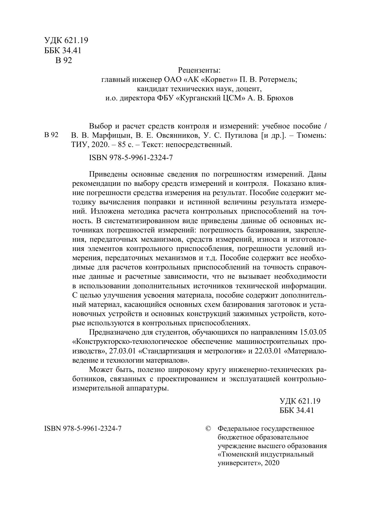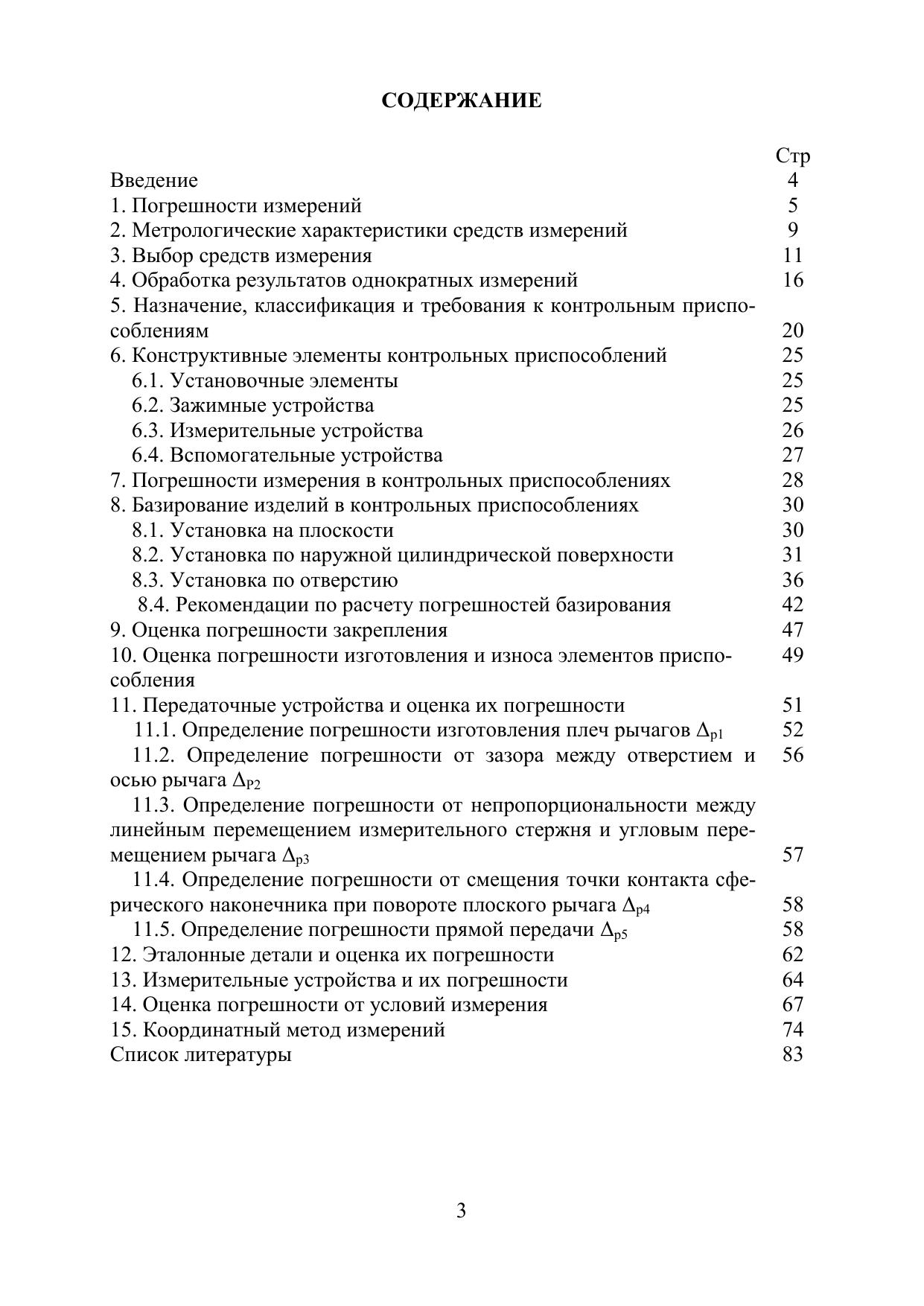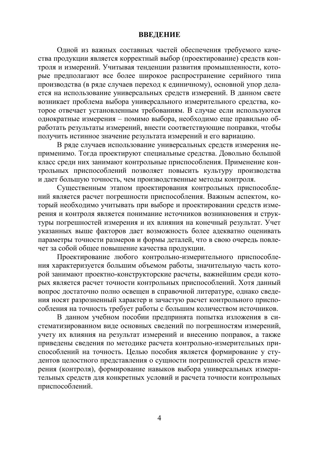 Приведены основные сведения по погрешностям измерений. Даны рекомендации по выбору средств измерений и контроля. Показано влияние погрешности средства измерения на результат. Пособие содержит методику вычисления поправки и истинной величины результата измерений. Изложена методика расчета контрольных приспособлений на точность. В систематизированном виде приведены данные об основных источниках погрешностей измерений: погрешность базирования, закрепления, передаточных механизмов, средств измерений, износа и изготовления элементов контрольного приспособления, погрешности условий измерения, передаточных механизмов и т.д. Пособие содержит все необходимые для расчетов контрольных приспособлений на точность справочные данные и расчетные зависимости, что не вызывает необходимости в использовании дополнительных источников технической информации. С целью улучшения усвоения материала, пособие содержит дополнительный материал, касающийся основных схем базирования заготовок и установочных устройств и основных конструкций зажимных устройств, которые используются в контрольных приспособлениях. Предназначено для студентов, обучающихся по направлениям 15.03.05 «Конструкторско-технологическое обеспечение машиностроительных производств», 27.03.01 «Стандартизация и метрология» и 22.03.01 «Материаловедение и технологии материалов». Может быть, полезно широкому кругу инженерно-технических работников, связанных с проектированием и эксплуатацией контрольноизмерительной аппаратуры