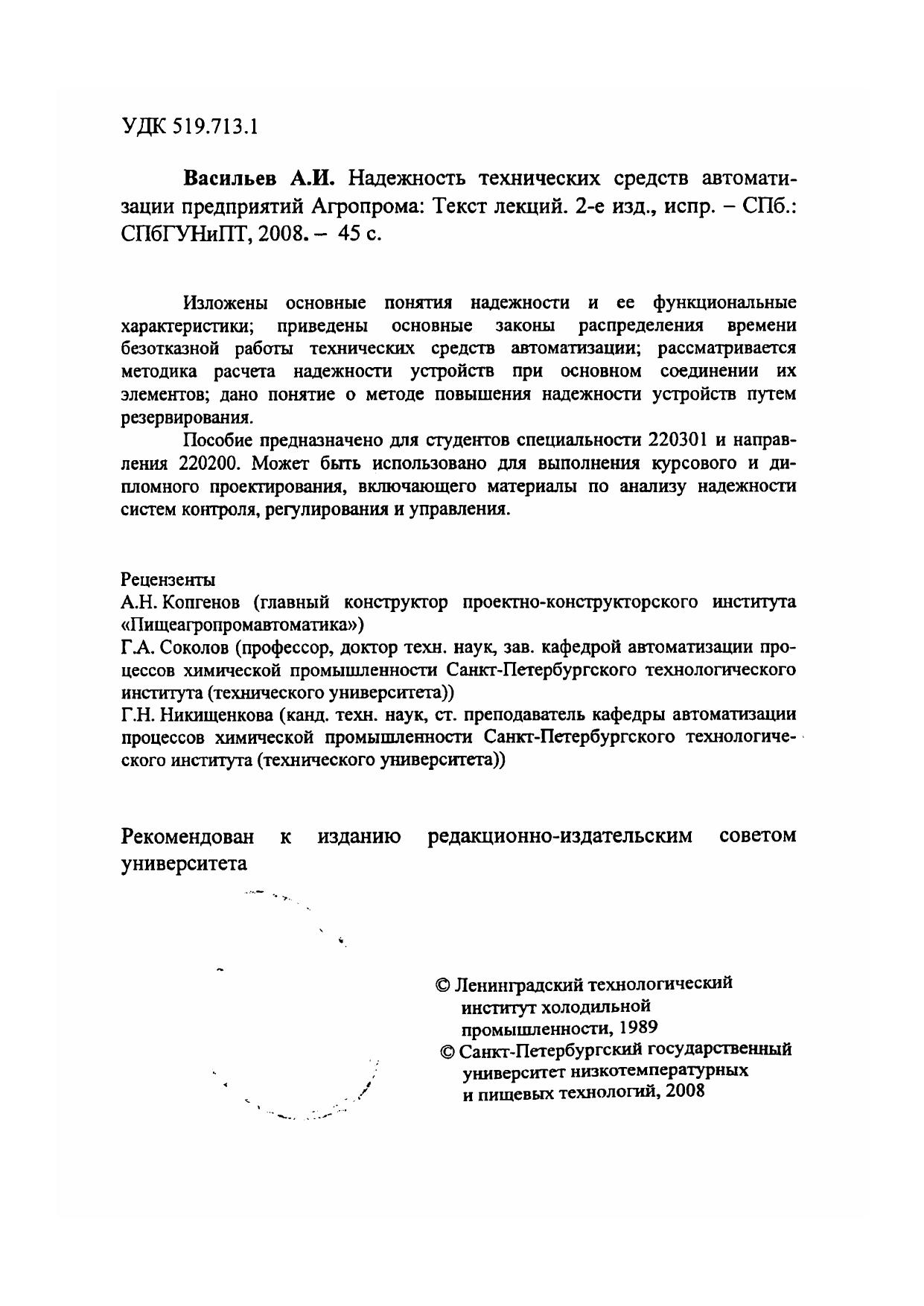 Изложены основные понятия надежности и ее функциональные характеристики приведены основные законы распределения времени безотказной работы технических средств автоматизации рассматривается методика расчета надежности устройств при основном соединении их элементов дано понятие о методе повышения надежности устройств путем резервирования.