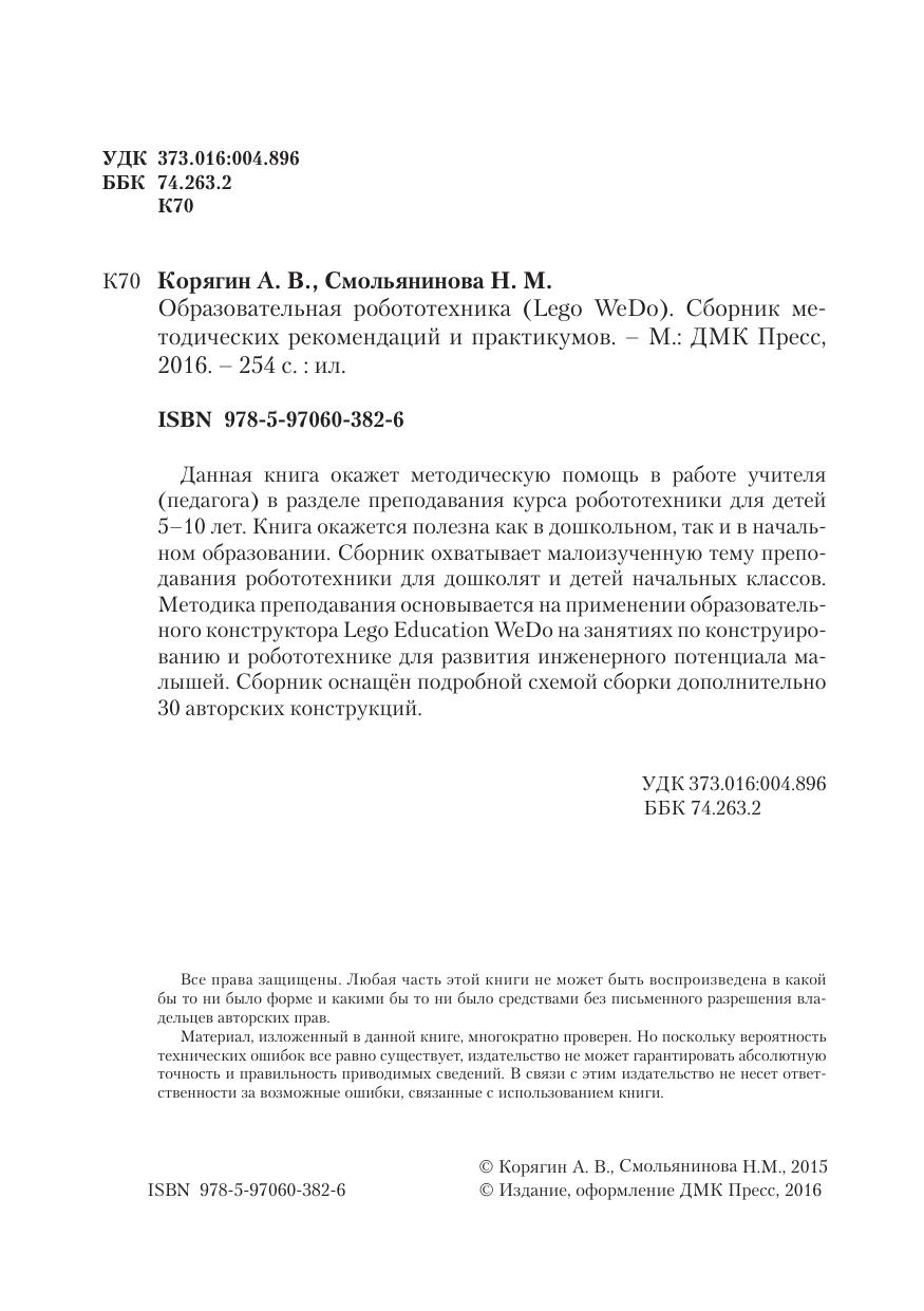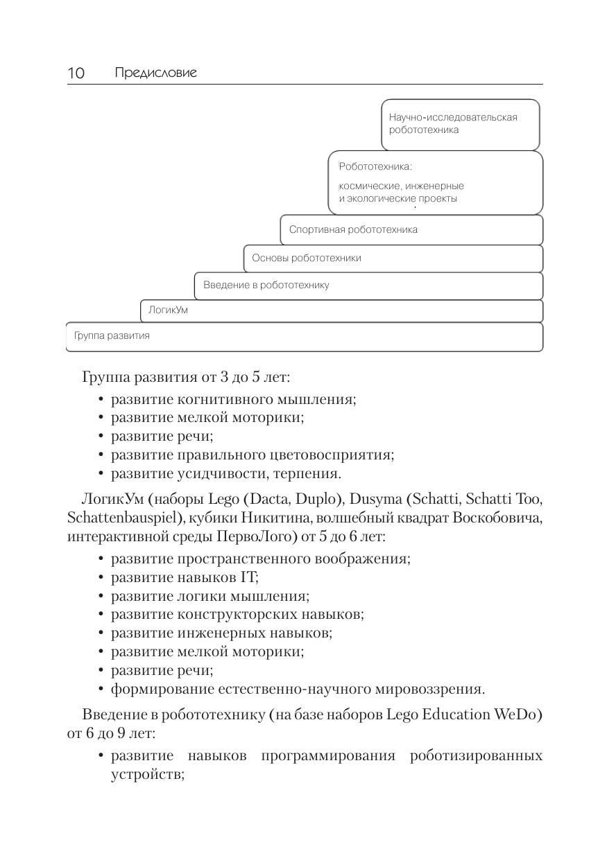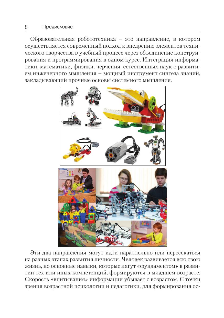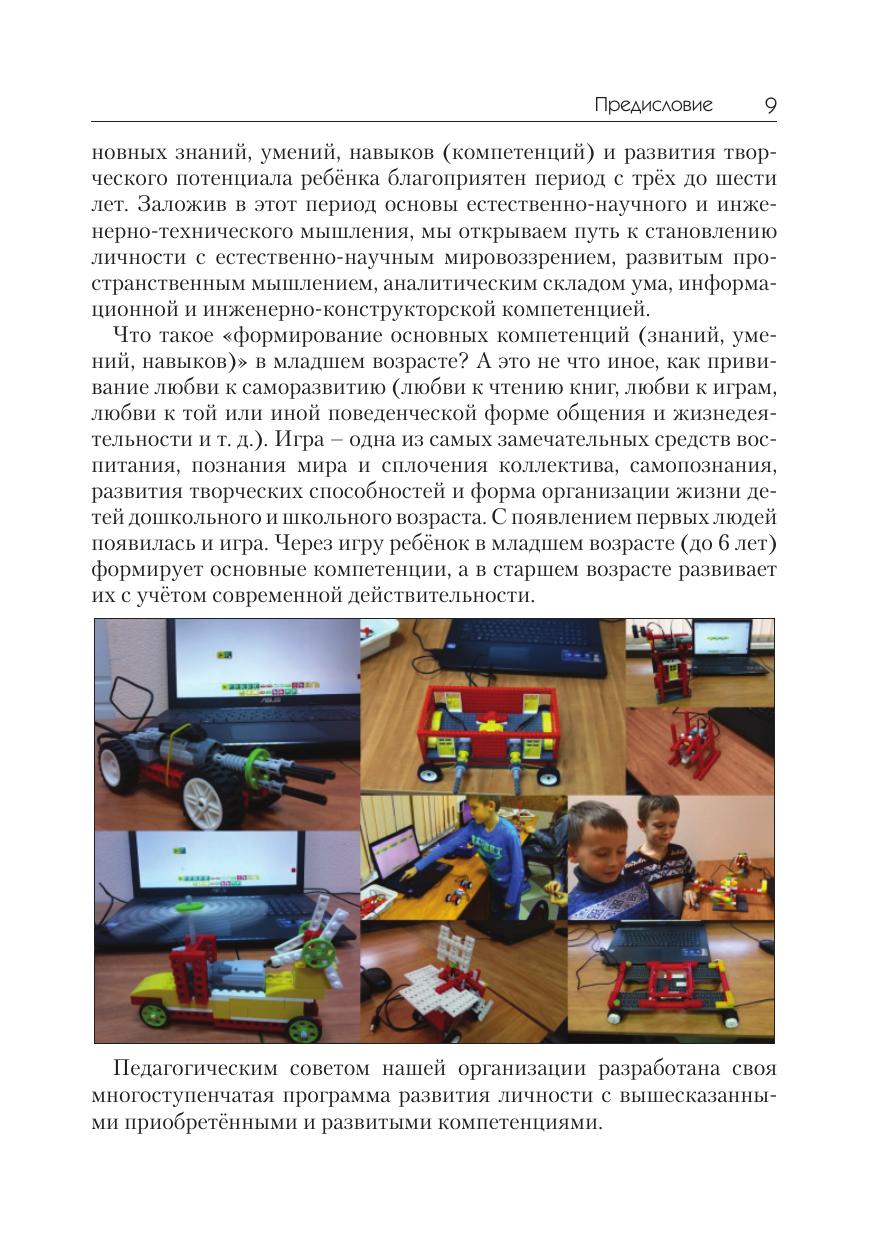 Данная книга окажет методическую помощь в работе учителя (педагога) в разделе преподавания курса робототехники для детей 5–10 лет. Книга окажется полезна как в дошкольном, так и в начальном образовании. Сборник охватывает малоизученную тему преподавания робототехники для дошколят и детей начальных классов. Методика преподавания основывается на применении образовательного конструктора Lego Education WeDo на занятиях по конструированию и робототехнике для развития инженерного потенциала малышей. Сборник оснащён подробной схемой сборки дополнительно 30 авторских конструкций.