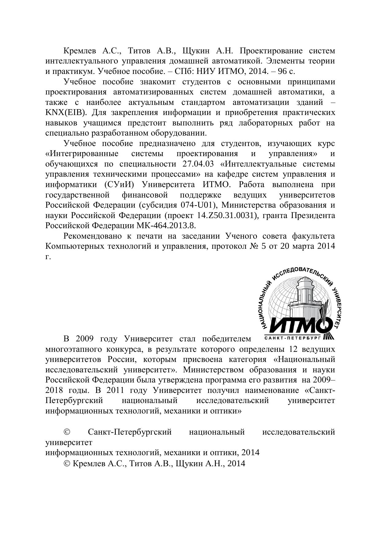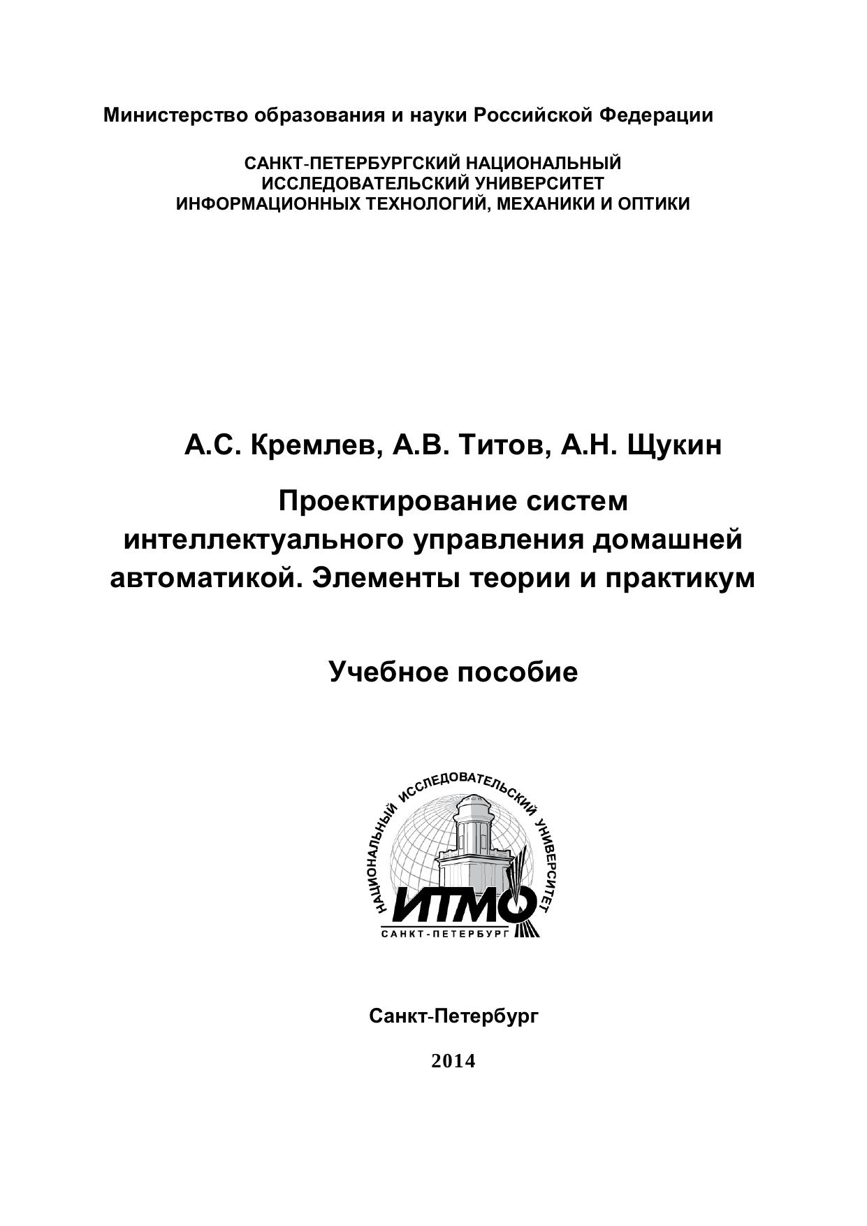 Учебное пособие знакомит студентов с основными принципами проектирования автоматизированных систем домашней автоматики, а также с наиболее актуальным стандартом автоматизации зданий – KNX(EIB). Для закрепления информации и приобретения практических навыков учащимся предстоит выполнить ряд лабораторных работ на специально разработанном оборудовании. Учебное пособие предназначено для студентов, изучающих курс «Интегрированные системы проектирования и управления» и обучающихся по специальности 27.04.03 «Интеллектуальные системы управления техническими процессами» на кафедре систем управления и информатики (СУиИ) Университета ИТМО.