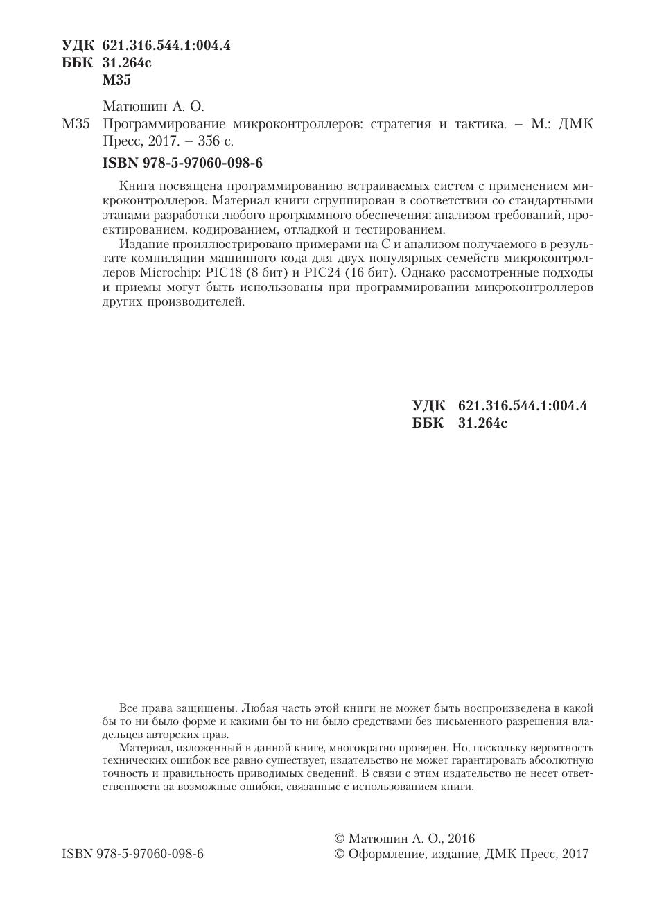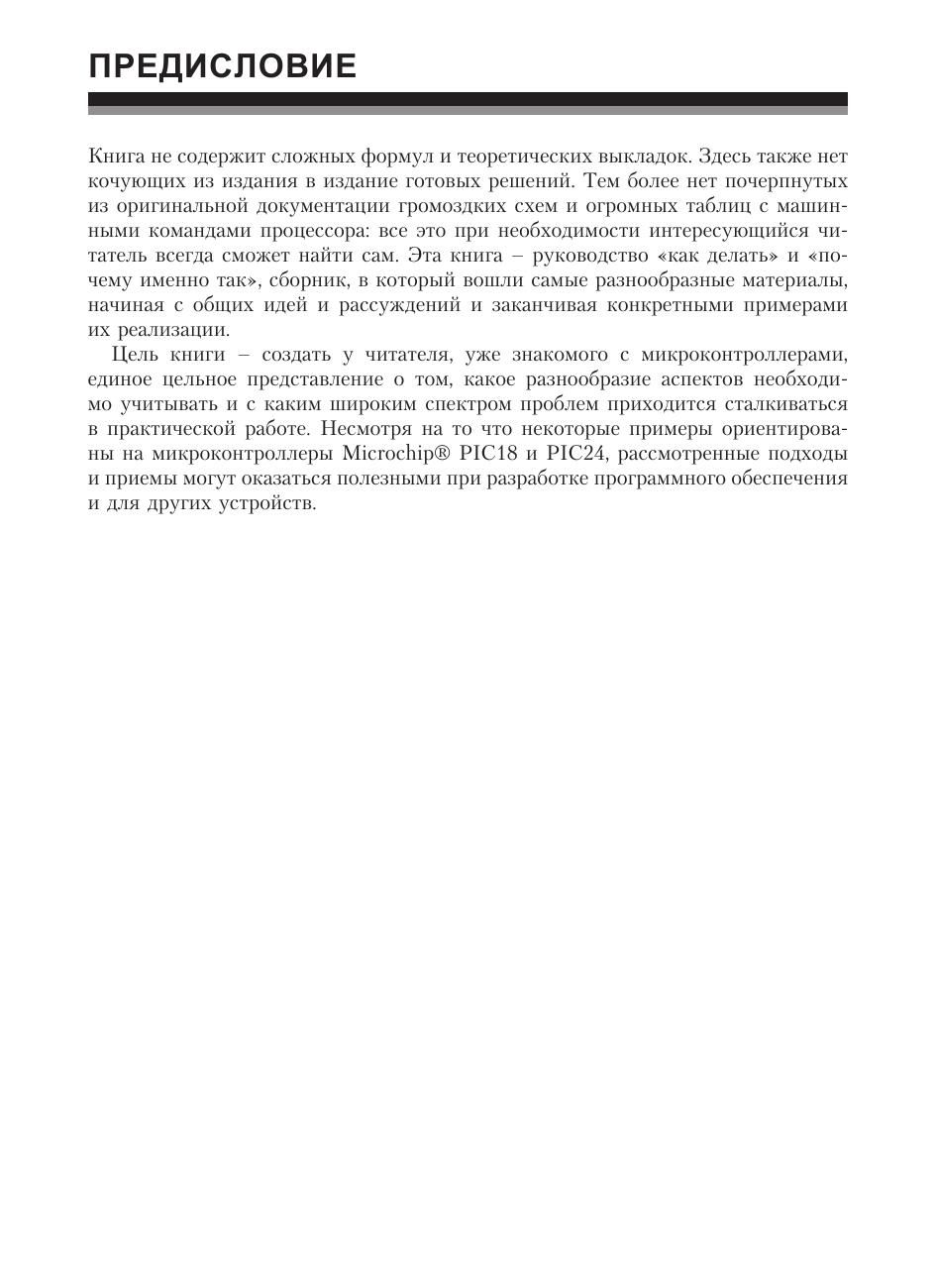 Книга посвящена программированию встраиваемых систем с применением микроконтроллеров. Материал книги сгруппирован в соответствии со стандартными этапами разработки любого программного обеспечения: анализом требований, проектированием, кодированием, отладкой и тестированием. Издание проиллюстрировано примерами на С и анализом получаемого в результате компиляции машинного кода для двух популярных семейств микроконтроллеров Microchip: PIC18 (8 бит) и PIC24 (16 бит). Однако рассмотренные подходы и приемы могут быть использованы при программировании микроконтроллеров других производителей.