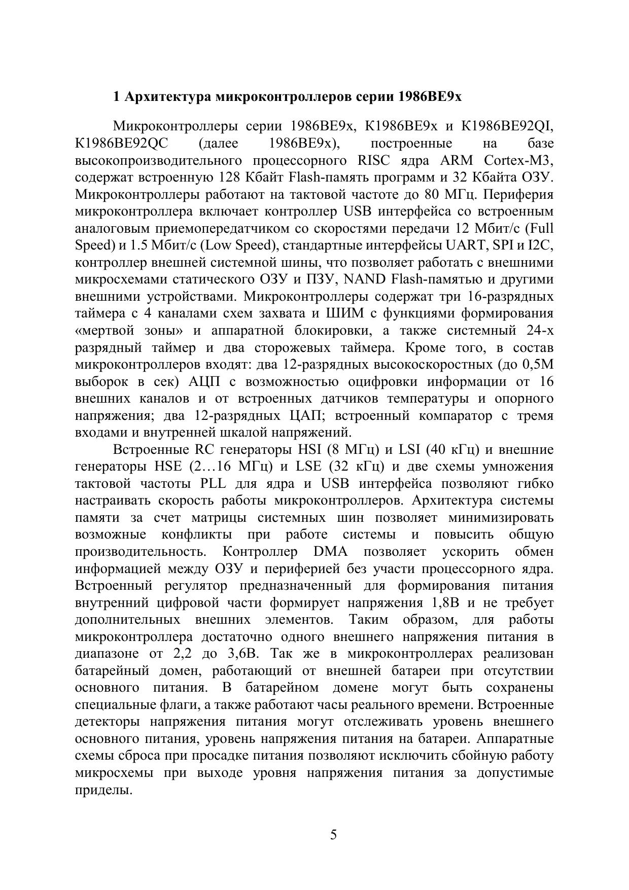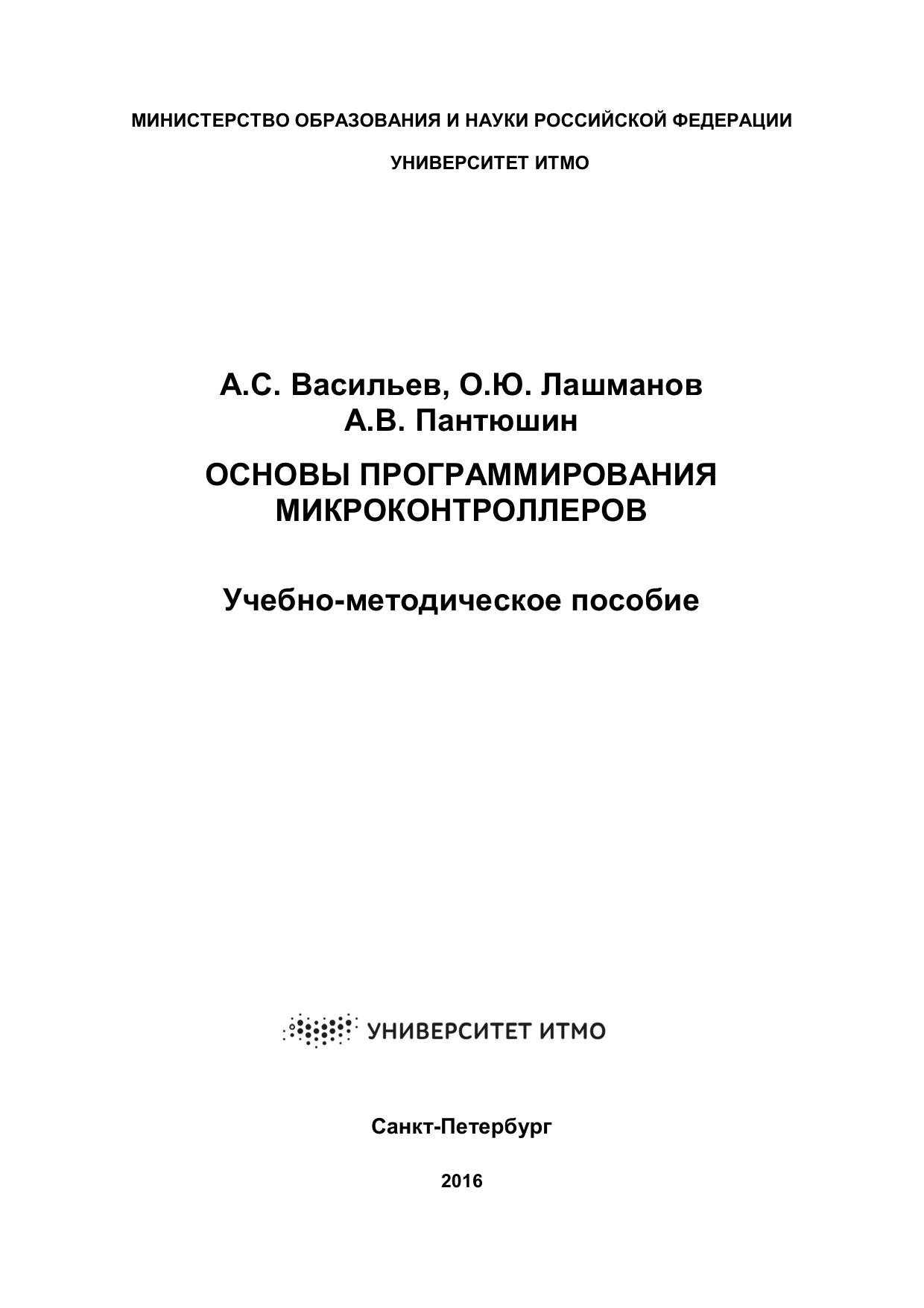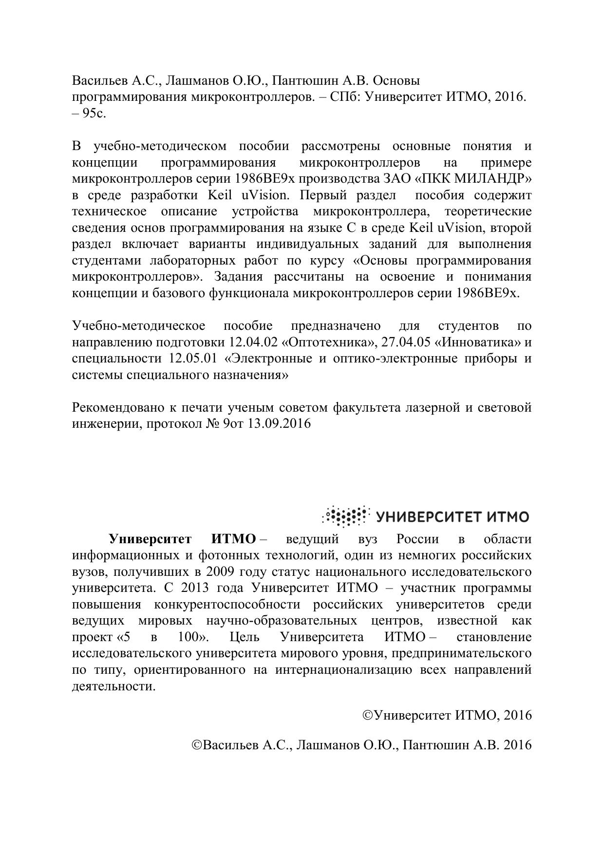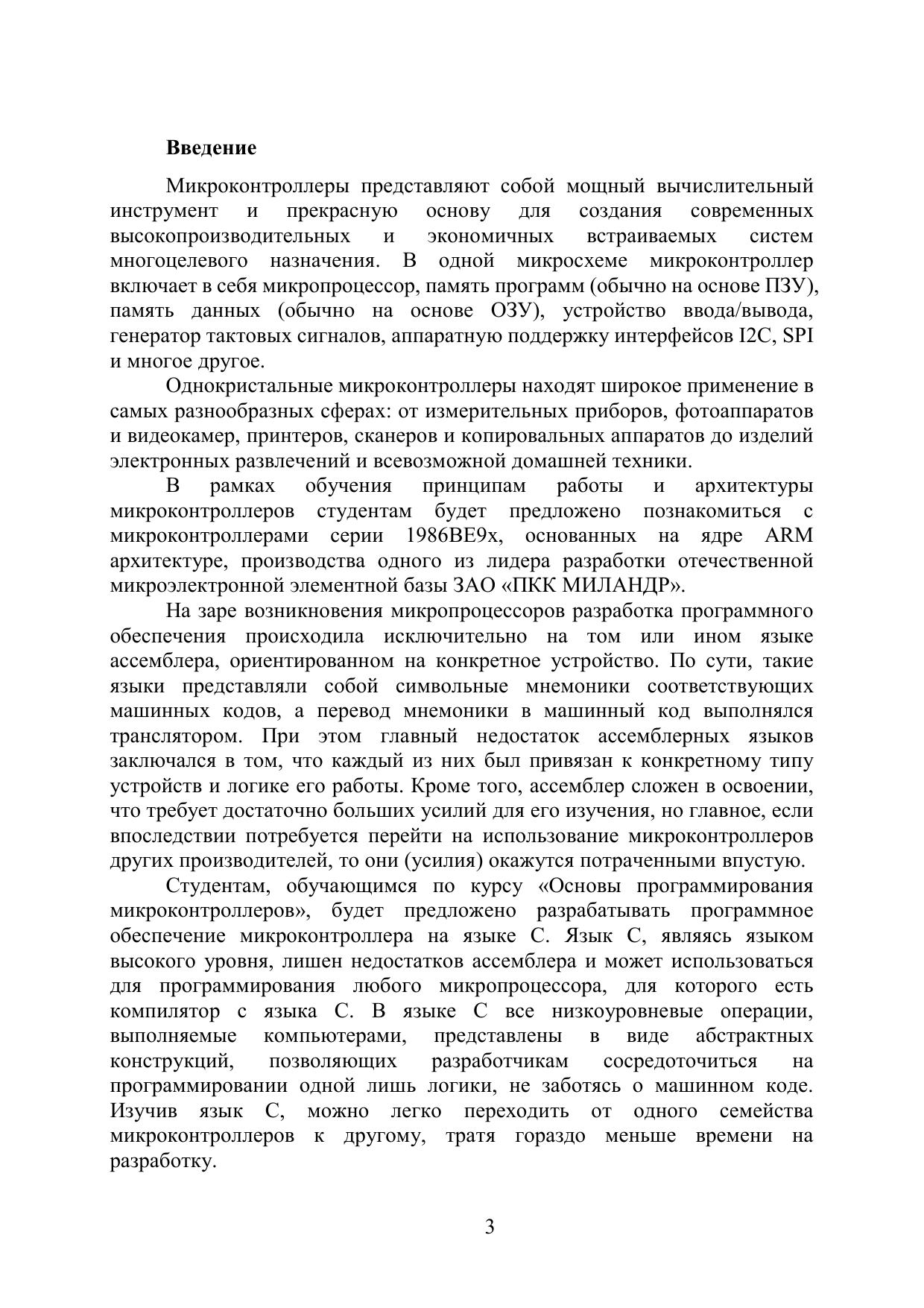 В учебно-методическом пособии рассмотрены основные понятия и концепции программирования микроконтроллеров на примере микроконтроллеров серии 1986ВЕ9x производства ЗАО «ПКК МИЛАНДР» в среде разработки Keil uVision. Первый раздел пособия содержит техническое описание устройства микроконтроллера, теоретические сведения основ программирования на языке С в среде Keil uVision, второй раздел включает варианты индивидуальных заданий для выполнения студентами лабораторных работ по курсу «Основы программирования микроконтроллеров». Задания рассчитаны на освоение и понимания концепции и базового функционала микроконтроллеров серии 1986ВЕ9x.