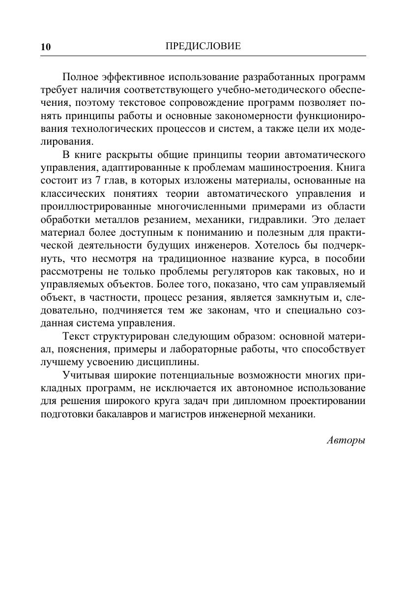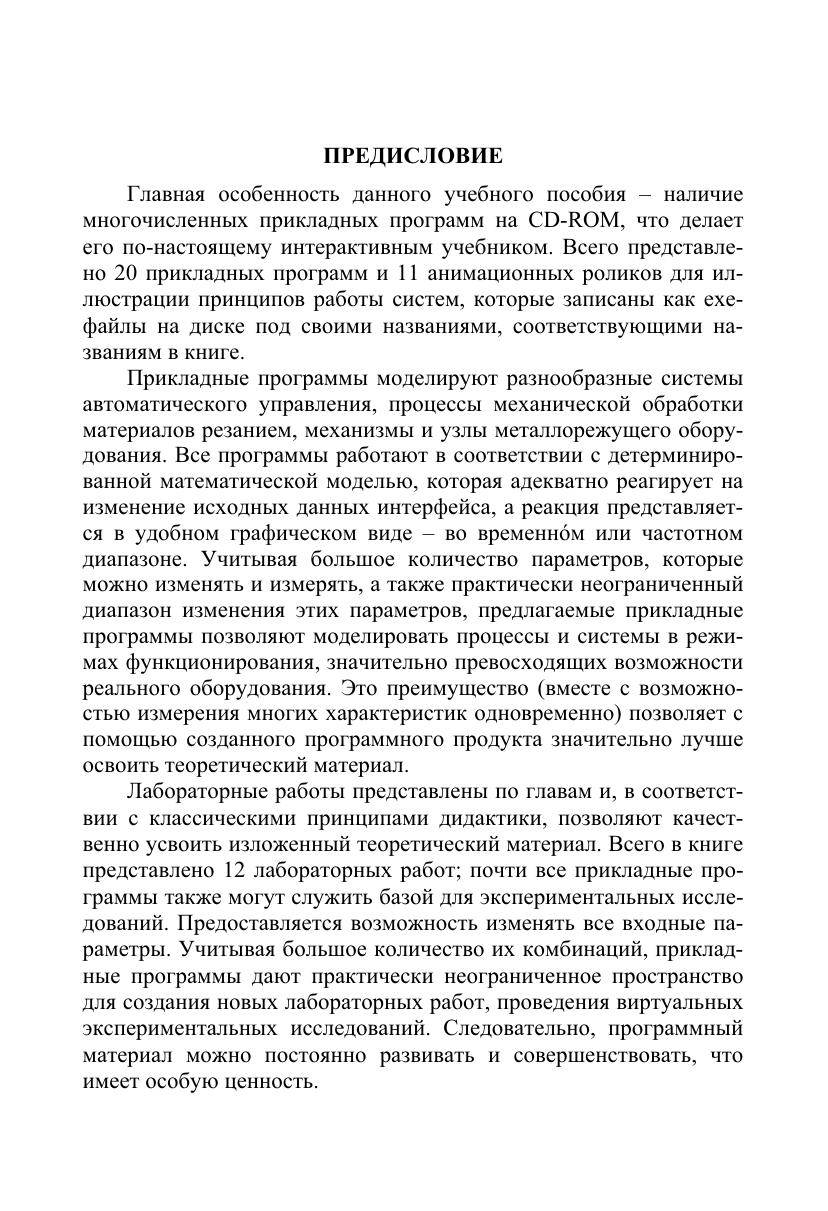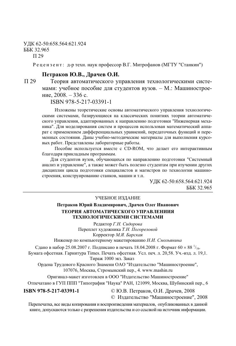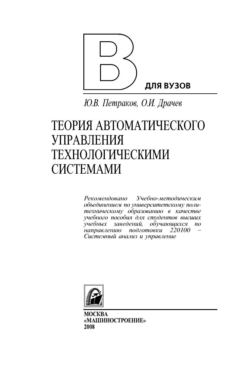 Изложены теоретические основы автоматического управления технологическими системами, базирующиеся на классических понятиях теории автоматического управления, адаптированных к направлению подготовки "Инженерная механика". Для моделирования систем и процессов использован математический аппарат с применением дифференциальных уравнений, передаточных функций и переменных состояния. Даны учебно-методические материалы для выполнения курсовых работ. Представлены лабораторные работы. Пособие используется вместе с CD-ROM, что делает его интерактивным благодаря прикладным программам. Для студентов вузов, обучающихся по направлению подготовки "Системный анализ и управление", а также может быть полезно студентам при изучении других дисциплин цикла подготовки специалистов и магистров по технологии машиностроения, конструированию станков, машин и т.п.