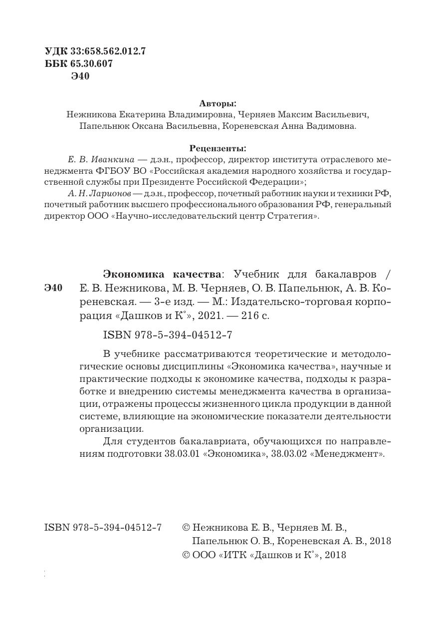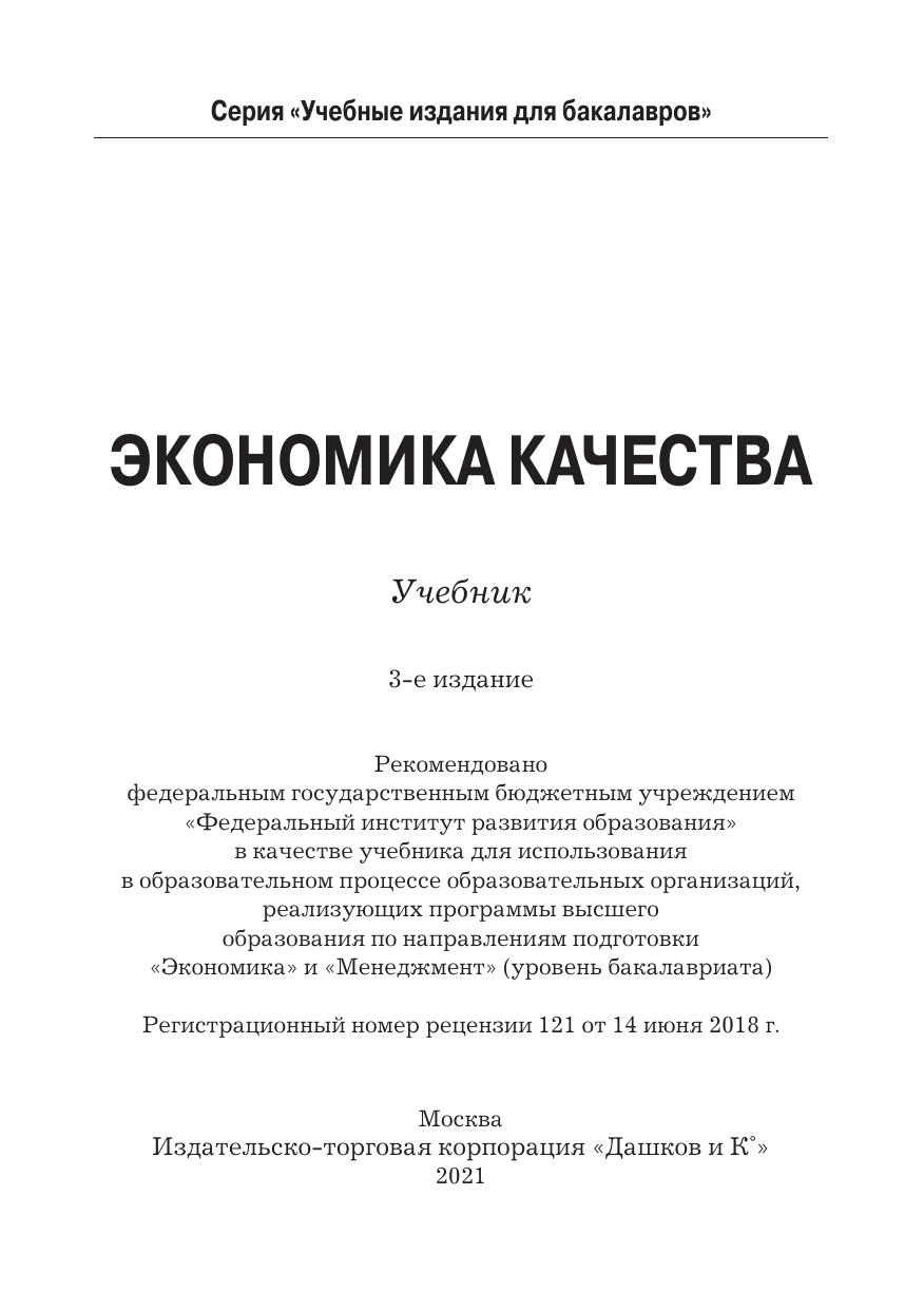 В учебнике рассматриваются теоретические и методологические основы дисциплины «Экономика качества», научные и практические подходы к экономике качества, подходы к разработке и внедрению системы менеджмента качества в организации, отражены процессы жизненного цикла продукции в данной системе, влияющие на экономические показатели деятельности организации. Для студентов бакалавриата, обучающихся по направлениям подготовки 38.03.01 «Экономика», 38.03.02 «Менеджмент».