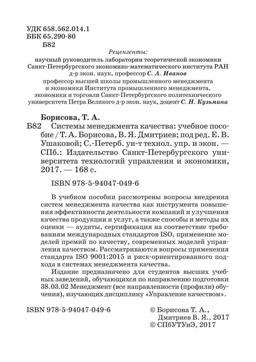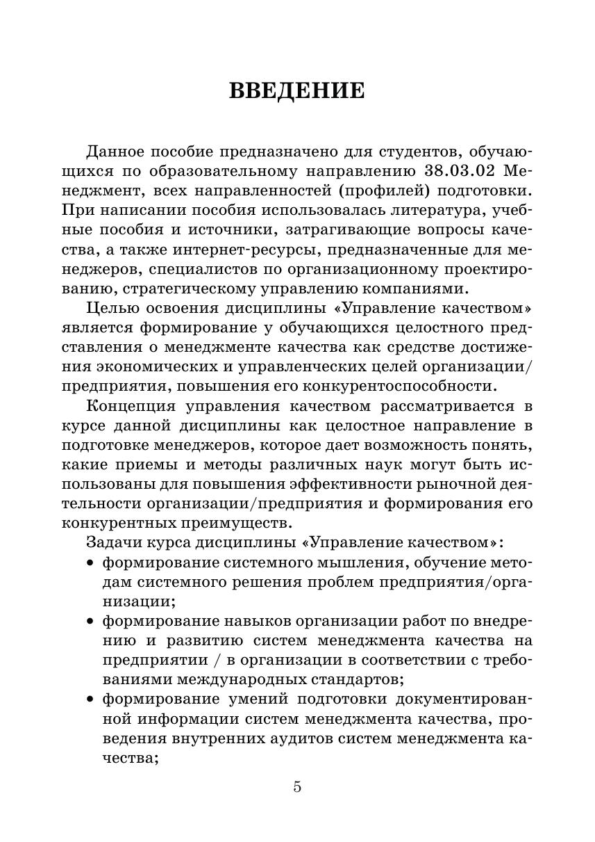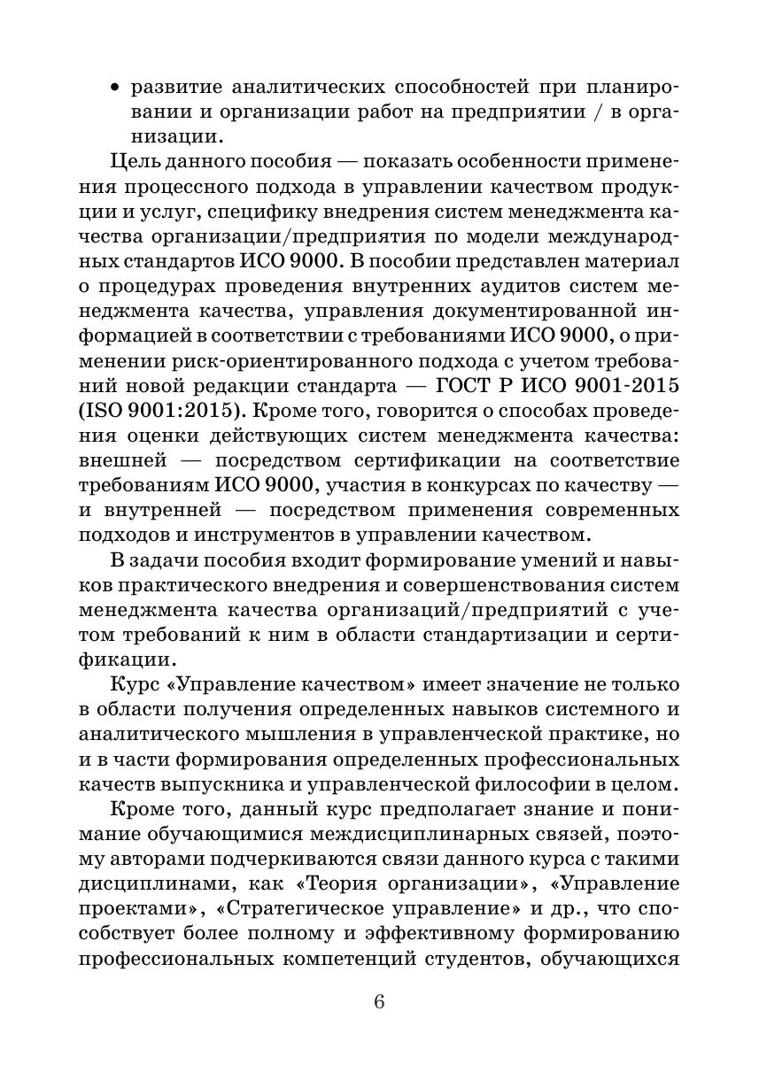 В учебном пособии рассмотрены вопросы внедрения систем менеджмента качества как инструмента повышения эффективности деятельности компаний и улучшения качества продукции и услуг, а также способы и методы их оценки — аудиты, сертификация на соответствие требованиям международных стандартов ISO, применение моделей премий по качеству, современных моделей управления качеством. Рассматриваются вопросы применения стандарта ISO 9001:2015 и риск-риентированного подхода в системах менеджмента качества. Издание предназначено для студентов высших учебных заведений, обучающихся по направлению подготовки 38.03.02 Менеджмент (все направленности (профили) обучения), изучающих дисцип лину «Управление качеством»