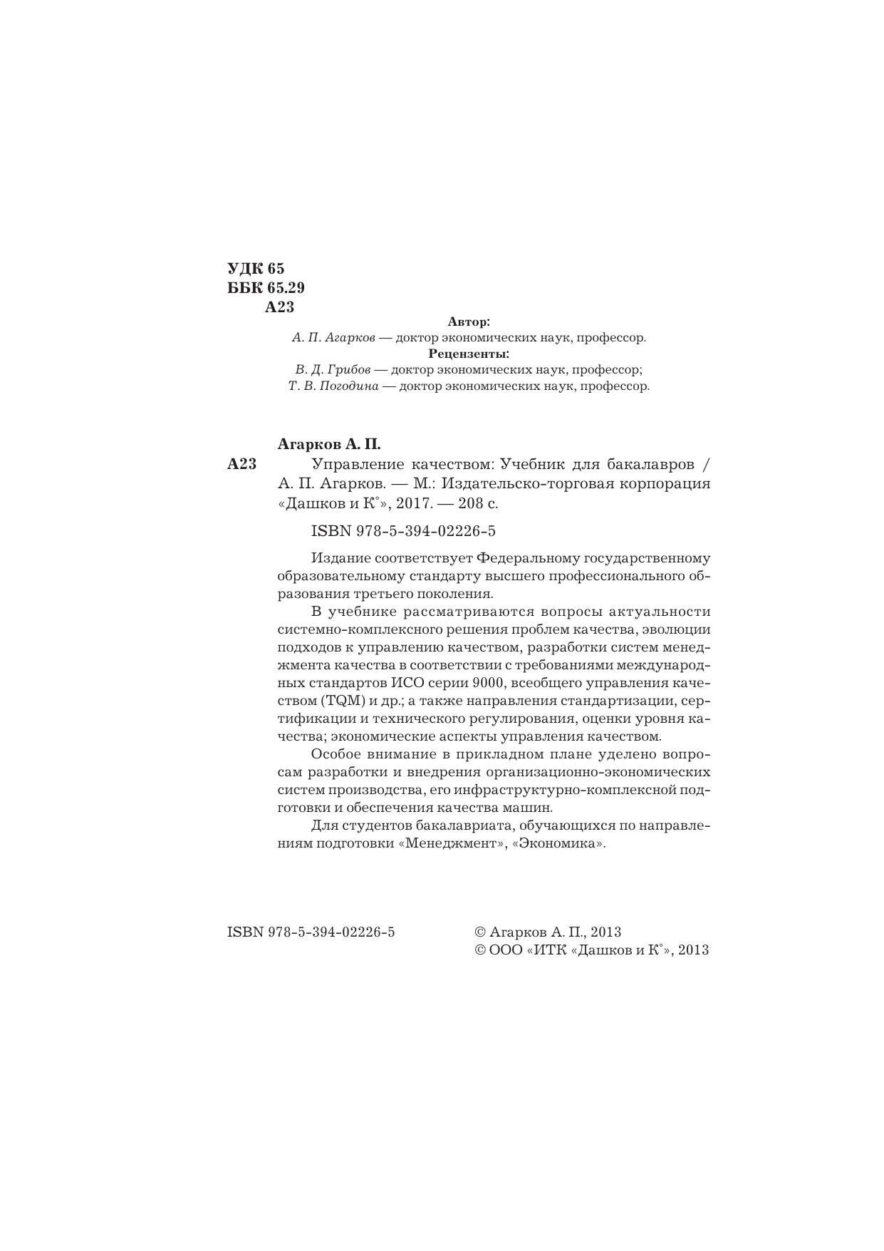 В учебнике рассматриваются вопросы актуальности системно-комплексного решения проблем качества, эволюции подходов к управлению качеством, разработки систем менеджмента качества в соответствии с требованиями международных стандартов ИСО серии 9000, всеобщего управления качеством (TQM) и др.; а также направления стандартизации, сертификации и технического регулирования, оценки уровня качества; экономические аспекты управления качеством.