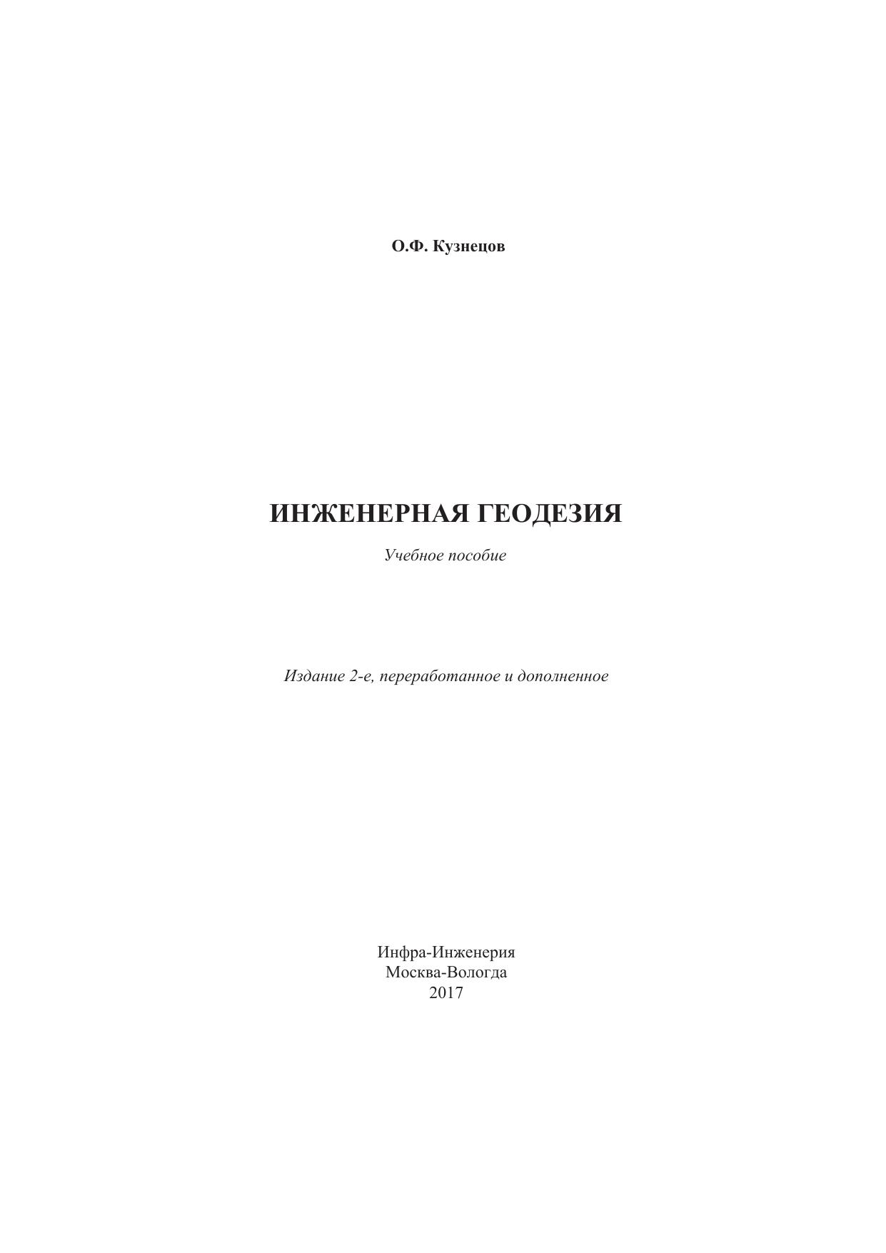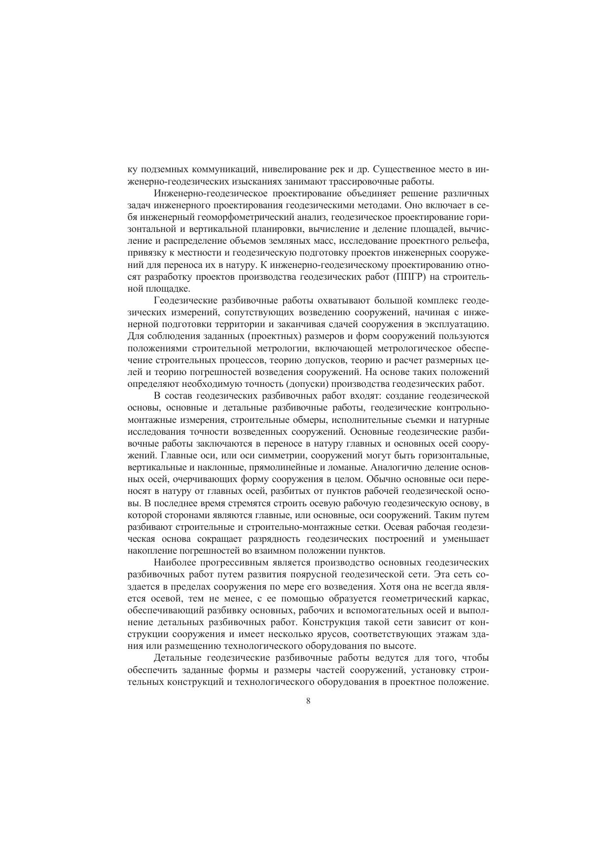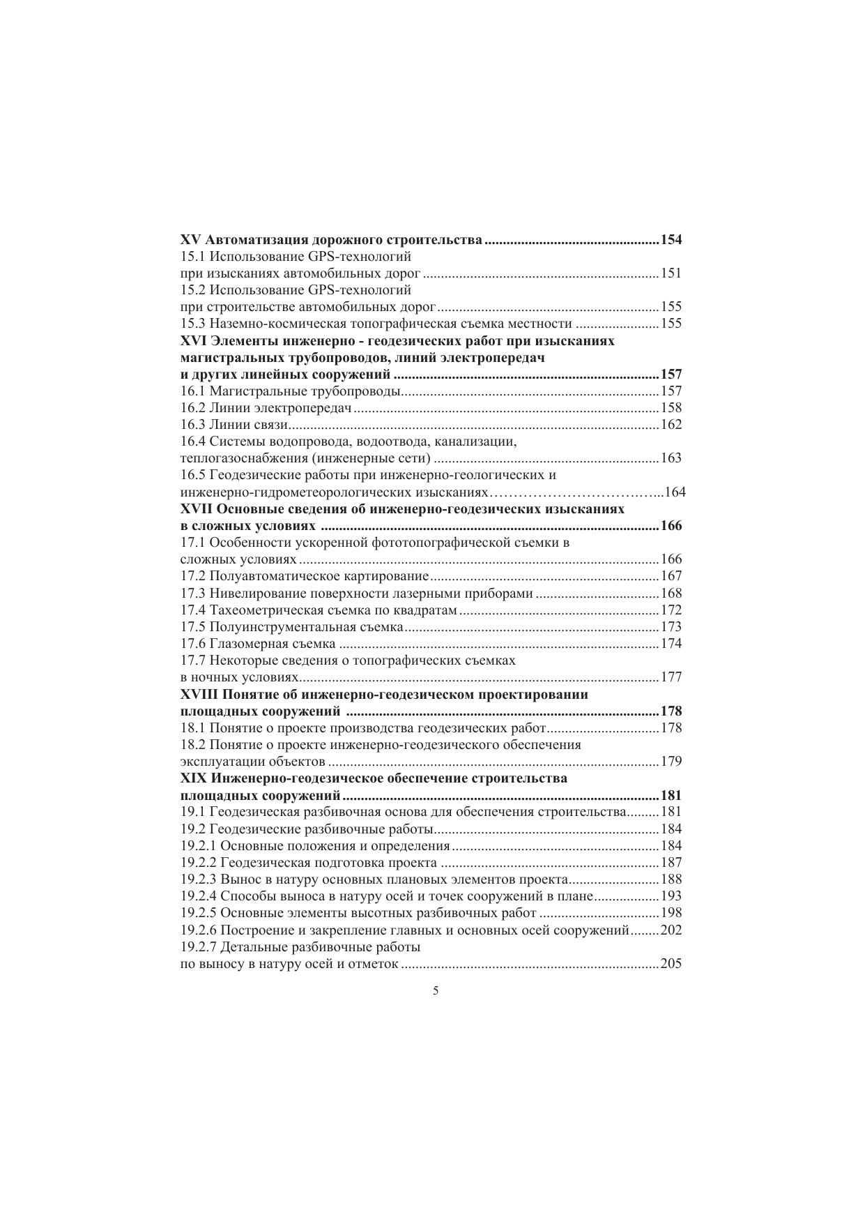 Изложены общие сведения по инженерной геодезии, инженерно-геодезическим изысканиям, проектированию, геодезическим разбивочным работам, инженерно-динамическим наблюдениям и организации инженерно-геодезических работ. Представлены современные средства измерений, применяемые при геодезических работах. Рассмотрены методы инженерно-геодезических измерений, вычислений и подробный анализ и оценка точности их результатов, выполняемых при изыскании, проектировании и строительстве железных и автомобильных дорог, при текущем содержании пути, при строительстве мостов, тоннелей, зданий, при строительстве и съемке подземных коммуникаций. Описаны прогрессивные технологии съемок местности с использованием современного сканирующего оборудования, электронной тахеометрии, спутниковых систем позиционирования ОР8-технологий.