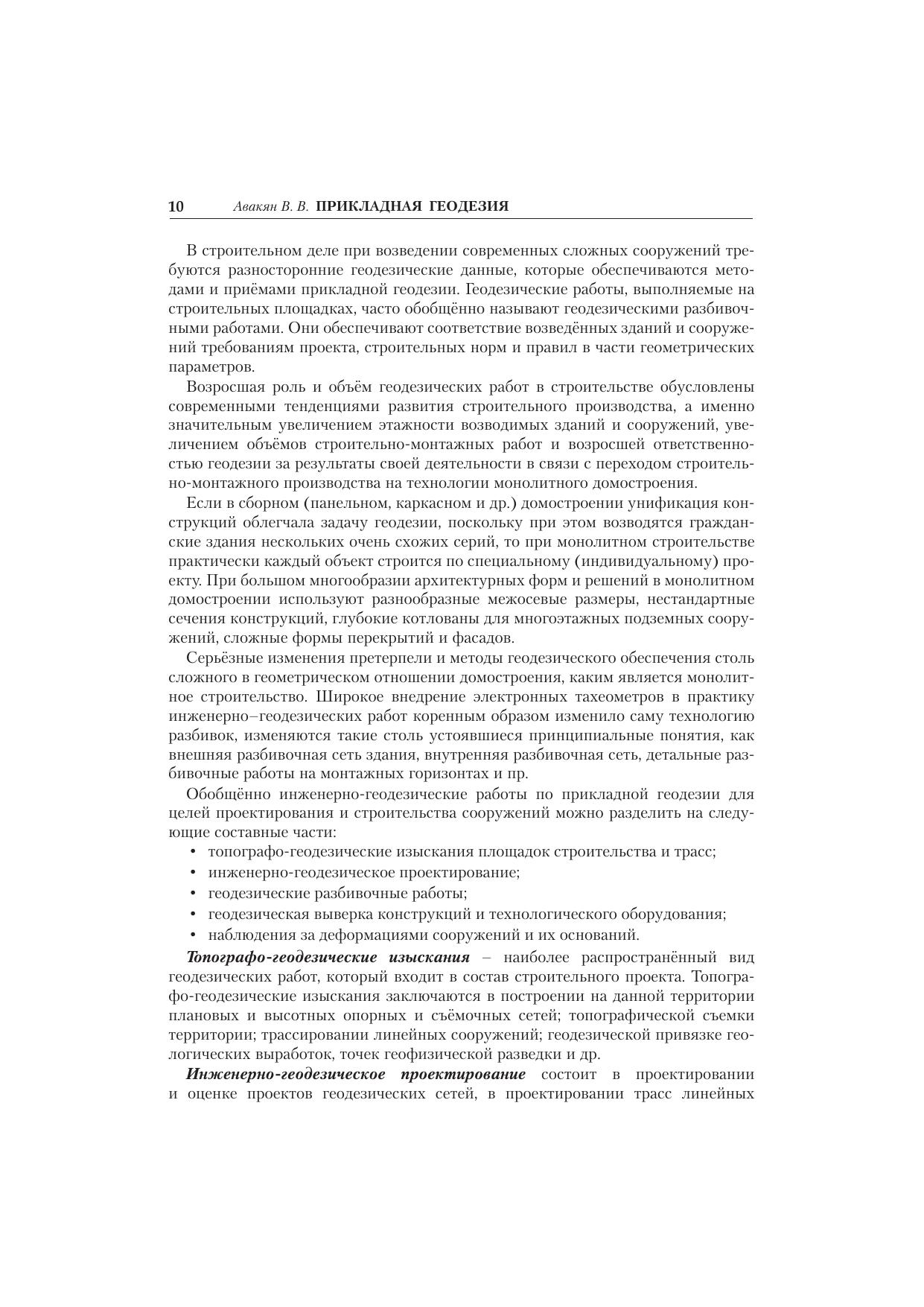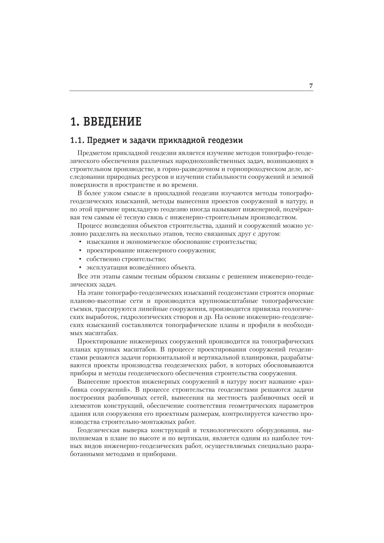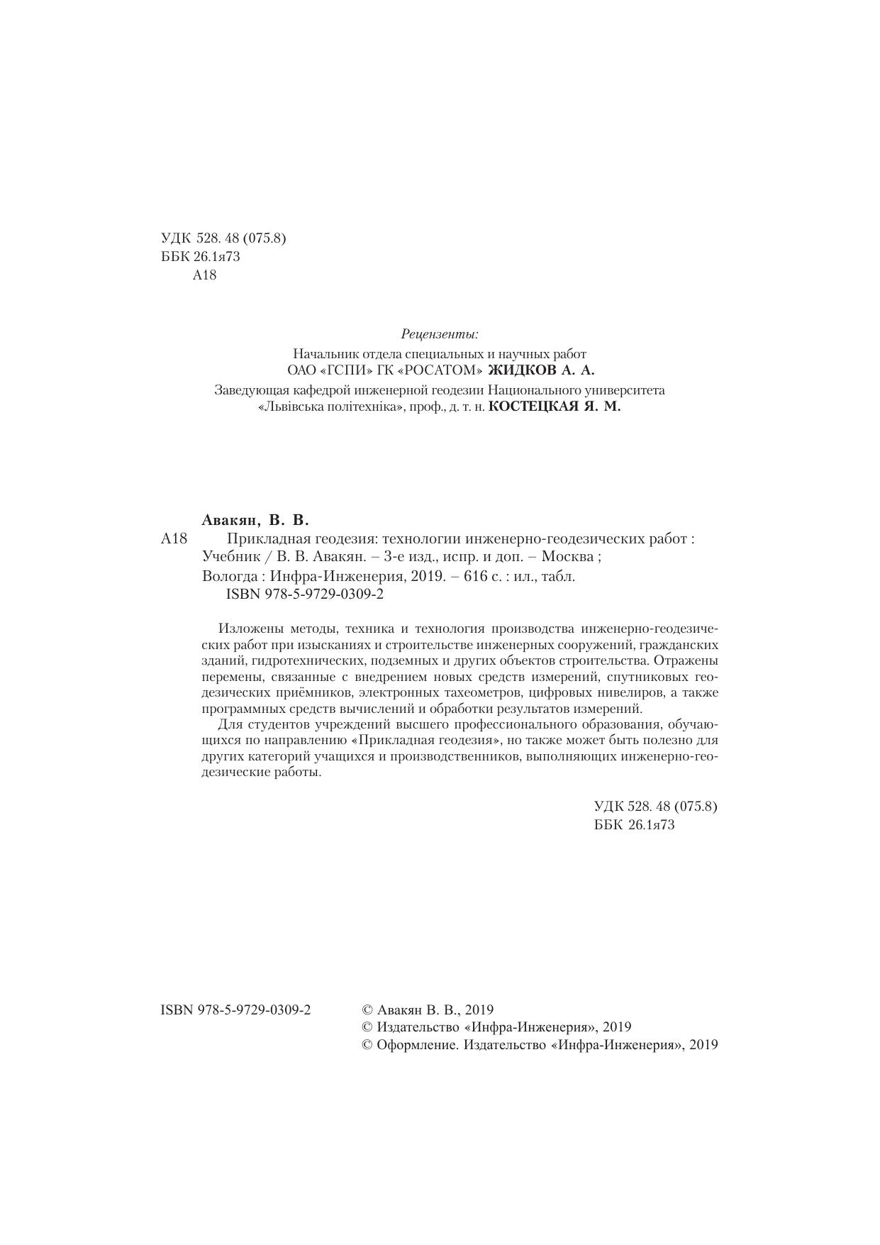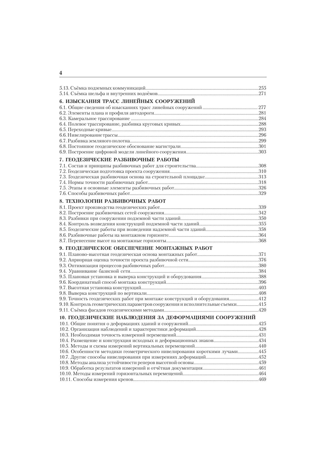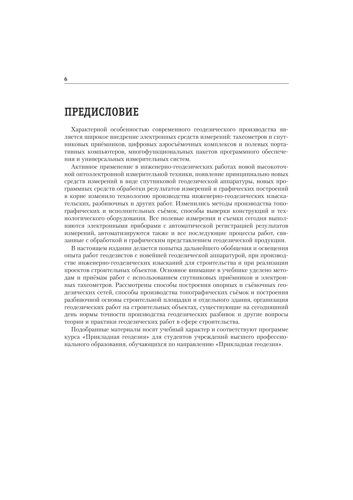 Изложены методы, техника и технология производства инженерно-геодезических работ при изысканиях и строительстве инженерных сооружений, гражданских зданий, гидротехнических, подземных и других объектов строительства. Отражены перемены, связанные с внедрением новых средств измерений, спутниковых геодезических приёмников, электронных тахеометров, цифровых нивелиров, а также программных средств вычислений и обработки результатов измерений.