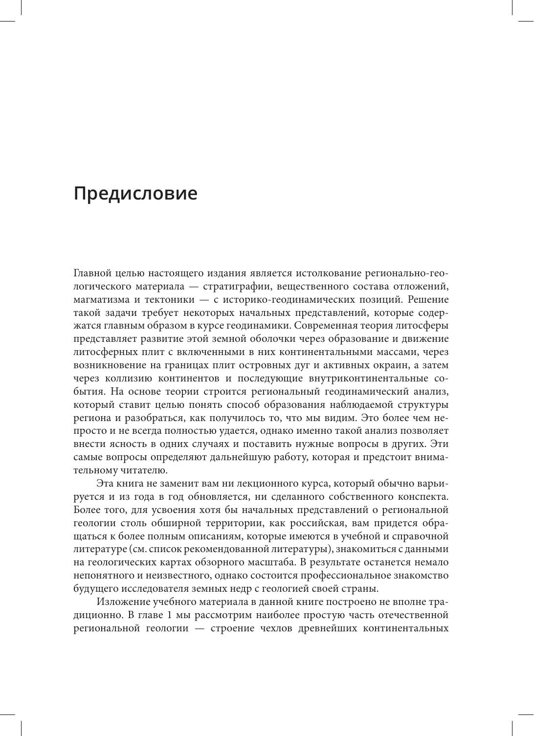 Издание посвящено региональной геологии России. В нем дается толкование основных терминов, употребляемых в современном анализе общих геодинамических процессов и возникших в их результате объектов. Изложение материала построено в соответствии со степенью сложности: от чехлов древних платформ к синхронным им коллизионным поясам рифейского и фанерозойского возраста, а затем к мел-кайнозойским окраинам Евразии, где продолжается аккреция континентальной коры. Представлены основные породные комплексы, история их формирования и геологическая позиция главнейших минеральных ресурсов страны. Рассмотрены строение и динамика формирования раннедокембрийской земной коры в пределах России и образование современного Арктического океанского бассейна.