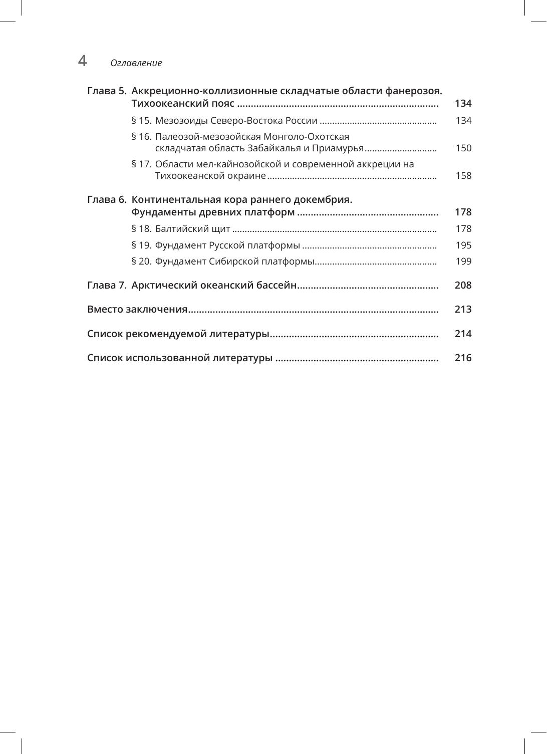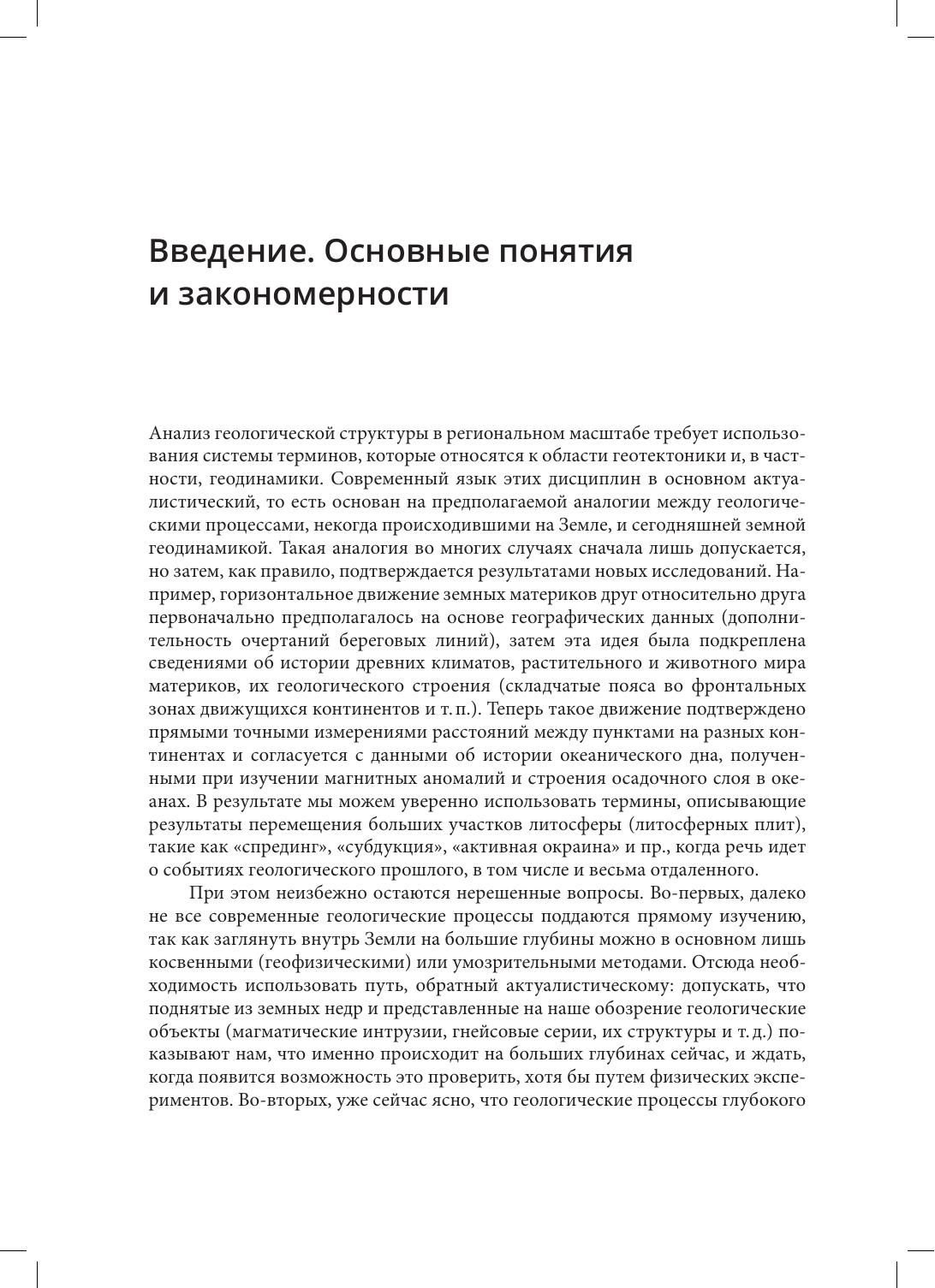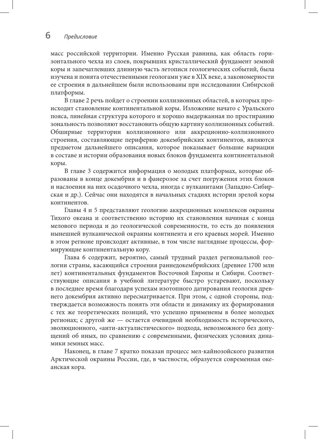 Издание посвящено региональной геологии России. В нем дается толкование основных терминов, употребляемых в современном анализе общих геодинамических процессов и возникших в их результате объектов. Изложение материала построено в соответствии со степенью сложности: от чехлов древних платформ к синхронным им коллизионным поясам рифейского и фанерозойского возраста, а затем к мел-кайнозойским окраинам Евразии, где продолжается аккреция континентальной коры. Представлены основные породные комплексы, история их формирования и геологическая позиция главнейших минеральных ресурсов страны. Рассмотрены строение и динамика формирования раннедокембрийской земной коры в пределах России и образование современного Арктического океанского бассейна. Предназначено для всех интересующихся геологией России. Издание можжет быть рекомендовано в качестве учебного пособия студентам бакалавриата, обучающимся по направлению "Геология", может быть полезно студентам, изучающим общие вопросы геологии и геодинамики.