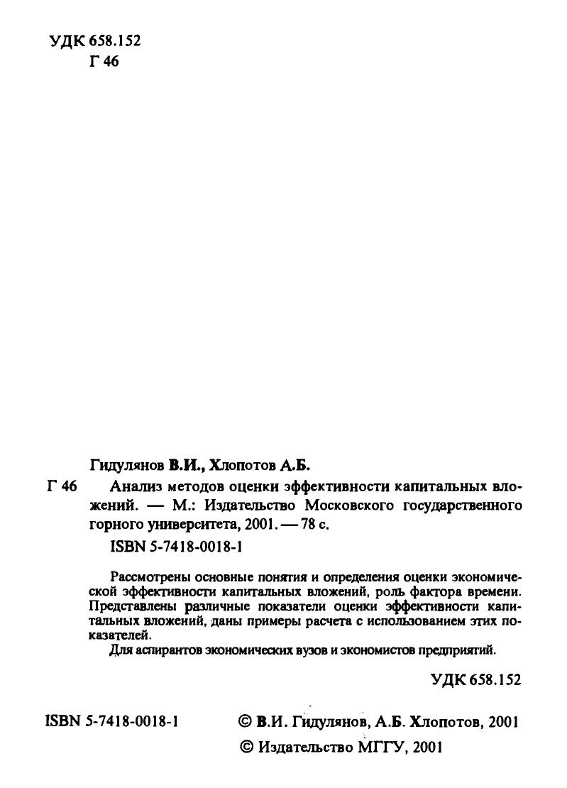 Рассмотрены основные понятия и определения оценки экономической эффективности капитальных вложений, роль фактора времени. Представлены различные показатели оценки эффективности капитальных вложений, даны примеры расчета с использованием этих показателей. Для аспирантов экономических вузов и экономистов предприятий.