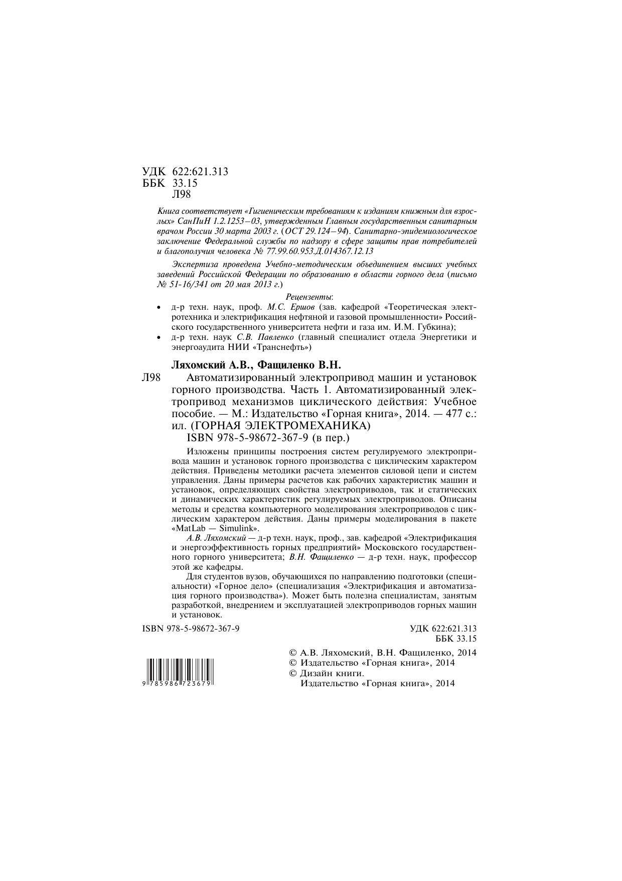 Изложены принципы построения систем регулируемого электропривода машин и установок горного производства с циклическим характером действия. Приведены методики расчета элементов силовой цепи и систем управления. Даны примеры расчетов как рабочих характеристик машин и установок, определяющих свойства электроприводов, так и статических и динамических характеристик регулируемых электроприводов. Описаны методы и средства компьютерного моделирования электроприводов с циклическим характером действия. Даны примеры моделирования в пакете «MatLab — Simulink».