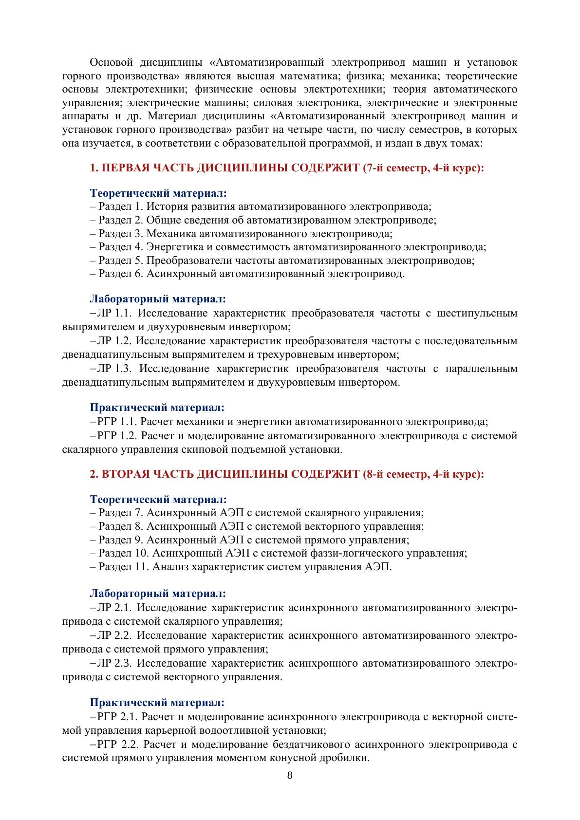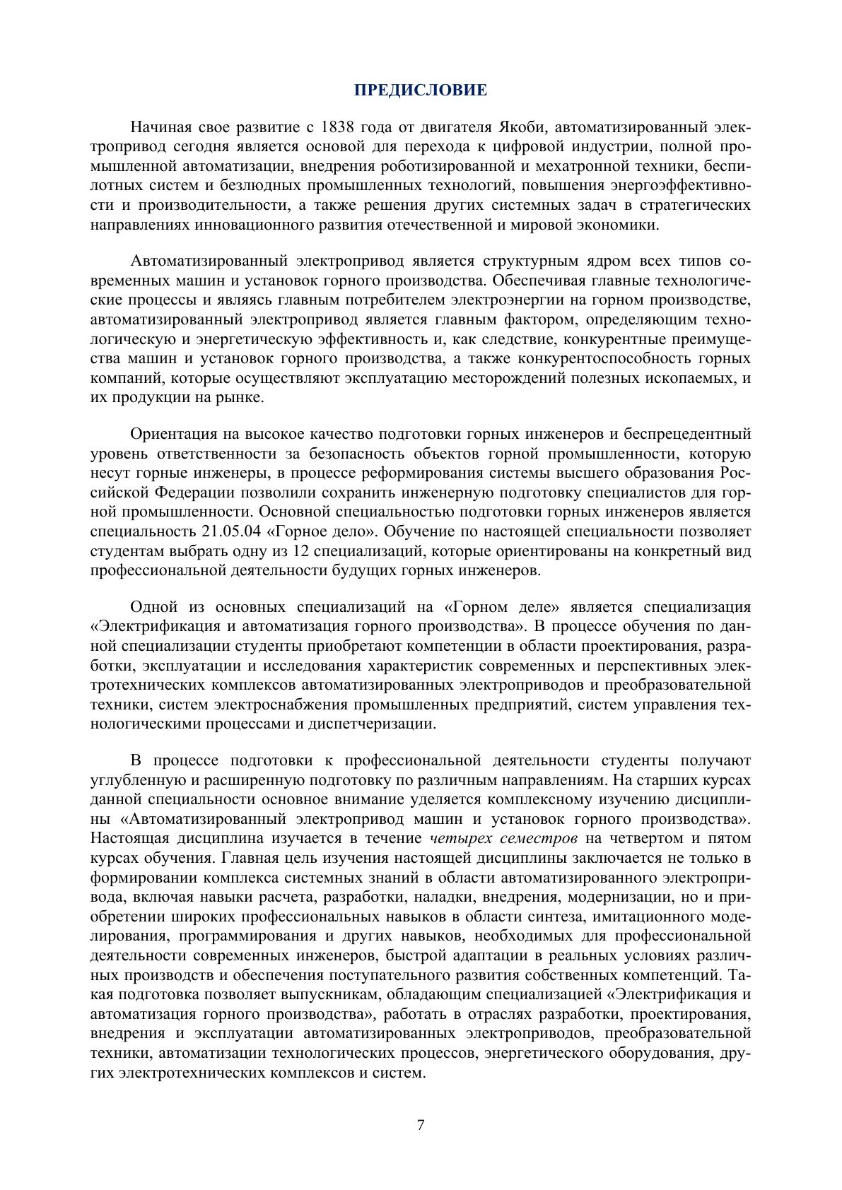 В первом томе учебника рассмотрены история развития автоматизированного электропривода, общие сведения об электроприводах, основные вопросы механики, энергетики и совместимости электропривода. Рассмотрены преобразователи частоты автоматизированных электроприводов различных структур, а также основные типы модуляционных систем управления: системы фазной, синусоидальной, предмодуляции, векторной, стохастической, релейной и автомодуляции. Рассмотрены автоматизированные электроприводы с асинхронными двигателями и различными типами двигательных систем управления, а именно, системами параметрического, скалярного, векторного, прямого и фаззи-логического управления. Выполнен анализ и определены сферы применения преобразователей частоты и асинхронных электроприводов с различными типами систем управления в горной промышленности. К каждому разделу учебника приведены перечни основных терминов и контрольные вопросы. Учебник предназначен для высших учебных заведений горнотехнического профиля, в первую очередь осуществляющих подготовку инженеров по специальности «Горное дело», специализации «Электрификация и автоматизация горного производства», а также студентов, аспирантов и специалистов, обучающихся и работающих в области приводной и преобразовательной техники.