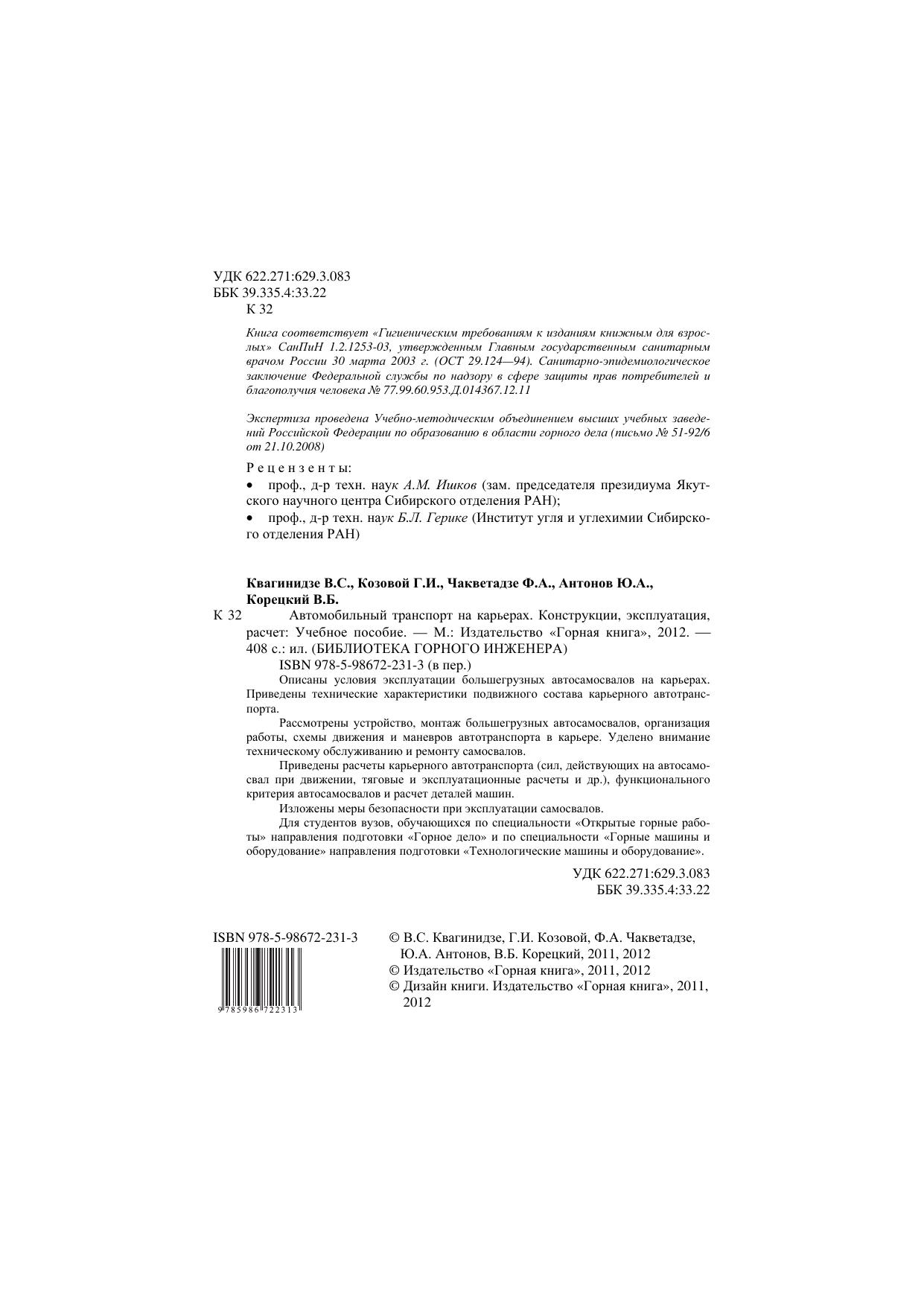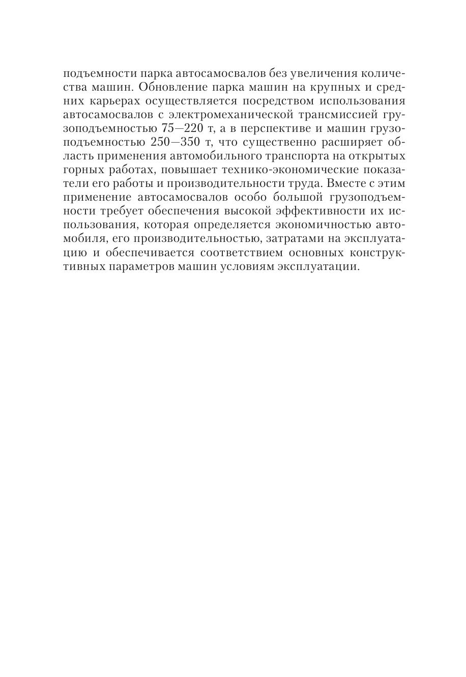 Описаны условия эксплуатации большегрузных автосамосвалов на карьерах. Приведены технические характеристики подвижного состава карьерного автотранспорта. Рассмотрены устройство, монтаж большегрузных автосамосвалов, организация работы, схемы движения и маневров автотранспорта в карьере. Уделено внимание техническому обслуживанию и ремонту самосвалов. Приведены расчеты карьерного автотранспорта (сил, действующих на автосамосвал при движении, тяговые и эксплуатационные расчеты и др.), функционального критерия автосамосвалов и расчет деталей машин. Изложены меры безопасности при эксплуатации самосвалов. Для студентов вузов, обучающихся по специальности «Открытые горные работы» направления подготовки «Горное дело» и по специальности «Горные машины и оборудование» направления подготовки «Технологические машины и оборудование»