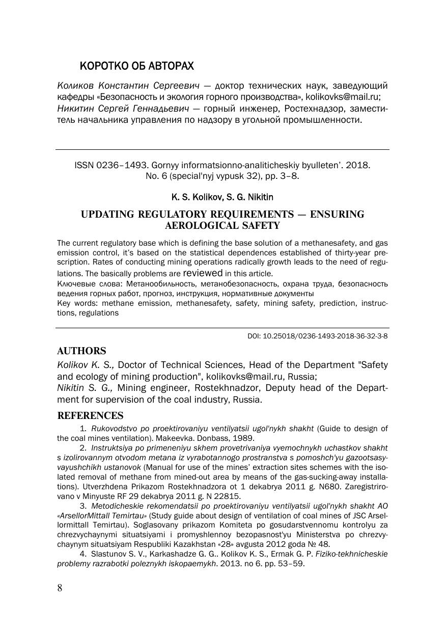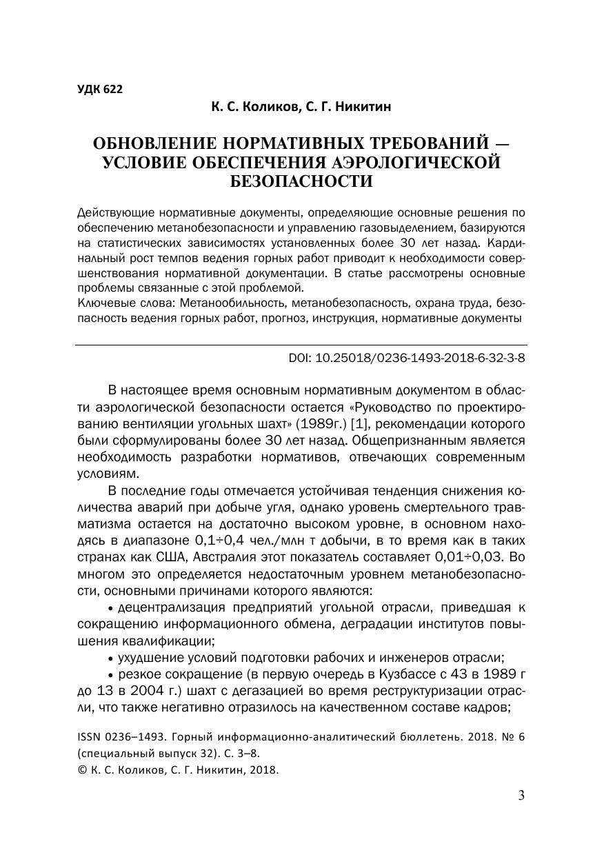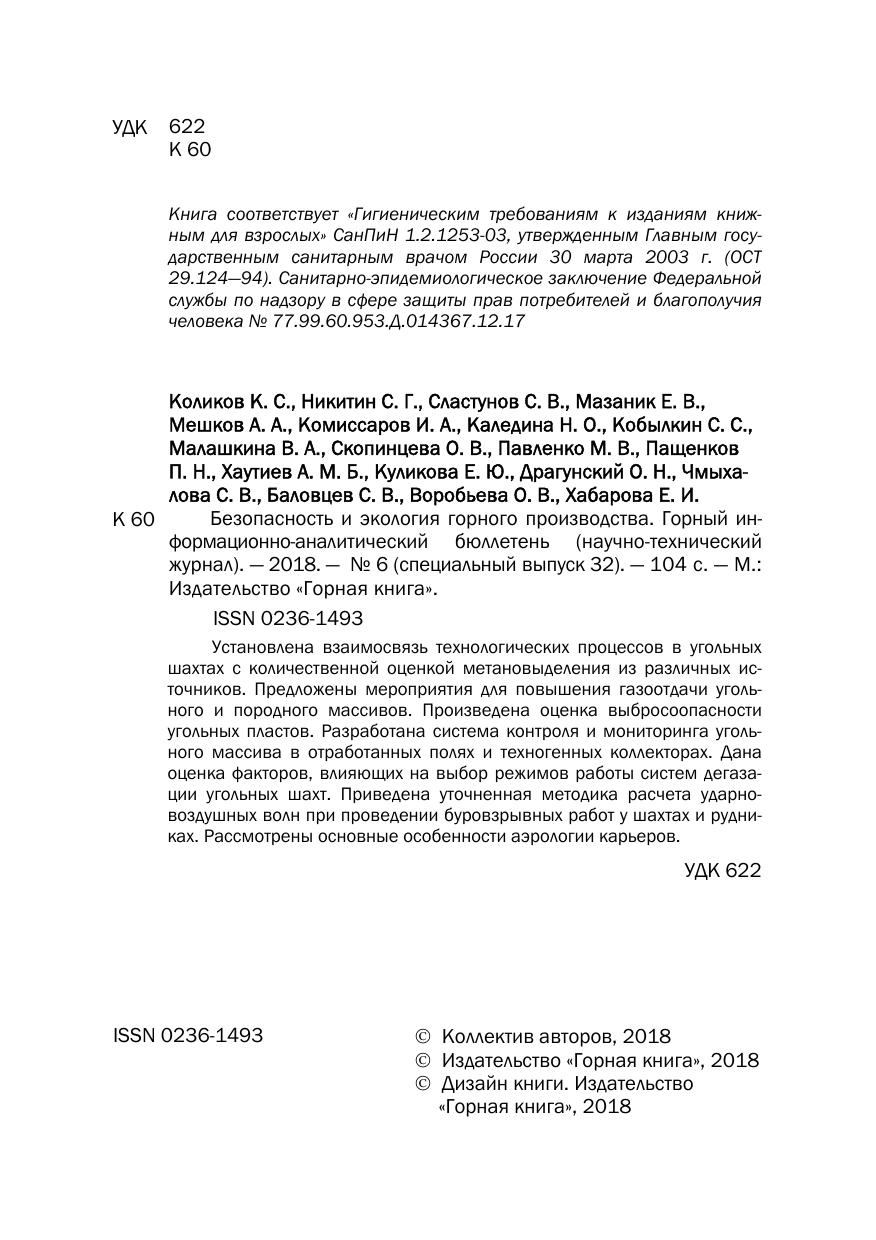 Безопасность и экология горного производства. Горный информационно-аналитический бюллетень (научно-технический журнал). № 6