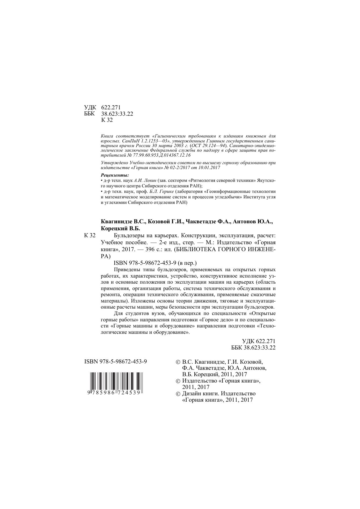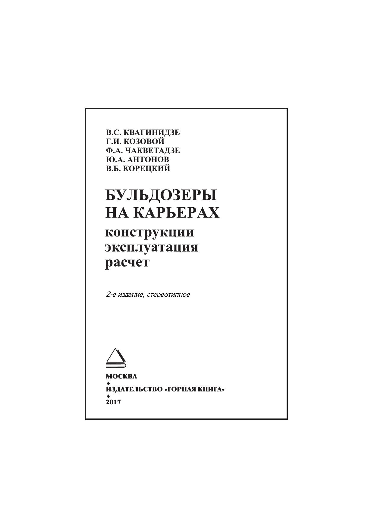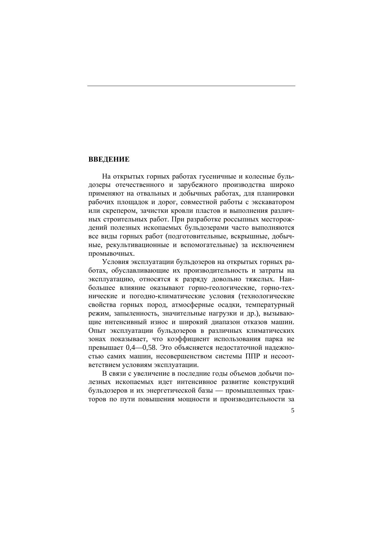 Приведены типы бульдозеров, применяемых на открытых горных работах, их характеристики, устройство, конструктивное исполнение узлов и основные положения по эксплуатации машин на карьерах (область применения, организация работы, система технического обслуживания и ремонта, операции технического обслуживания, применяемые смазочные материалы). Изложены основы теории движения, тяговые и эксплуатационные расчеты машин, меры безопасности при эксплуатации бульдозеров. Для студентов вузов, обучающихся по специальности «Открытые горные работы» направления подготовки «Горное дело» и по специальности «Горные машины и оборудование» направления подготовки «Технологические машины и оборудование».