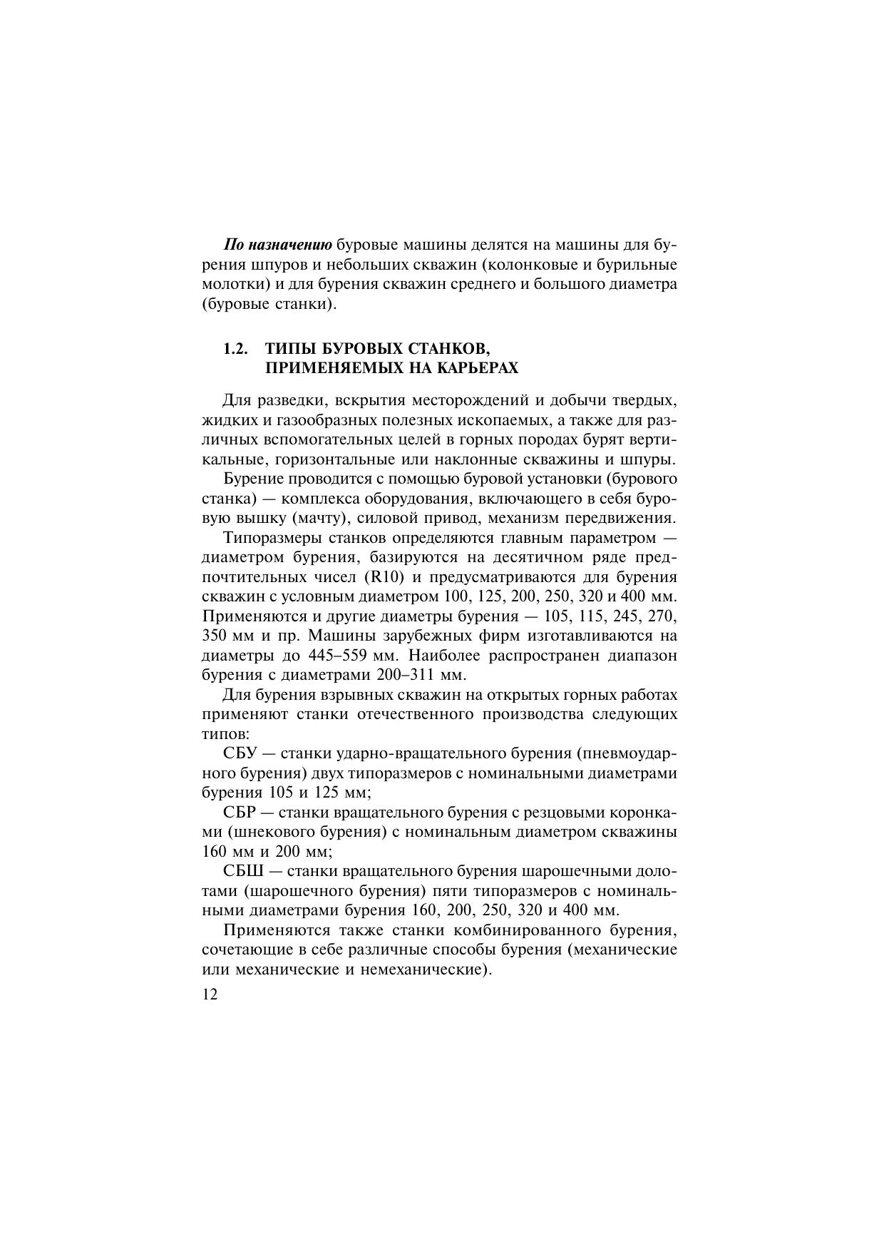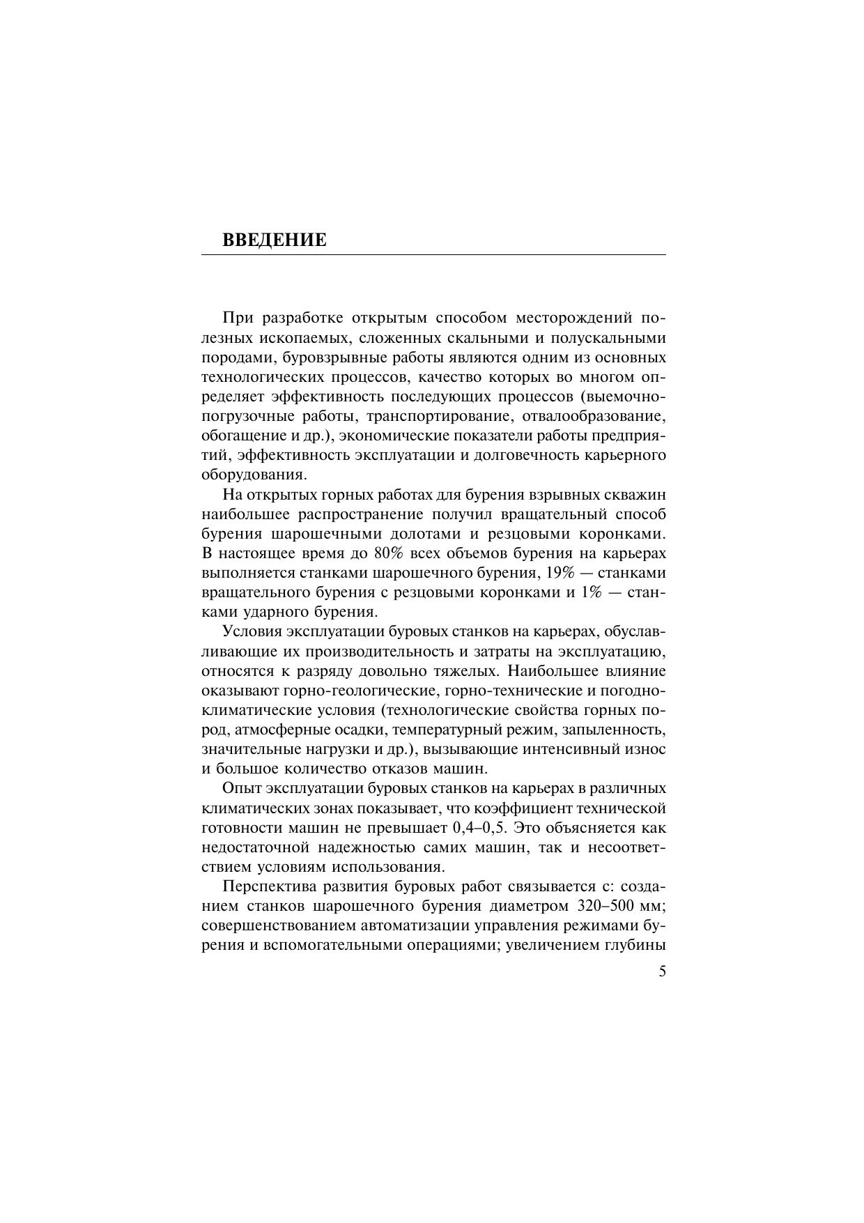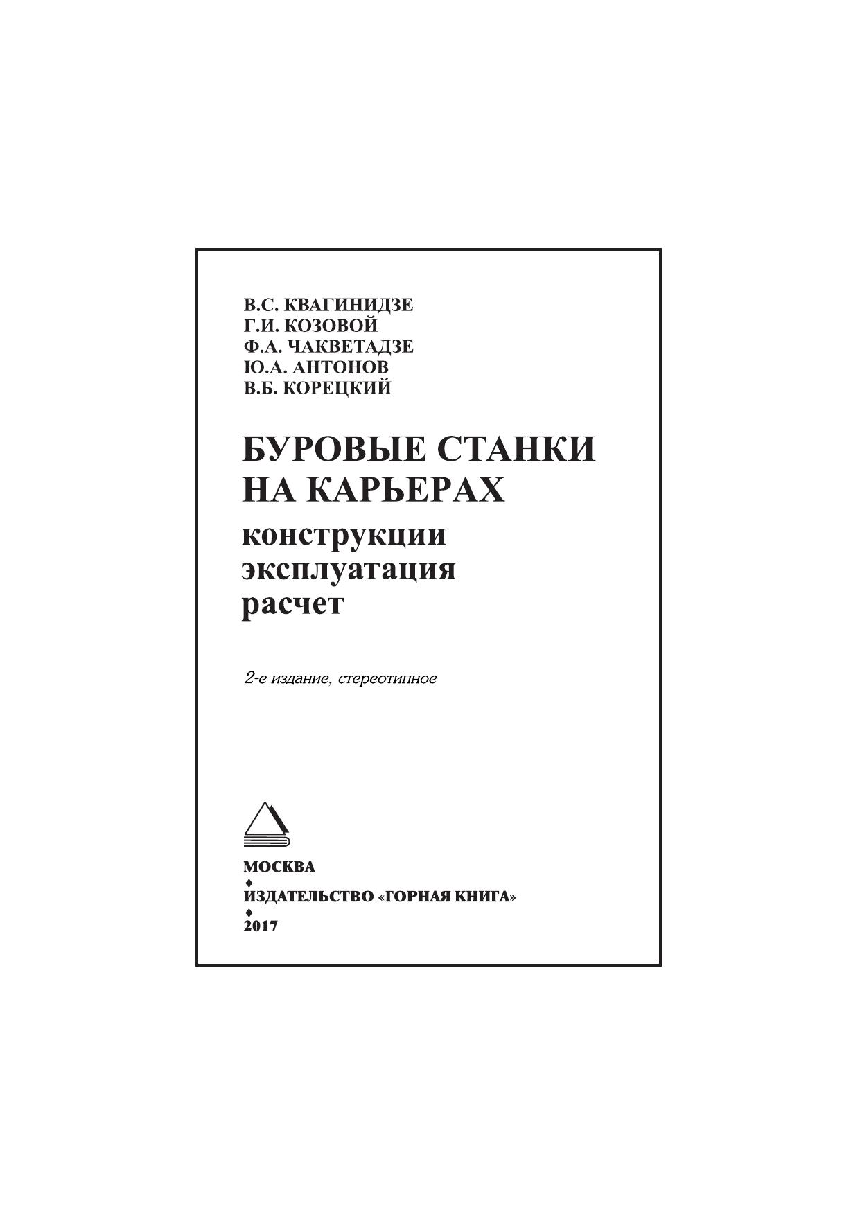 Приведены типы буровых станков, применяемых на открытых горных работах, их характеристики, утсройство, конструктивное исполнение узлов и инструмента, основные положения по эксплуатации машин на карьерах (область применения, монтаж, организация работы, система технического обслуживания, применяемые смазочные материалы). Изложены основы теории бурения, эсплуатационные расчеты, расчеты узлов и систем буровых станков, деталей машин, меры безопасности при эксплуатации. Для студентов вузов, обучающихся по специальности «Открытые горные работы» направления подготовки «Горное дело» и по специальности «Горные машины и оборудование» направления подготовки «Технологические машины и оборудование». Может быть полезно инженерно-техническим и научным работникам организаций, связанным с проектированием, изготовлением и эксплуатацией бурового оборудования.