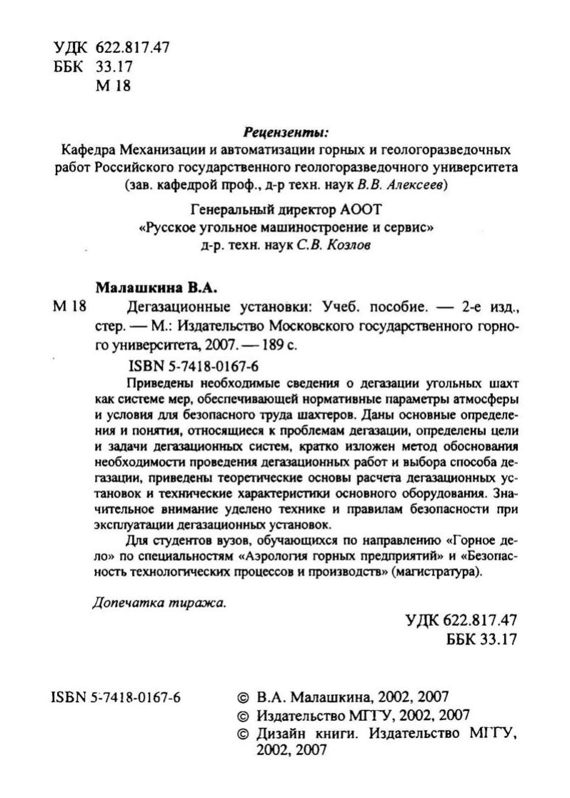 Приведены необходимые сведения о дегазации угольных шахт как системе мер, обеспечивающей нормативные параметры атмосферы и условия для безопасного труда шахтеров. Даны основные определения и понятия, относящиеся к проблемам дегазации, определены цели и задачи дегазационных систем, кратко изложен метод обоснования необходимости проведения дегазационных работ и выбора способа дегазации, приведены теоретические основы расчета дегазационных установок и технические характеристики основного оборудования. Значительное внимание уделено технике и правилам безопасности при эксплуатации дегазационных установок. Для студентов вузов, обучающихся по направлению «Горное дело» по специальностям «Аэрология горных предприятий» и «Безопасность технологических процессов и производств» (магистратура).